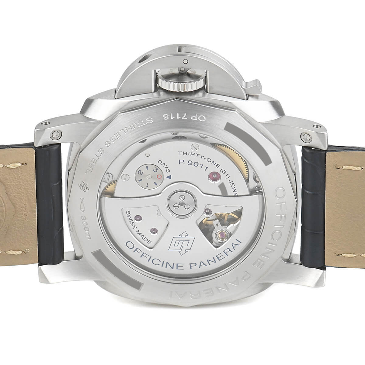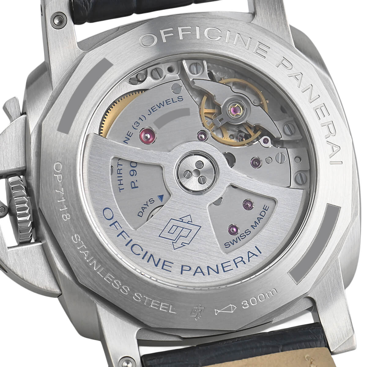 デイト表示、GMT、秒針ゼロリセット機能に加え、裏側にはパワーリザーブインジケーターを備えた自社製キャリバー「P.9011」を搭載しています。