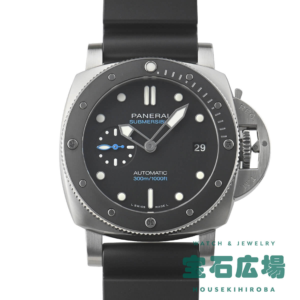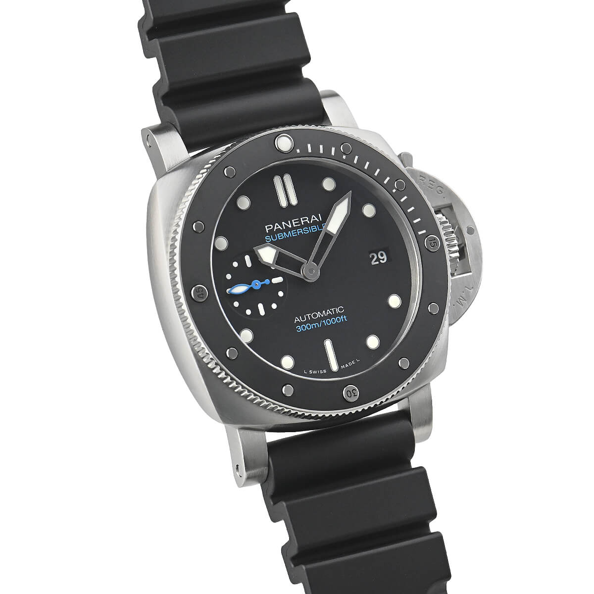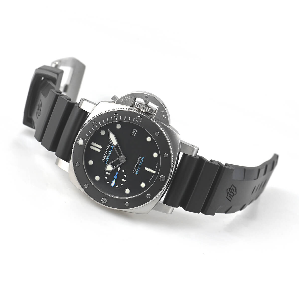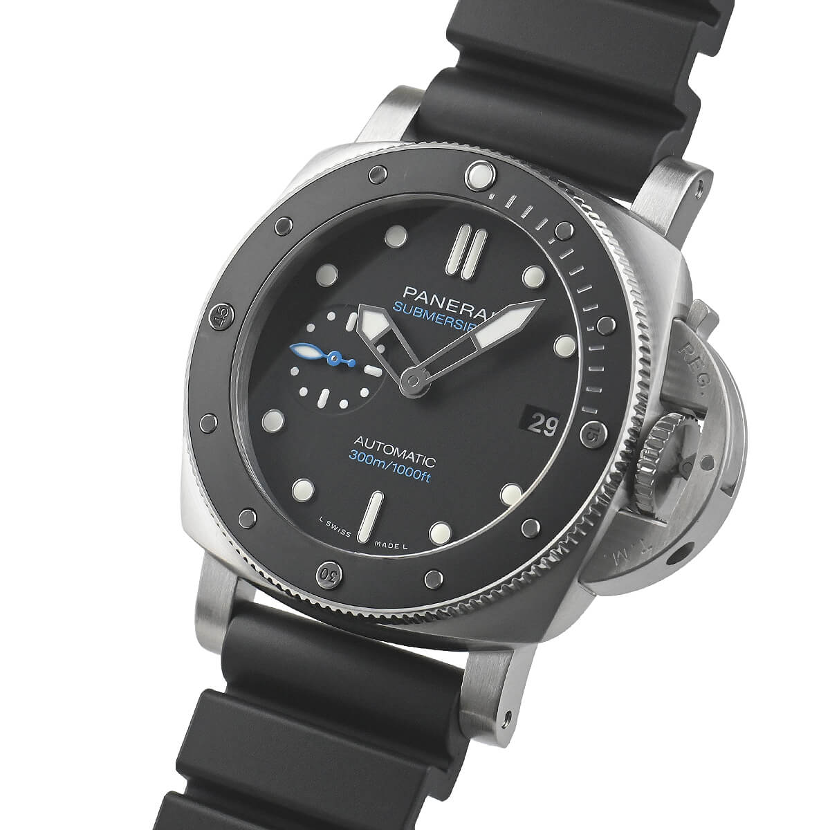 W番“2020年製”【PAM00683】サブマーシブルが入荷しました。パネライ独特のリューズプロテクターや300m防水など歴代のサブマーシブルの特徴はそのままでベゼルには耐傷性・耐久性に優れたブラックセラミックを採用しています。