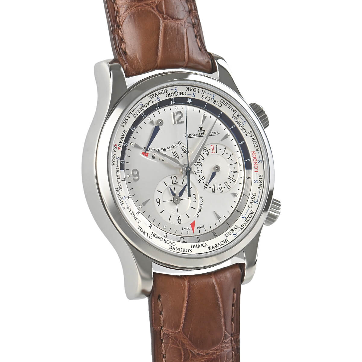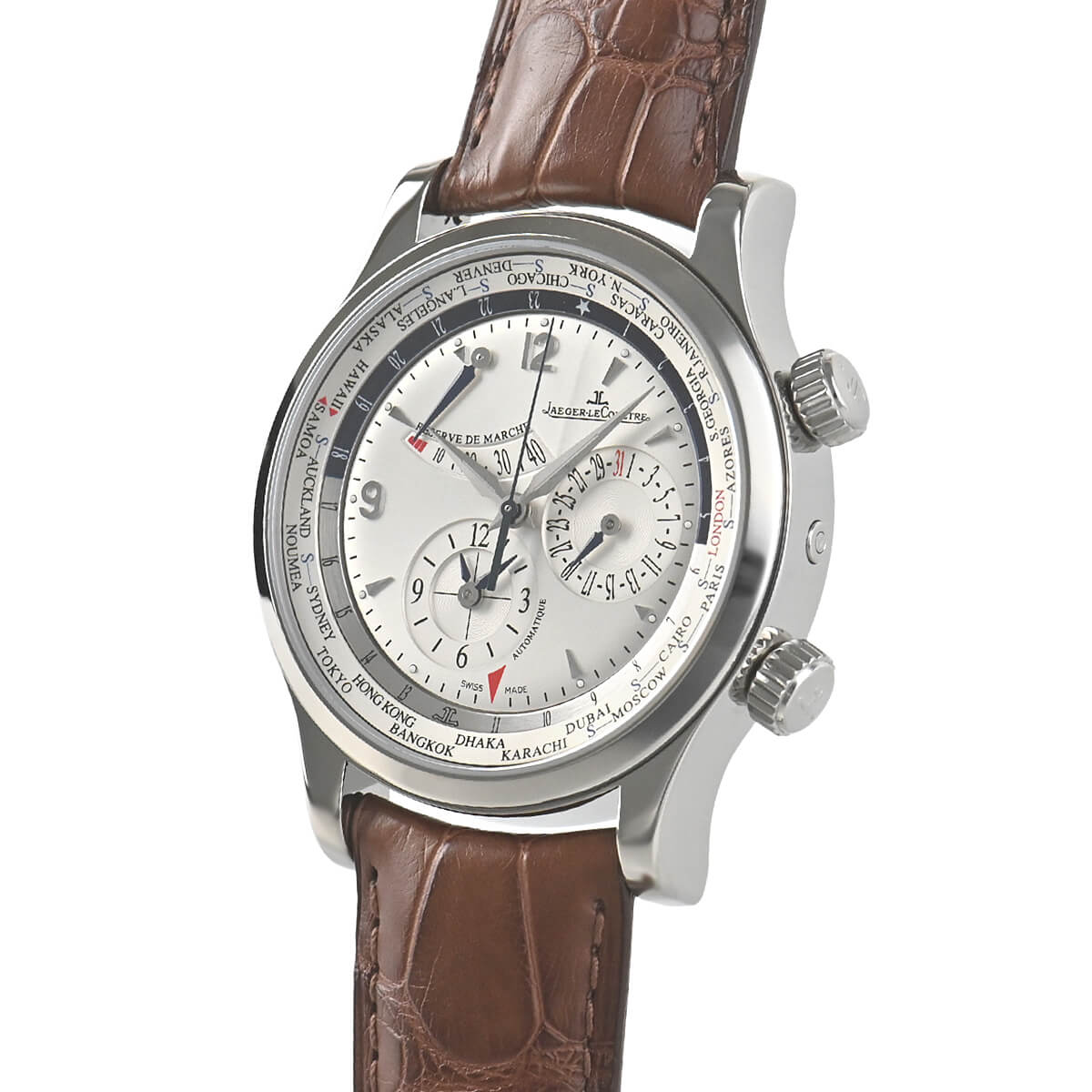 世界24都市の時刻を回転式インナーベゼルで表示するワールドタイム機能を搭載した「マスターワールドジオグラフィーク」。ワールドタイムに優先時間帯表示、パワーリザーブインジケーターに、日付表示と非常に多機能ながら使いやすさと上品なデザインが特徴です。