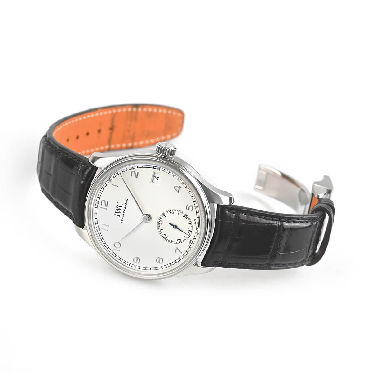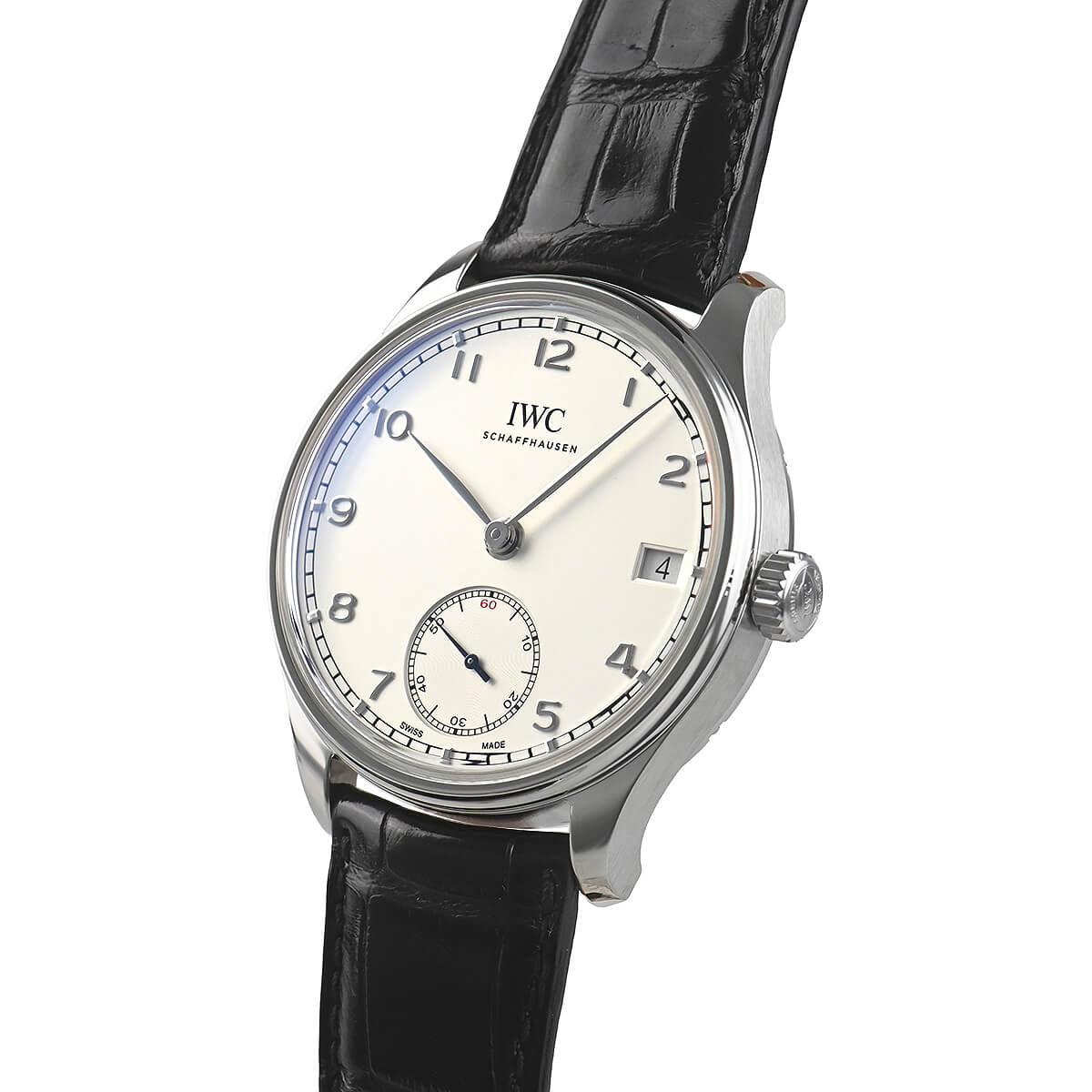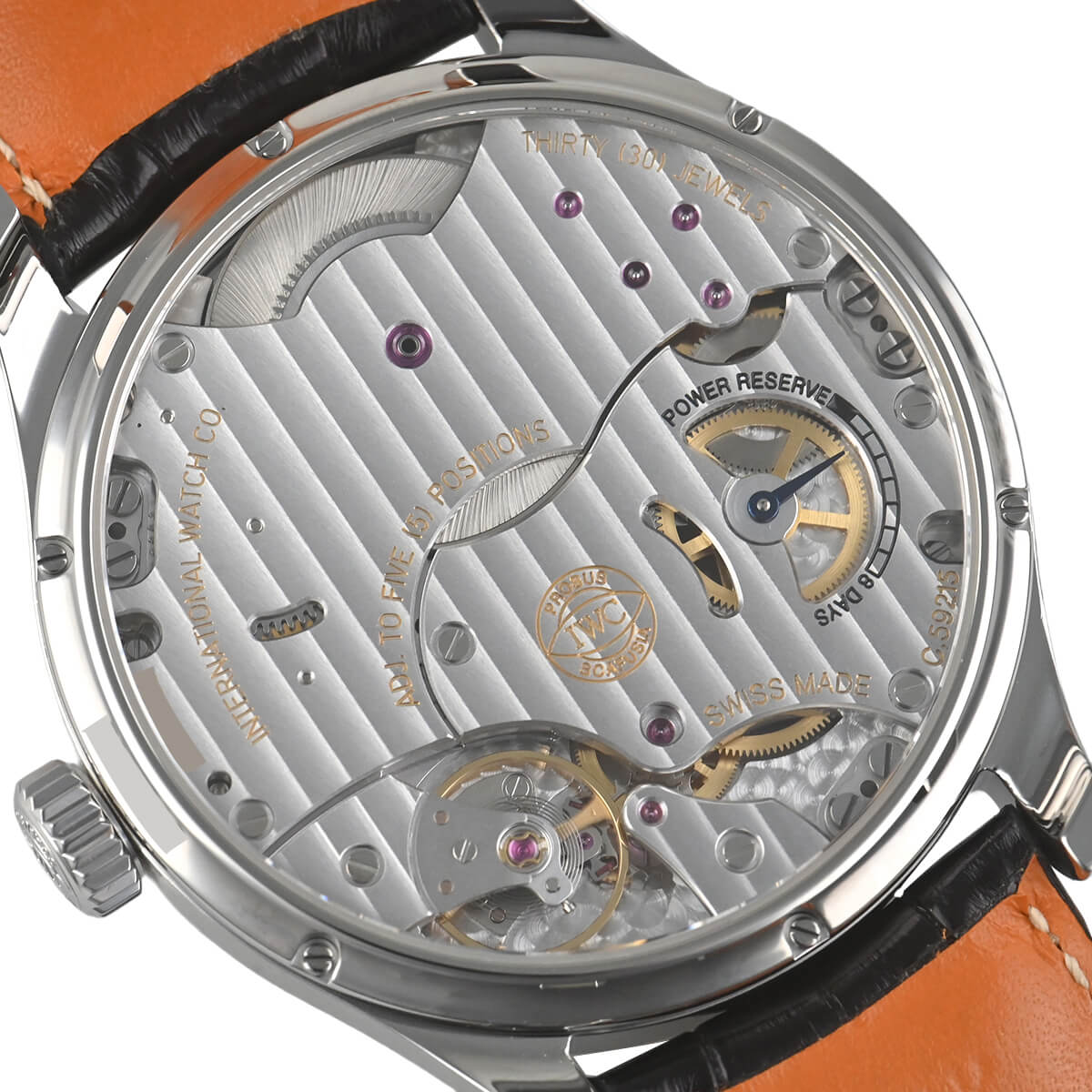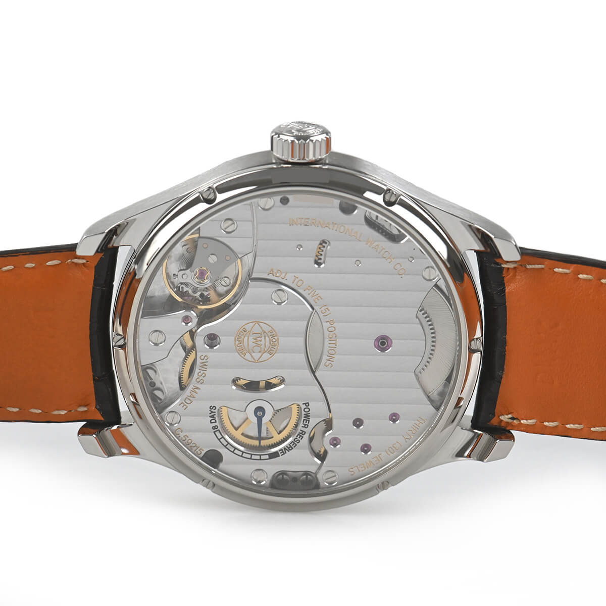 8日間パワーリザーブ機能の自社製ムーブメントCal.59215を搭載した「ポルトギーゼ ハンドワインド8デイズ」。先に発売されたポートフィノハンドワインドでは文字盤側だったパワーリザーブインジケーターを、背面に移動したことですっきりとした印象です。