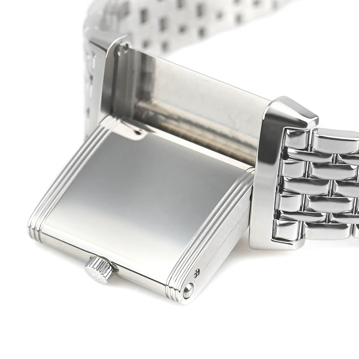 近年のレベルソはサイズアップされて大型化しておりますが、こちらは今となっては少し小振りのクラシカルなタイプです。ケースを反転させると裏側には何も無い、レベルソ本来の姿になっています。