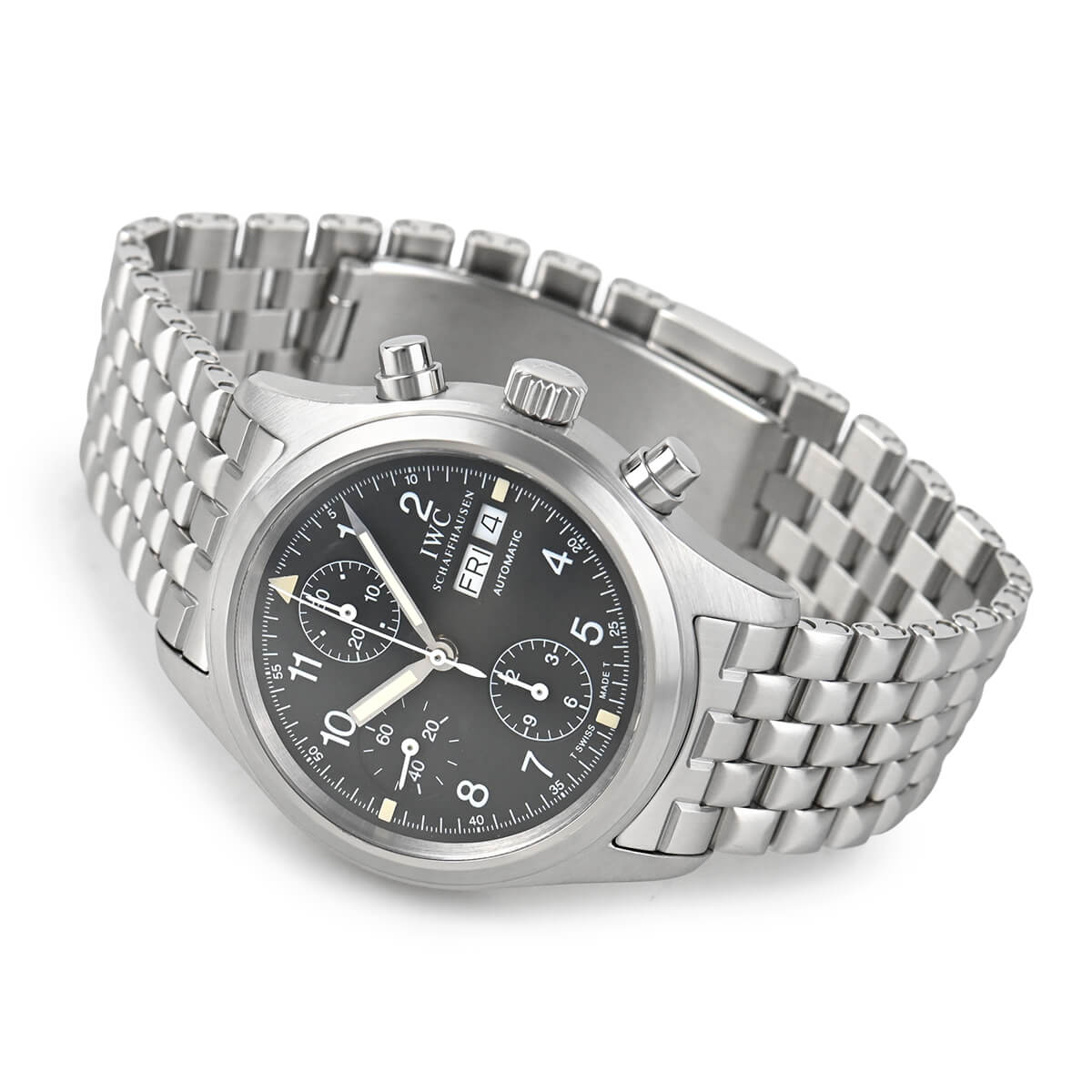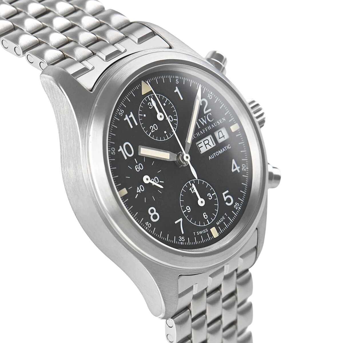IWCのパイロットウォッチの特徴である軟鉄製インナーケースを持つ「メカニカル フリーガー クロノグラフ」。磁気の多いコックピットで必要とされる高い耐磁性能を誇ります。後継機のパイロットウォッチクロノでは大きいかと思われている方にお薦めです。