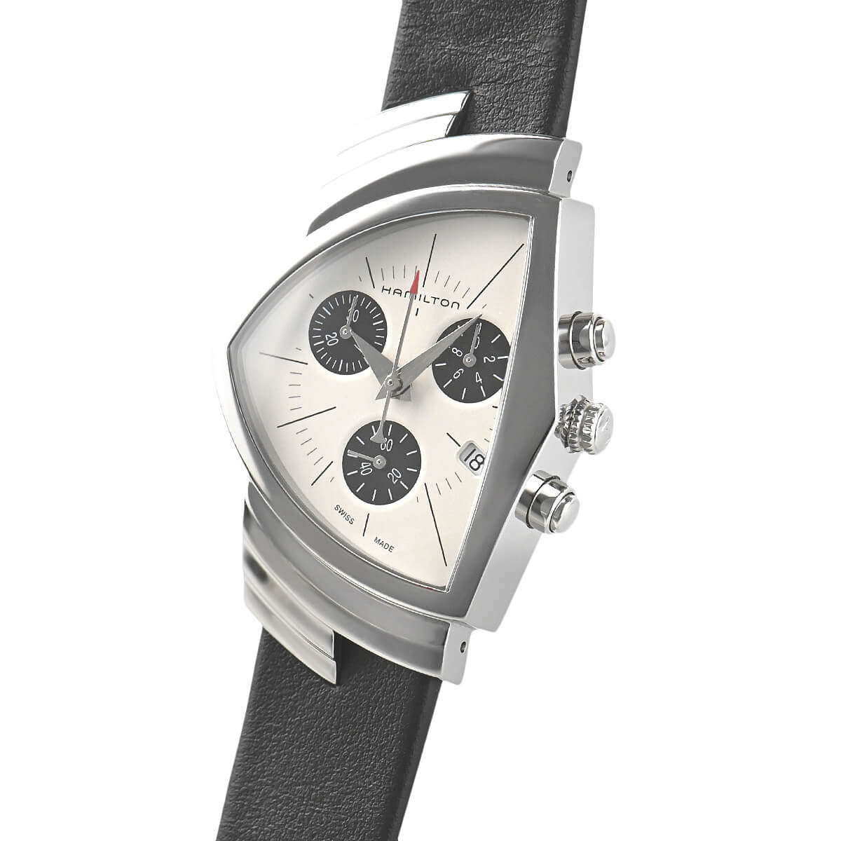 1957年に発売された世界初の電池式時計「ベンチュラ」。内部の先進性だけではなく、左右非対称なケース、角ばって広がったラグ、カーブした風防といった独特なそのデザインは、ウォッチデザインの常識を塗り替えました。
