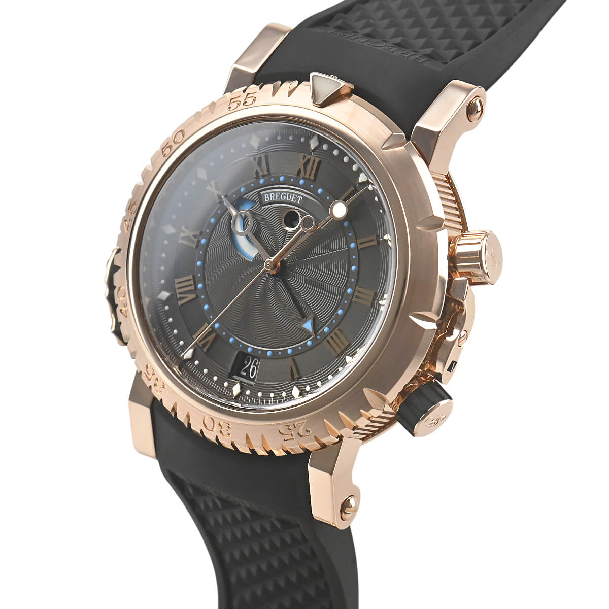 ブレゲがフランス海軍のために製作した時計が基になっているマリーンコレクション。こちらの「マリーン ロイヤル」は、アラーム機能を搭載したダイバーズモデルです。