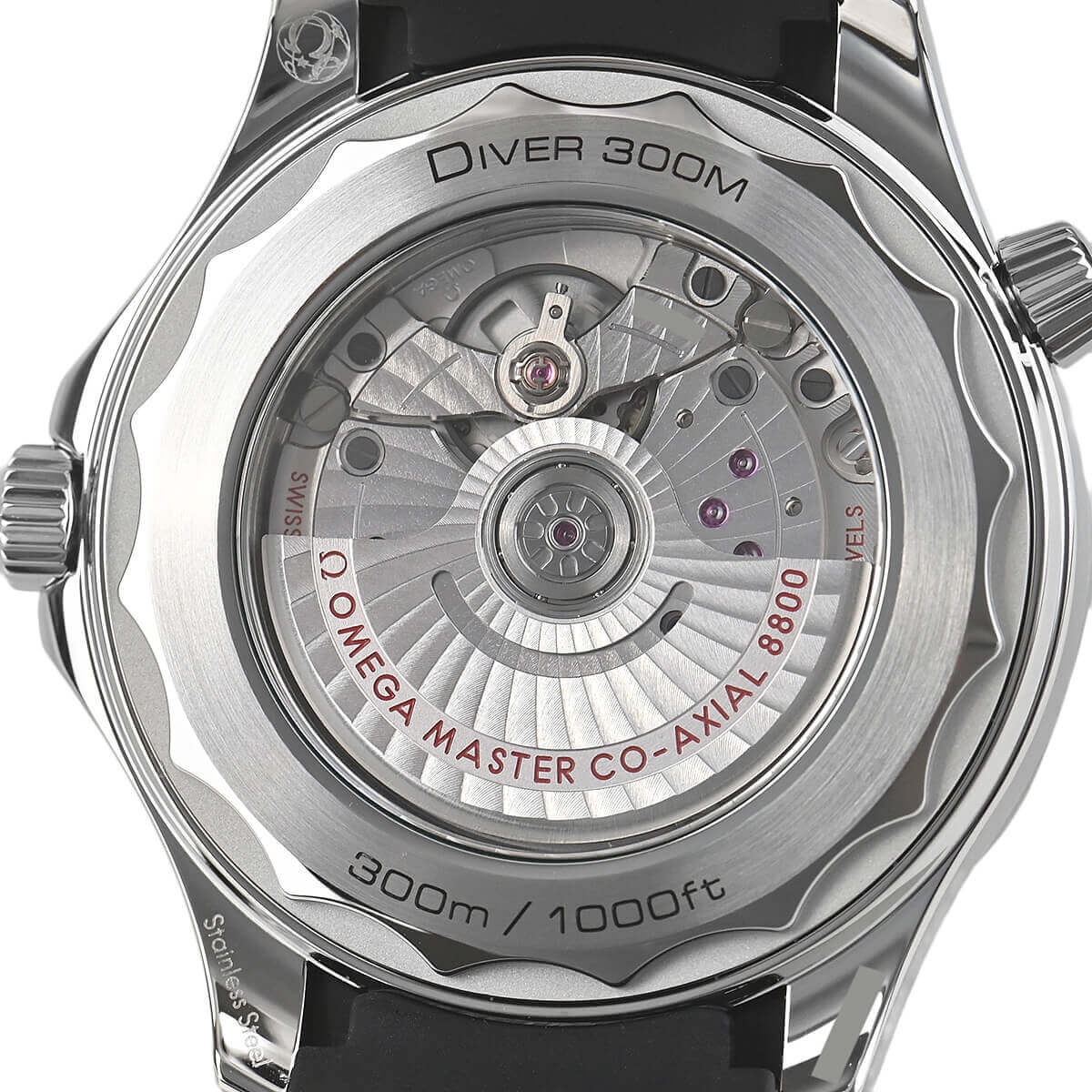 文字盤とダイビングベゼルには耐久性に優れたブラックセラミックを採用し、文字盤にはシーマスターの初代モデルにあったレーザー加工の波模様を復活させています。