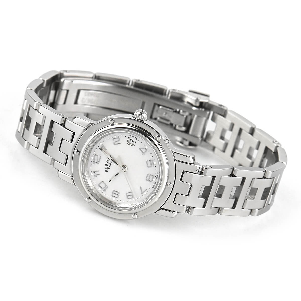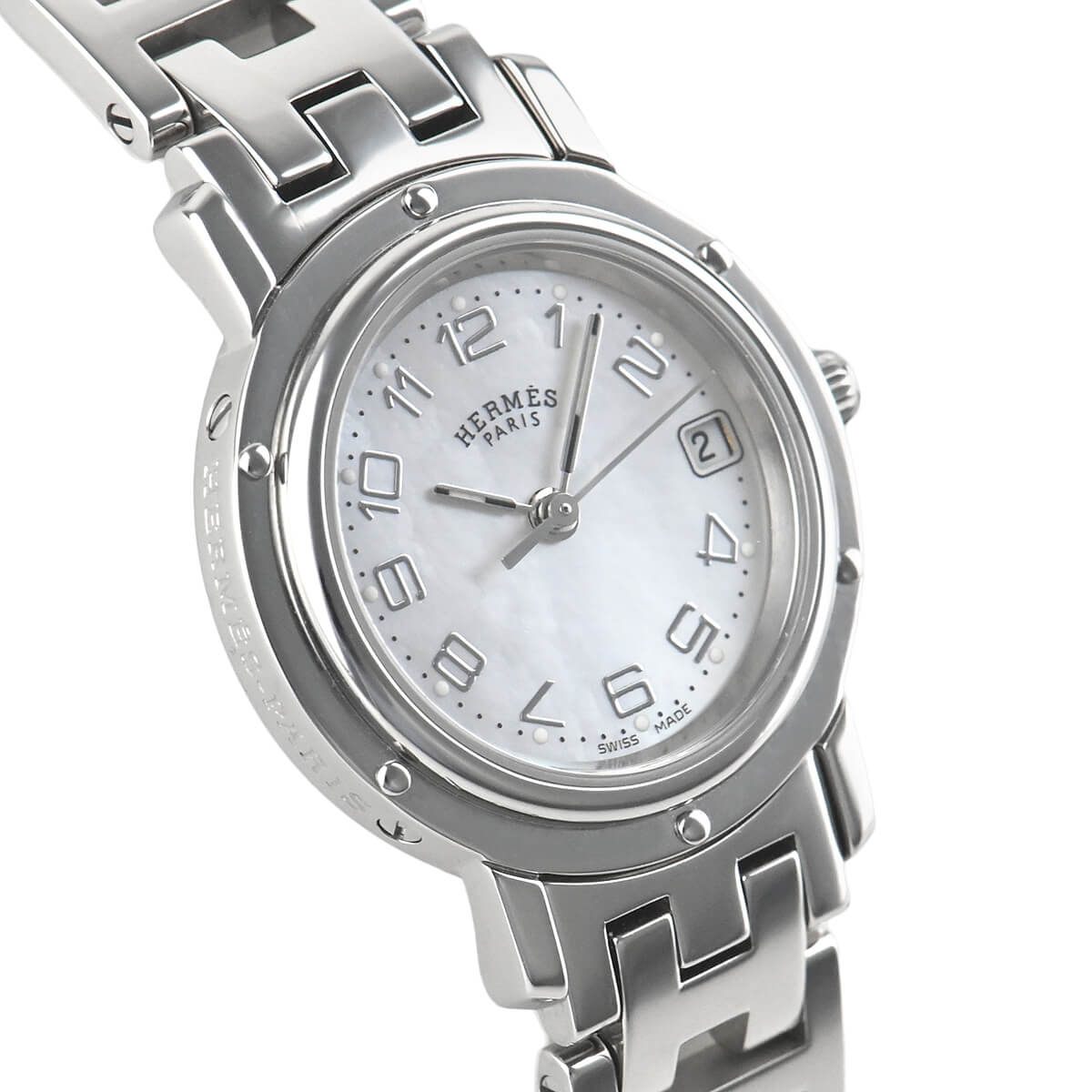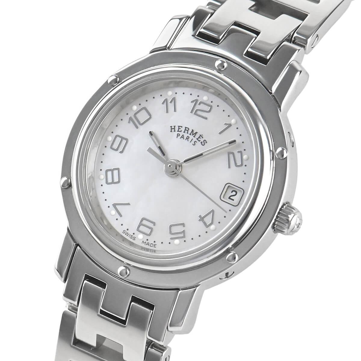 エルメスの定番モデル「クリッパー」。こちらは文字盤にピンクシェルを使用した華やかなモデルです。