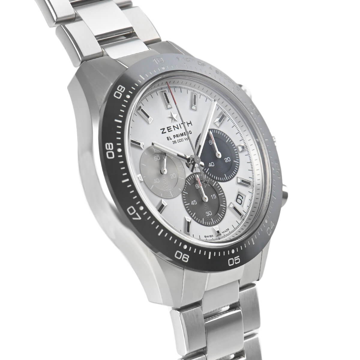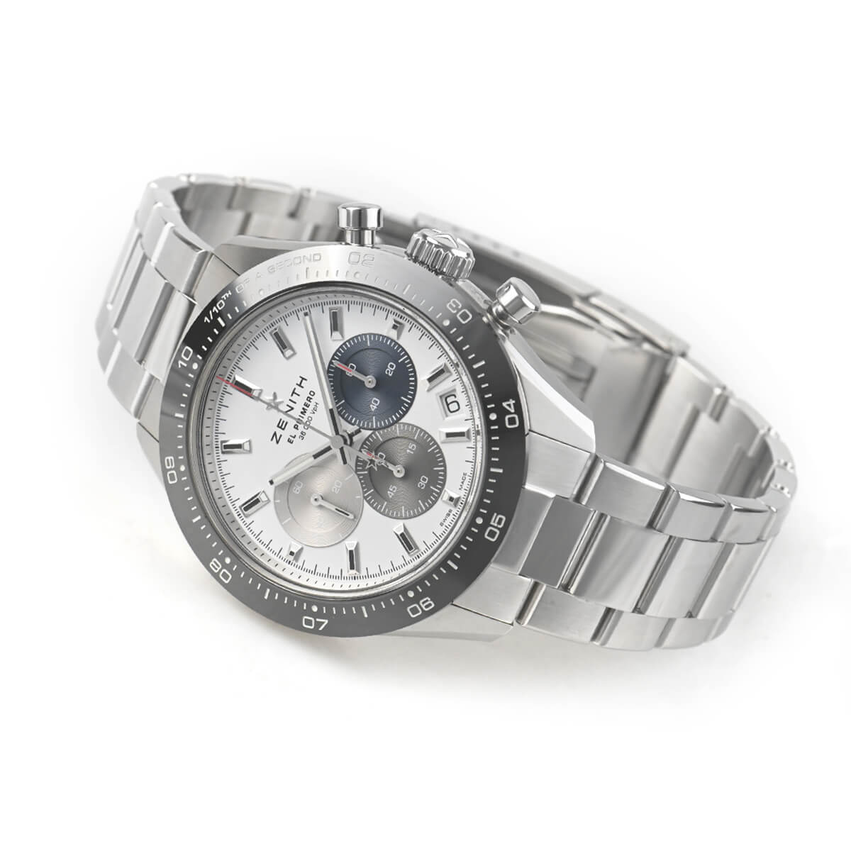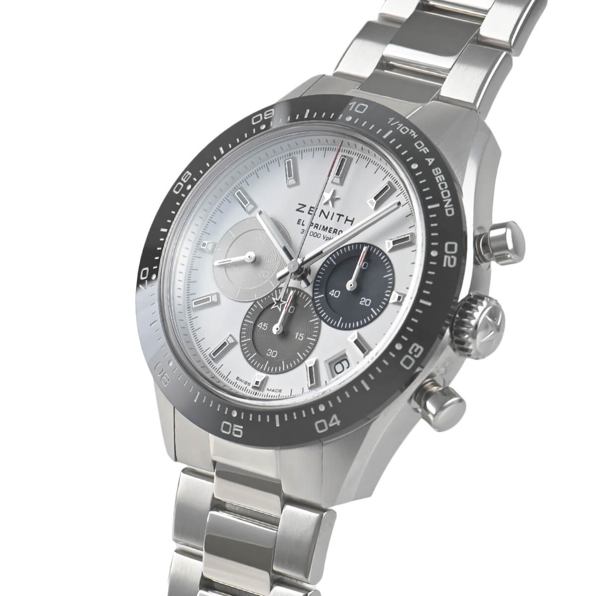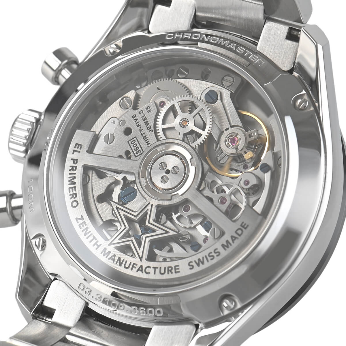 シースルーバックから覗くムーブメントにはゼニスが誇る10振動ムーブメントのエル・プリメロを搭載し、1/10秒単位の高精度な計測が可能。