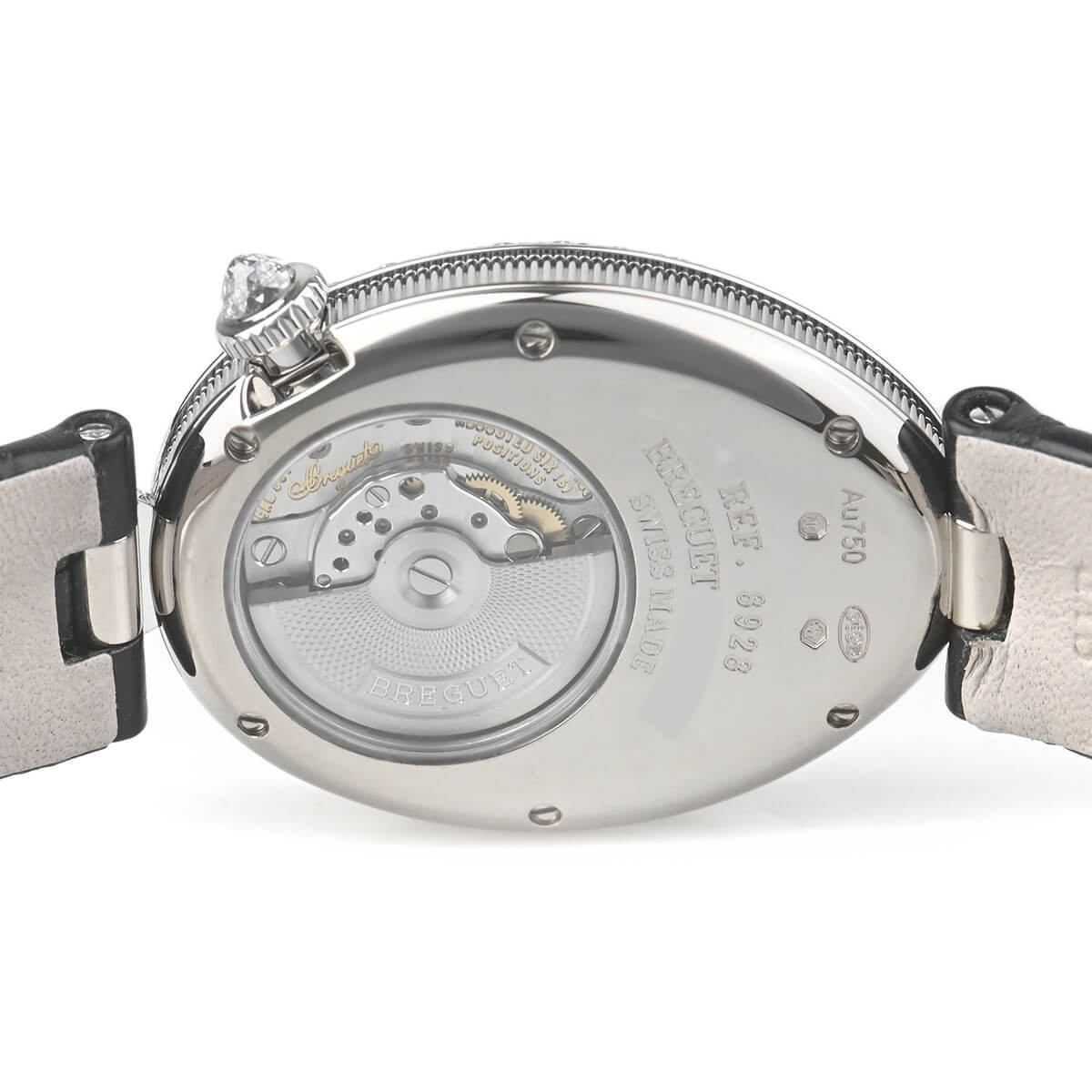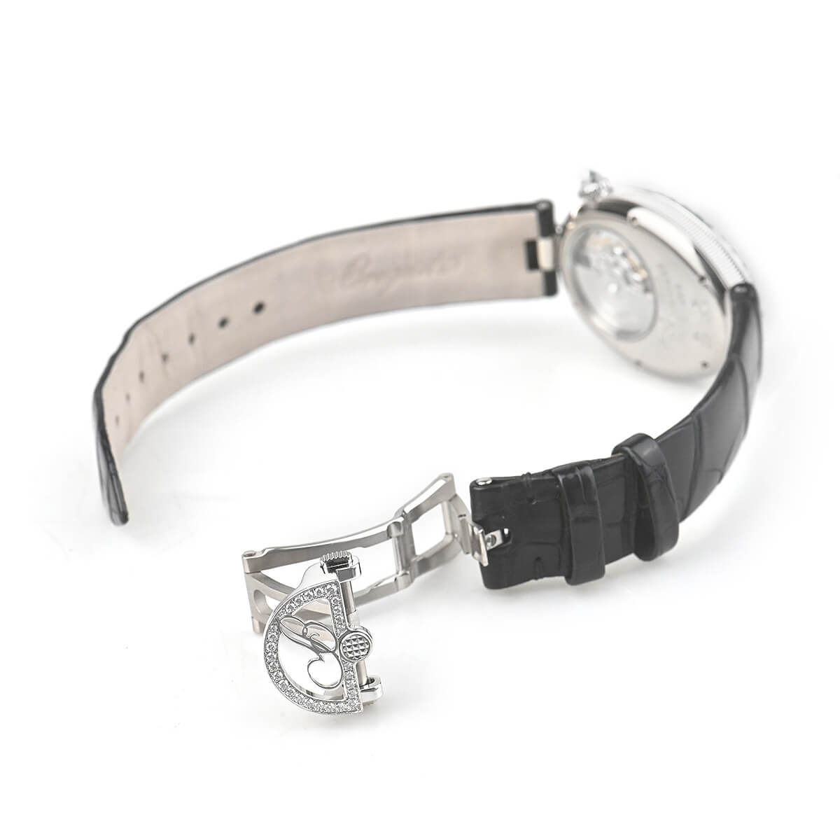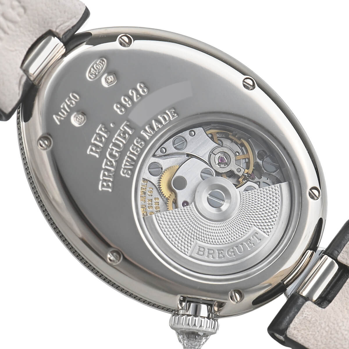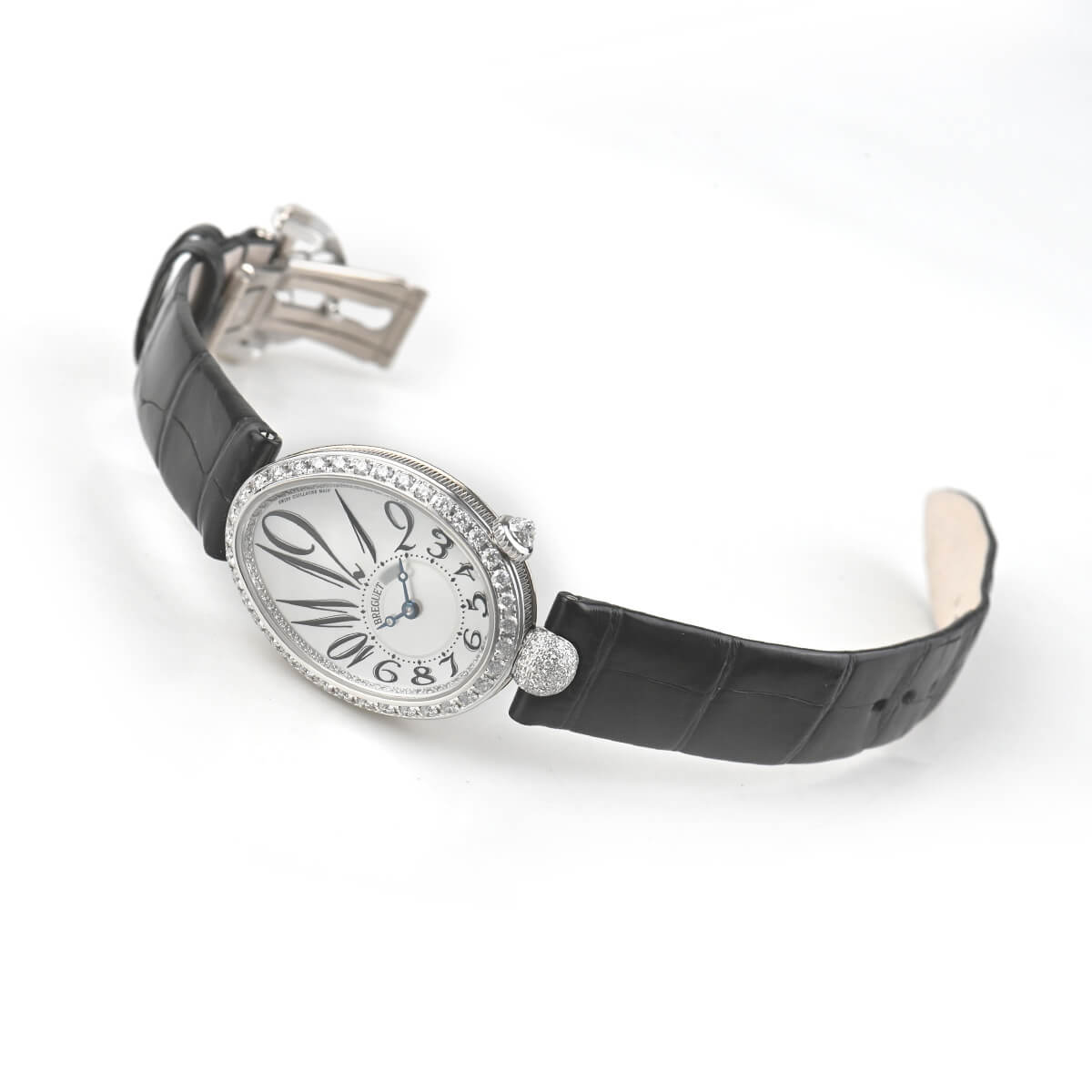ベゼルにはダイヤモンドがセッティングされ、ホワイト・マザーオブパールのダイヤルと共に華やかさを演出。時計が貴族ための特別なものだった時代の雰囲気を今に伝えています。