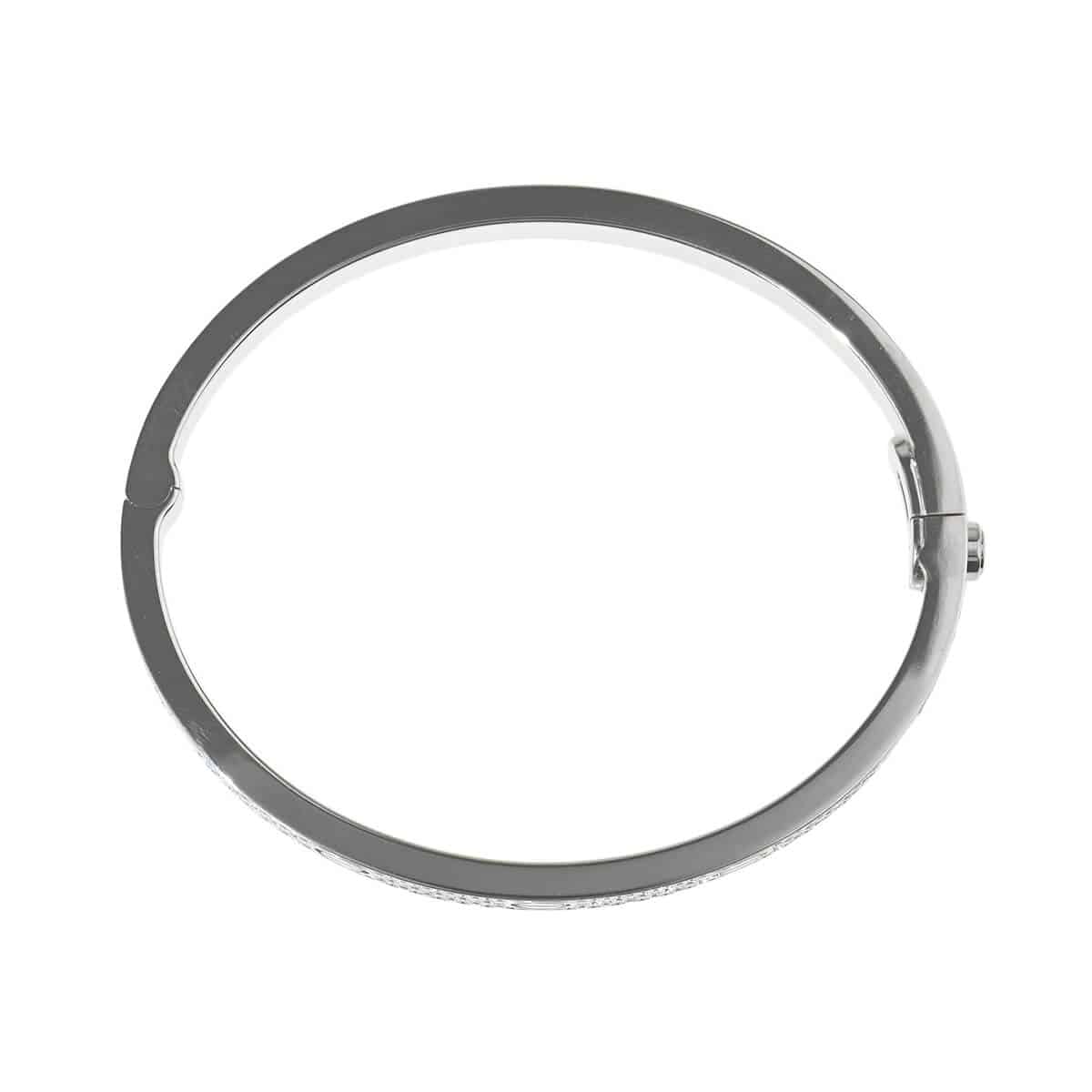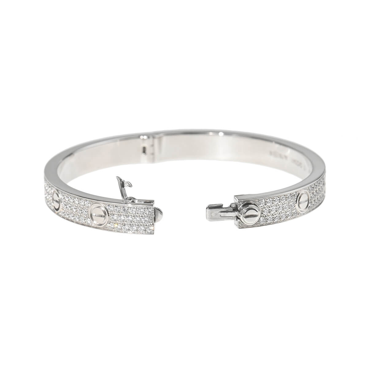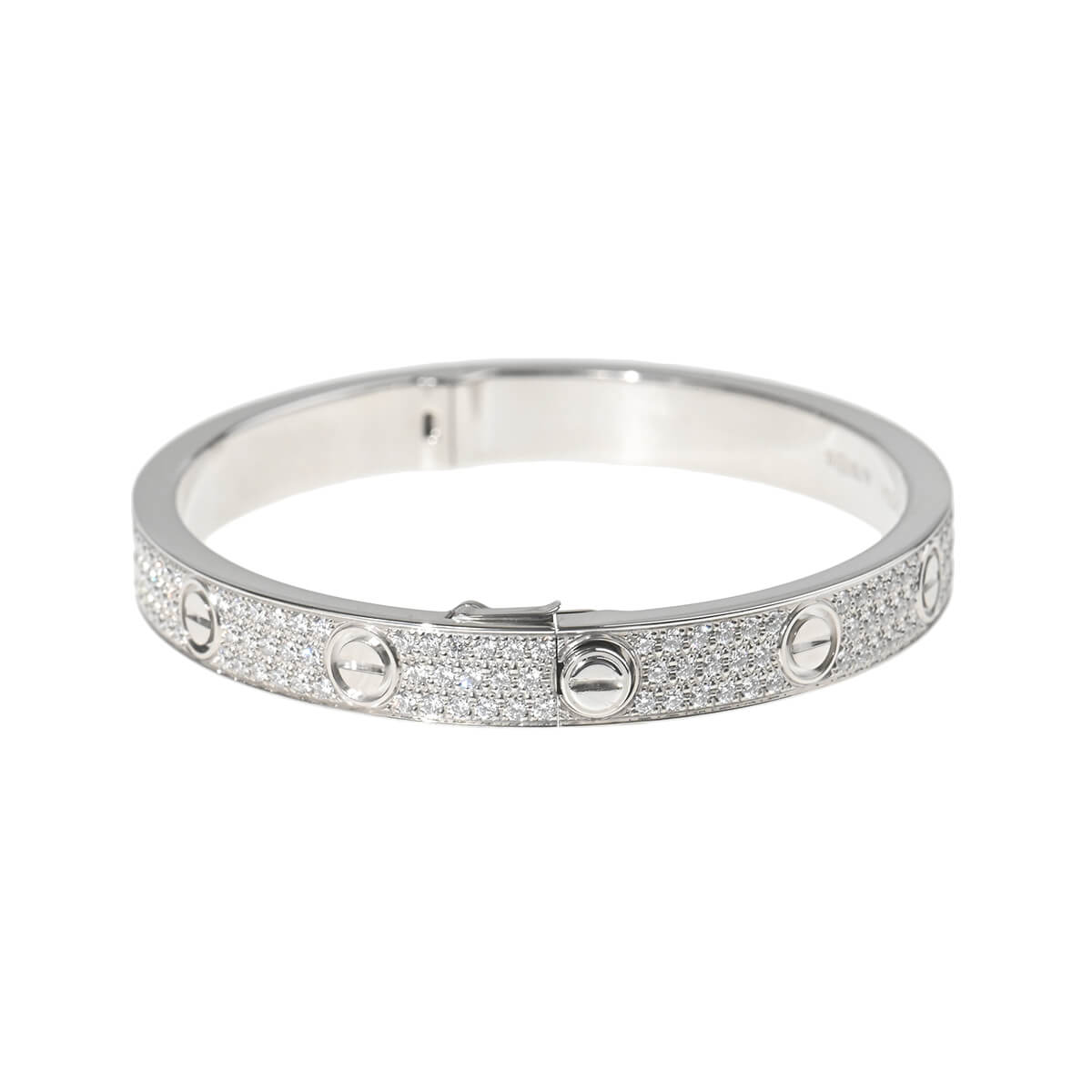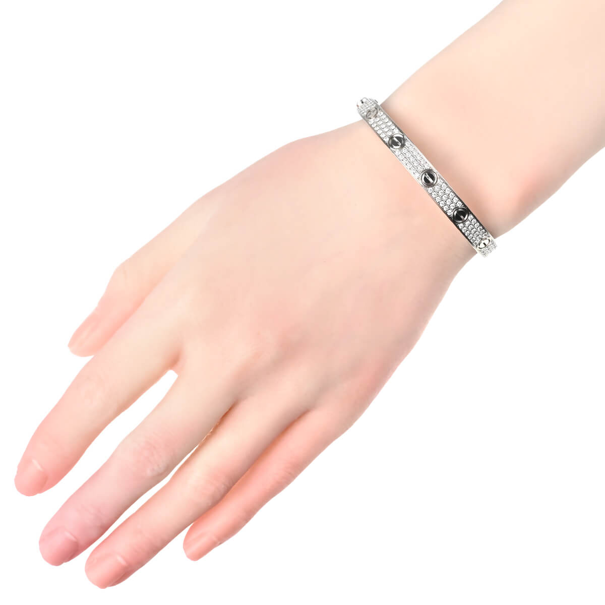 1970年代、『Cartier(カルティエ)』ニューヨークのアトリエで、イタリア出身のジュエリーデザイナー、アルド・チプロによってデザインされた「LOVE」ブレスレット。永遠に結ばれる“絆”のコレクションは、無駄のない端正なビス、完成されたシェイプ、その確固たるエレガンスがタイムレスな魅力を放ちます。洗練されたフォルムが美しいオーバルシェイプブレスレット全面に、パヴェダイヤモンドがあしらわれたホワイトゴールド製「ラブ」ブレスレット。ブレスレット全面にあしらわれたきらめくパヴェダイヤモンドが、端正なビスのエレガントな存在感を一層際立たせています。デイリーにさらりとつけたり、地金をミックスしてレイヤリングしたり、ハイジュエリーとのコーディネートでドレスアップするのも素敵です。