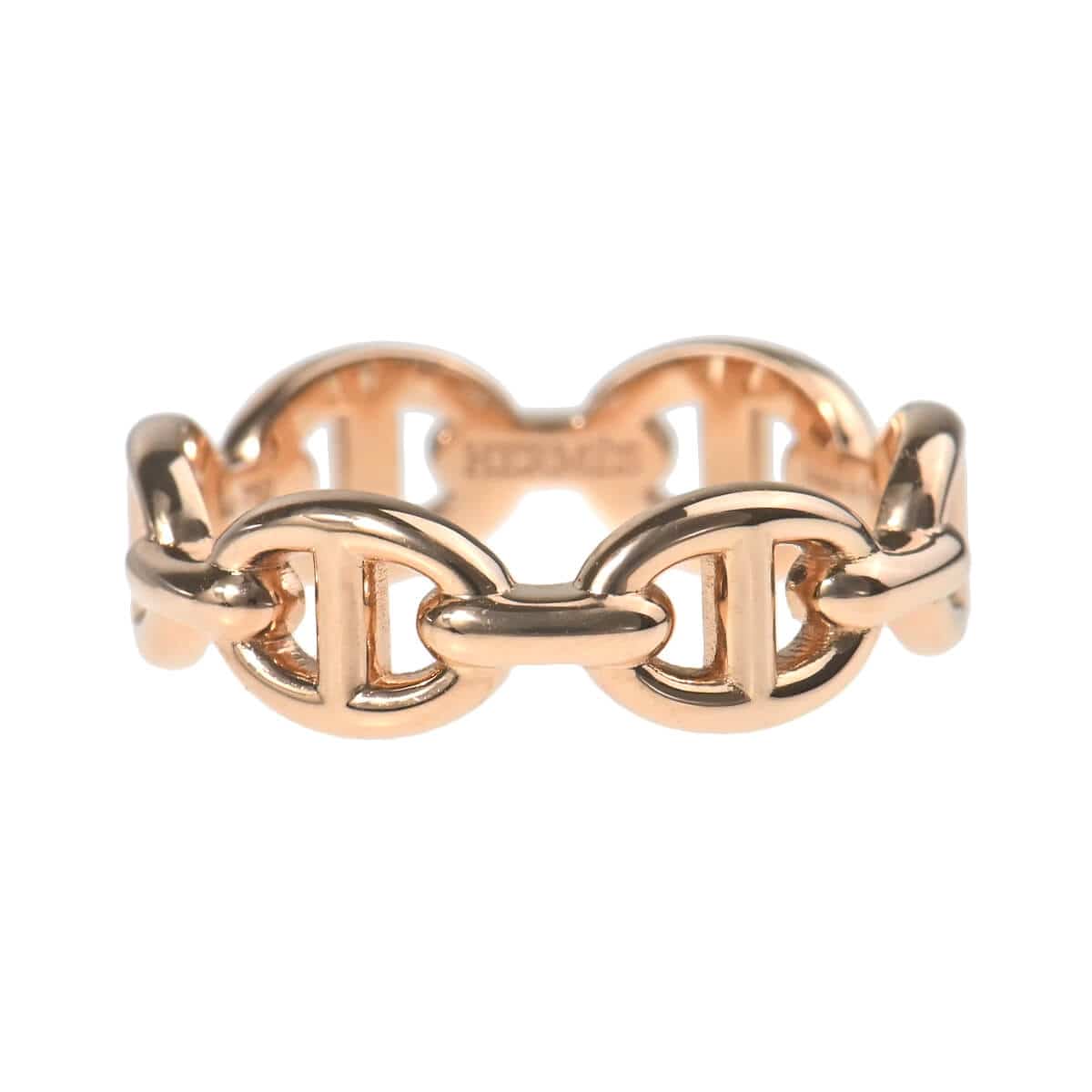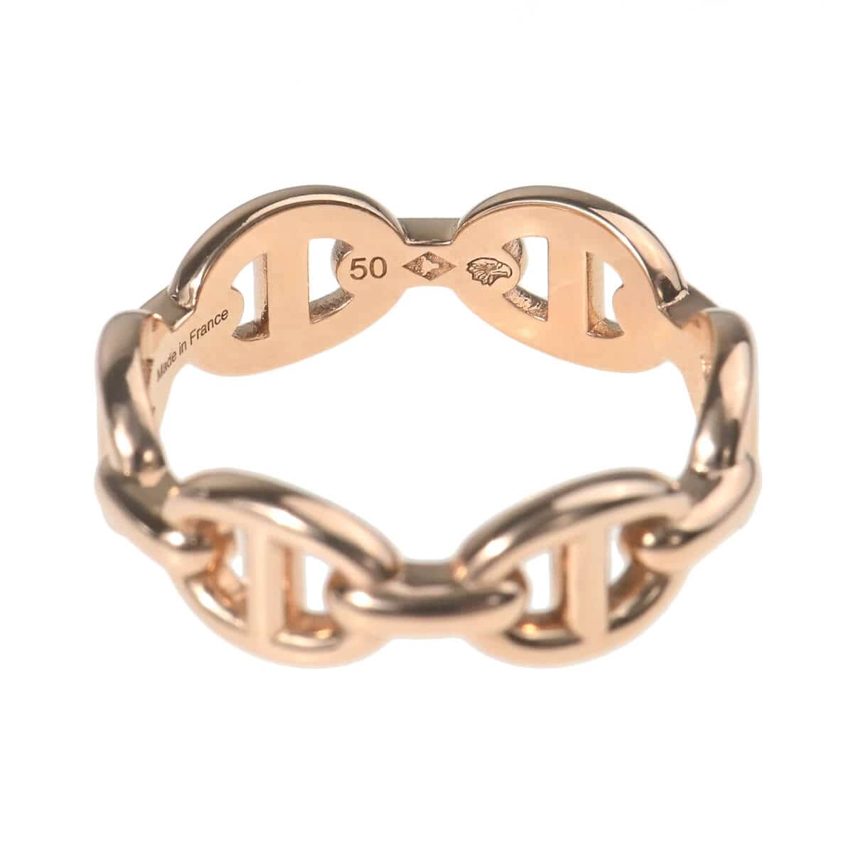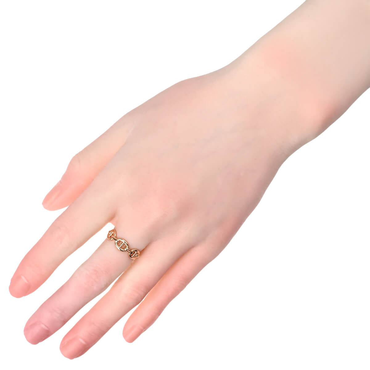 1938年にエルメス家の一員であり当時のエルメスの社長であったロベール・デュマ=エルメスが、ふと船の錨のチェーンに目を留め、そのシルエットに惹かれ、そのチェーンを元にデザインしたブレスレットを作ったことにはじまった「シェーヌ・ダンクル」コレクション。インスピレーションの源であった“錨の鎖(Chaine d’ancre)”をそのままモデル名に冠したこのコレクションは、鎖で強く結ばれた絆を象徴しているそう。最初のブレスレット誕生後も艶出しにしたり、丸い粒状にしたり、ひねったりと、コマの形や大きさを変え、ネックレスやリング、ピアス、ブレスレットとつぎつぎに新しい姿を見せ、メゾンを代表するコレクションのひとつとなった「シェーヌ・ダンクル」。その中でも定番人気モデル「シェーヌ・ダンクル・アンシェネ」の、ピンクゴールド製リングです。1周連なる「シェーヌ・ダンクル」のオブジェが指先を飾りスタイリングをお洒落に引き立てる、一流メゾンのトレンドジュエリーです。