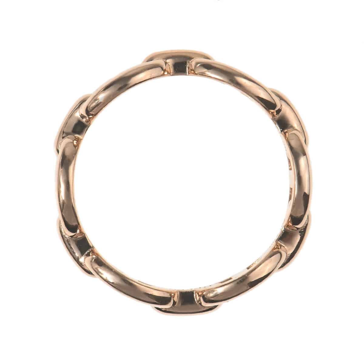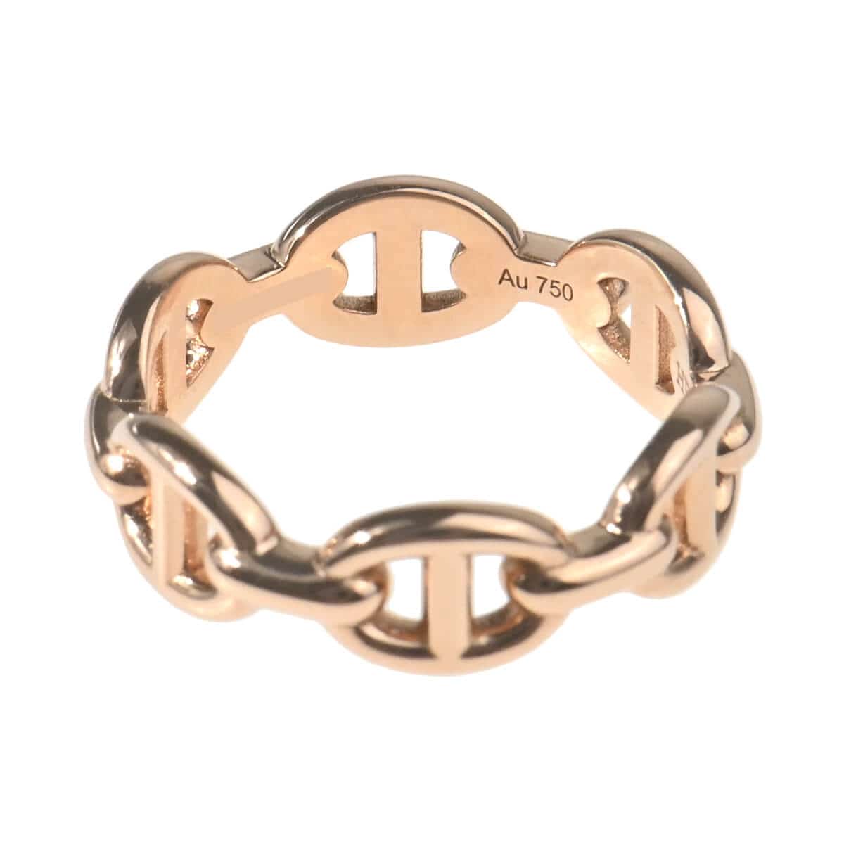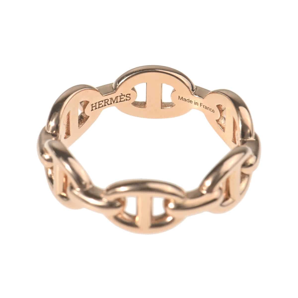 1938年にエルメス家の一員であり当時のエルメスの社長であったロベール・デュマ=エルメスが、ふと船の錨のチェーンに目を留め、そのシルエットに惹かれ、そのチェーンを元にデザインしたブレスレットを作ったことにはじまった「シェーヌ・ダンクル」コレクション。インスピレーションの源であった“錨の鎖(Chaine d’ancre)”をそのままモデル名に冠したこのコレクションは、鎖で強く結ばれた絆を象徴しているそう。最初のブレスレット誕生後も艶出しにしたり、丸い粒状にしたり、ひねったりと、コマの形や大きさを変え、ネックレスやリング、ピアス、ブレスレットとつぎつぎに新しい姿を見せ、メゾンを代表するコレクションのひとつとなった「シェーヌ・ダンクル」。その中でも定番人気モデル「シェーヌ・ダンクル・アンシェネ」の、ピンクゴールド製リングです。1周連なる「シェーヌ・ダンクル」のオブジェが指先を飾りスタイリングをお洒落に引き立てる、一流メゾンのトレンドジュエリーです。