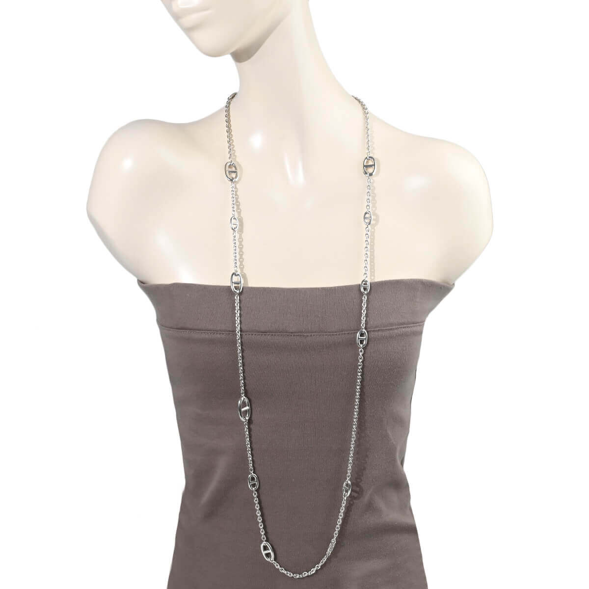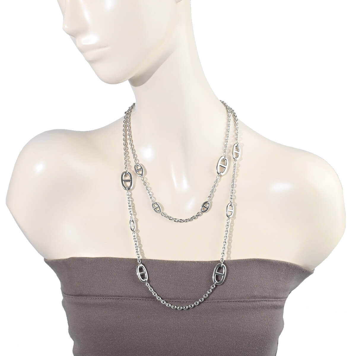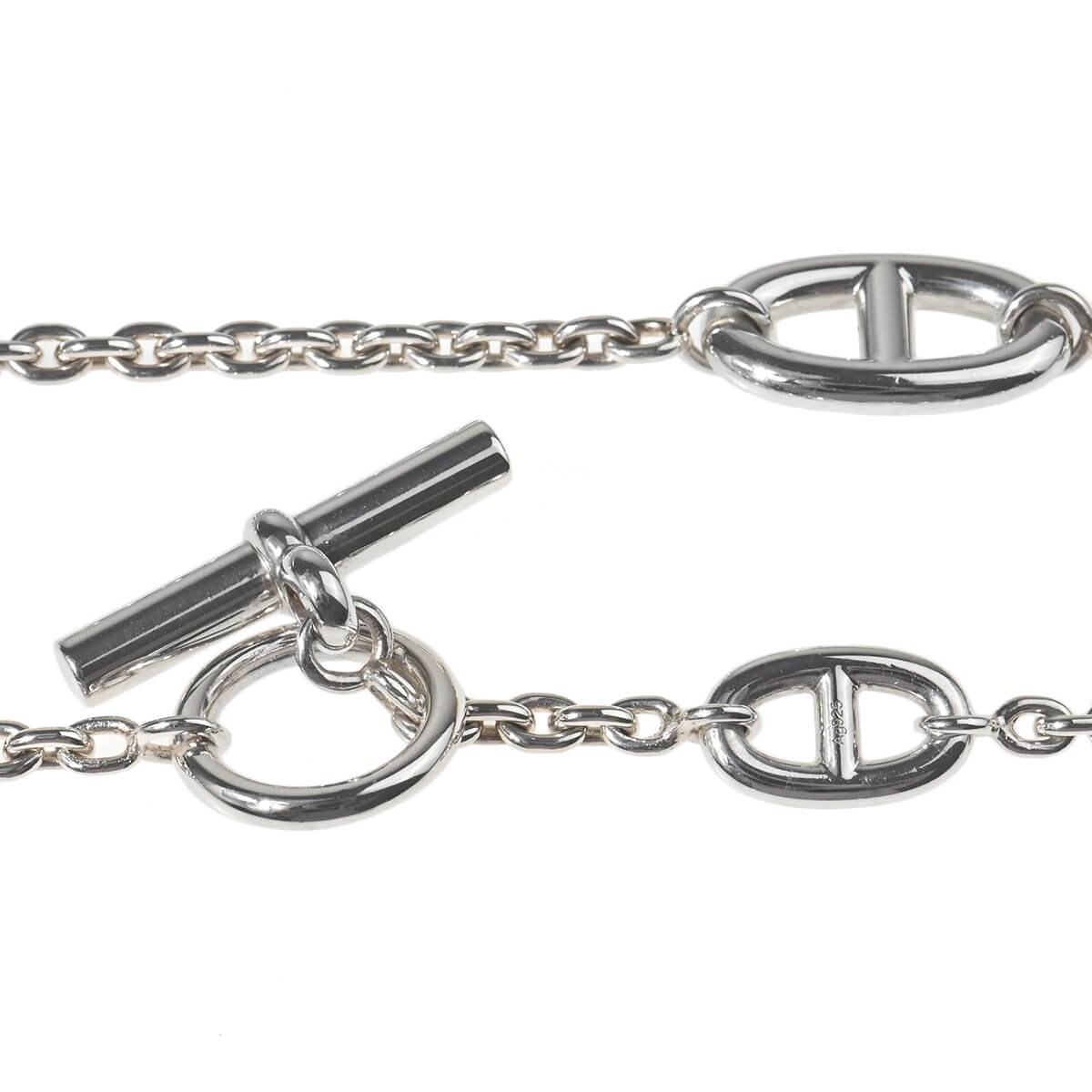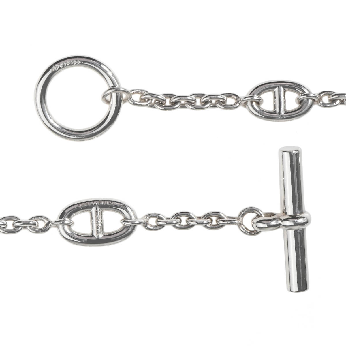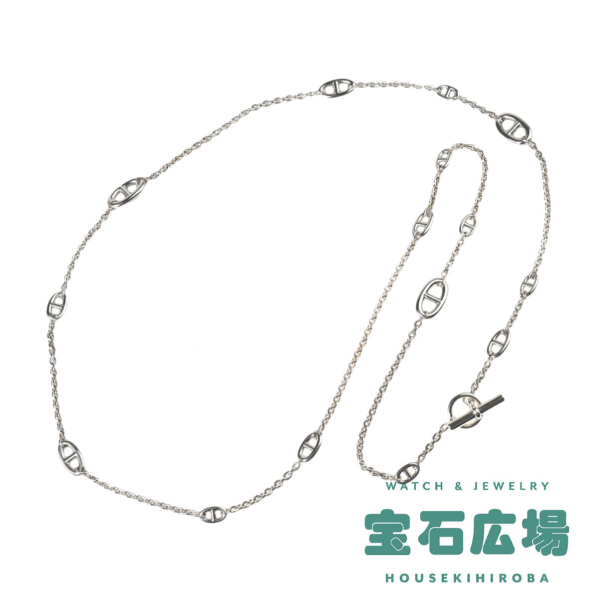 1938年にエルメス家の一員であり当時のエルメスの社長であったロベール・デュマ=エルメスが、ふと船の錨のチェーンに目を留め、そのシルエットに惹かれ、そのチェーンを元にデザインしたブレスレットを作ったことにはじまった「シェーヌ・ダンクル」コレクション。インスピレーションの源であった“錨の鎖(Chaine d’ancre)”をそのままモデル名に冠したこのコレクションは、鎖で強く結ばれた絆を象徴しているそう。最初のブレスレット誕生後も艶出しにしたり、丸い粒状にしたり、ひねったりと、コマの形や大きさを変え、ネックレスやリング、ピアス、ブレスレットとつぎつぎに新しい姿を見せ、メゾンを代表するコレクションのひとつとなった「シェーヌ・ダンクル」、120cmのシルバー製ファランドールネックレスです。サイズの異なるシェーヌ・ダンクルのモチーフがランダムにあしらわれたデザインネックレスはさらりと1連で、Y字にしたり、2重、3重にしたりと、さまざまなアレンジでスタイリングをお洒落に引き立てる、一流メゾンのトレンドジュエリーです。