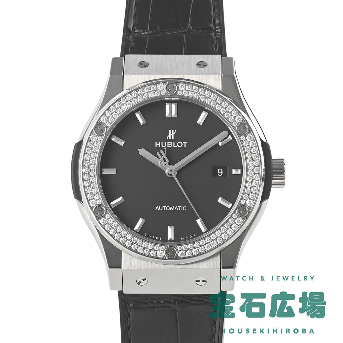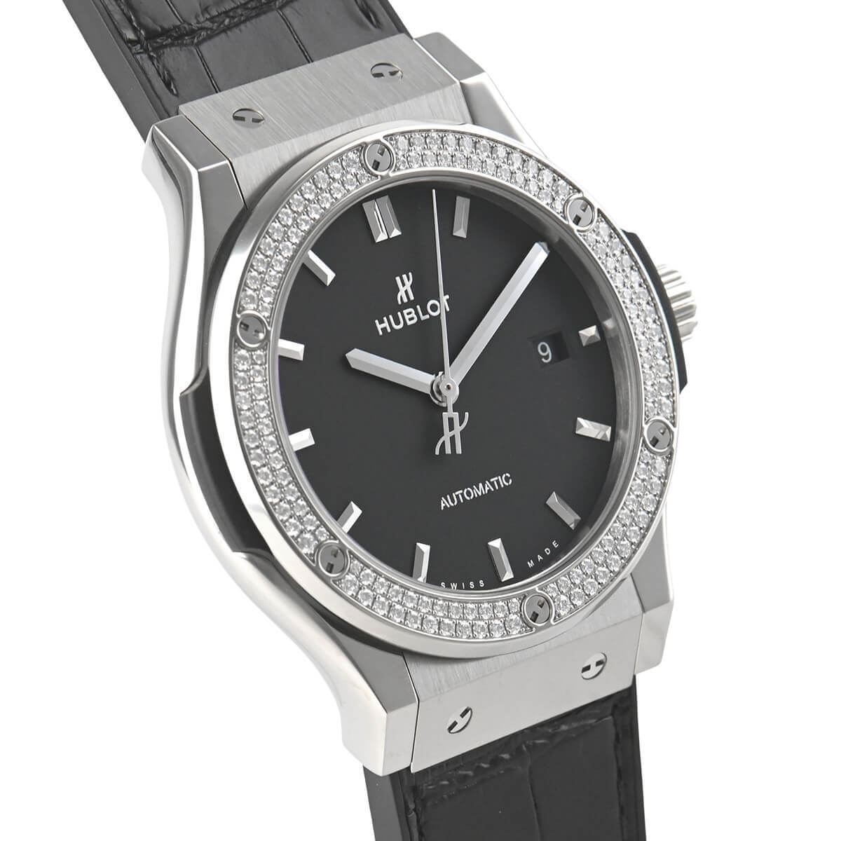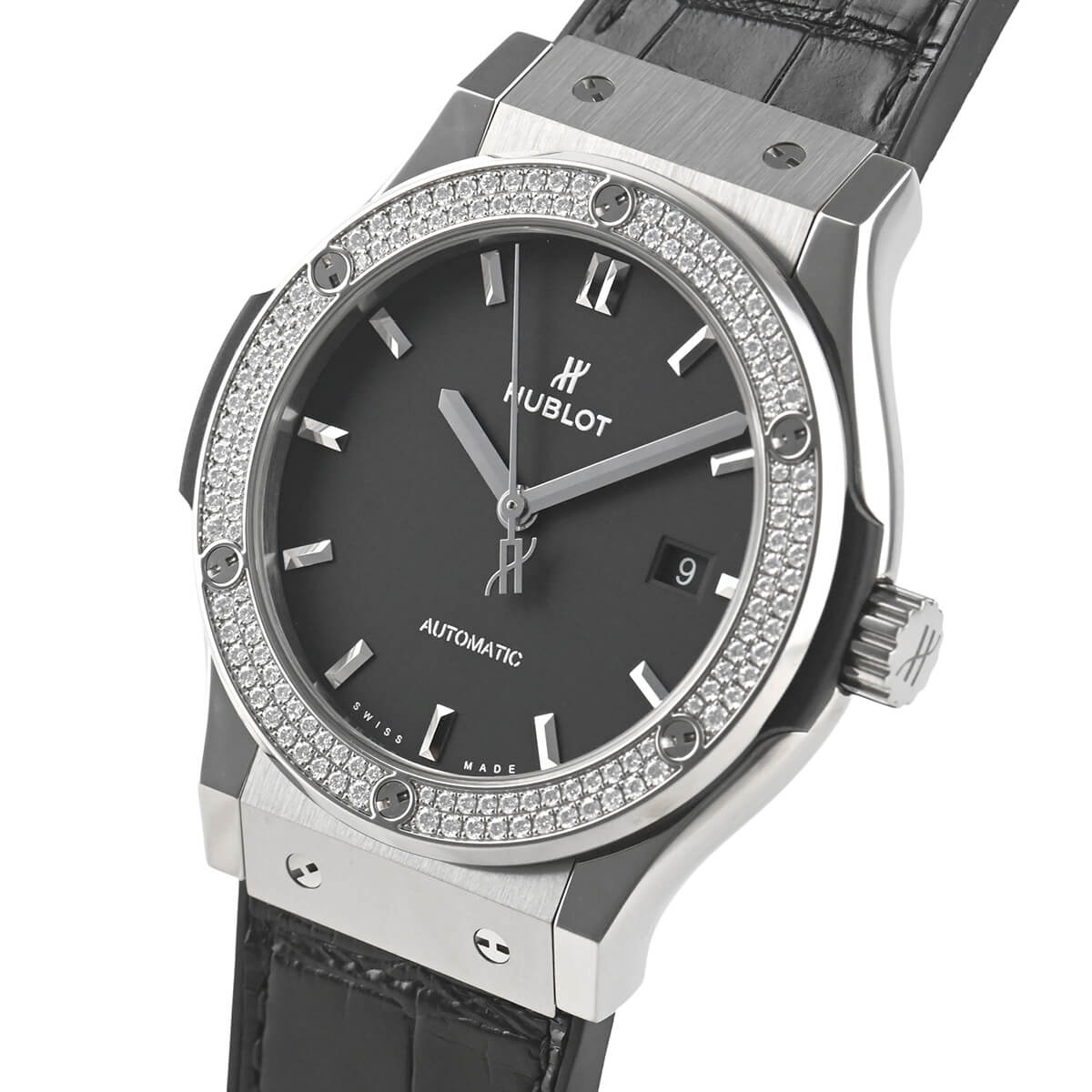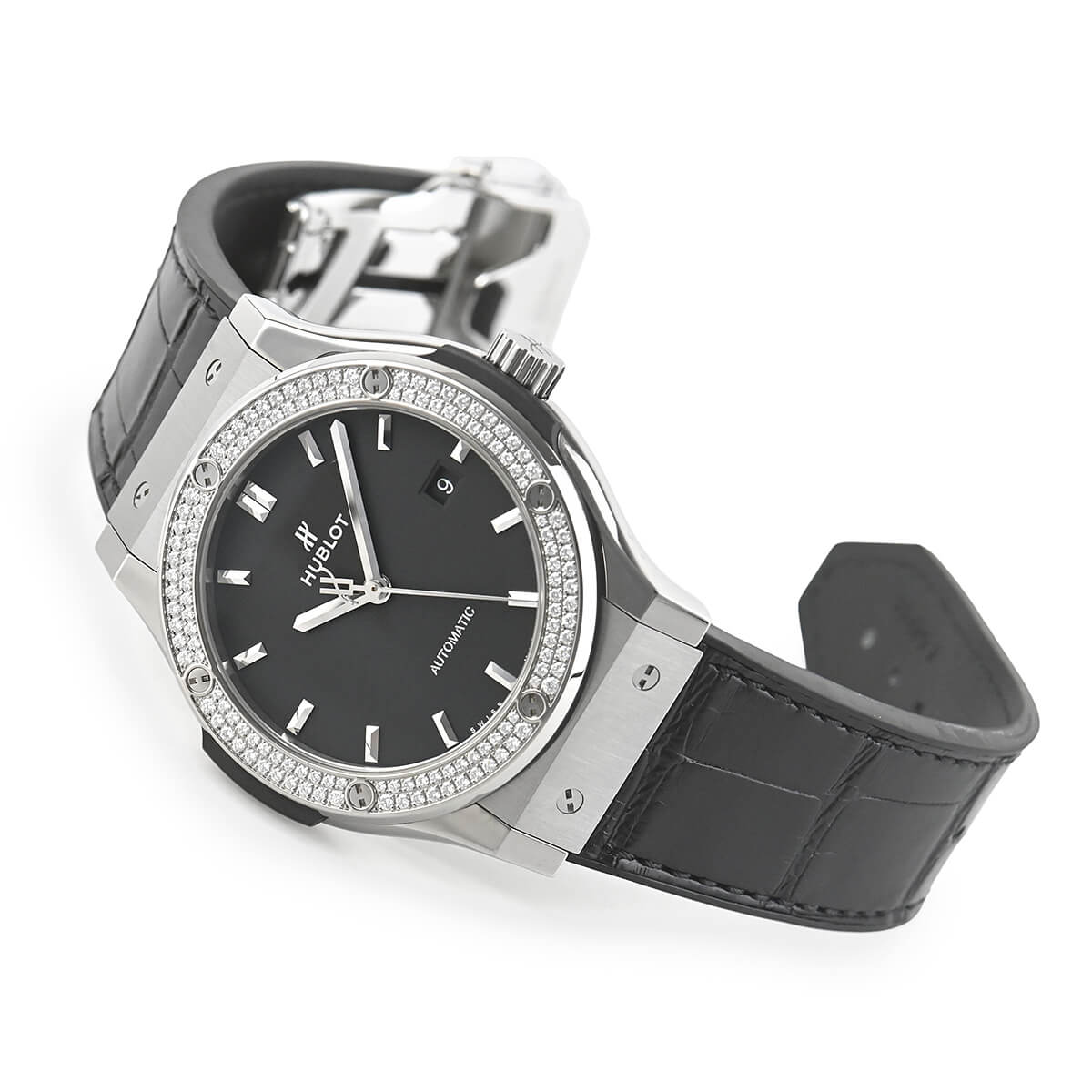 今までのクラシックシリーズに比べてケースを大型化。薄いケースから来る端正なエレガントさと、ビッグバン譲りの迫力とを両立した新モデルとなっています。こちらはチタン製ケースのベゼル部分に2列のパヴェダイヤセッティングを施した華やかな一本です。