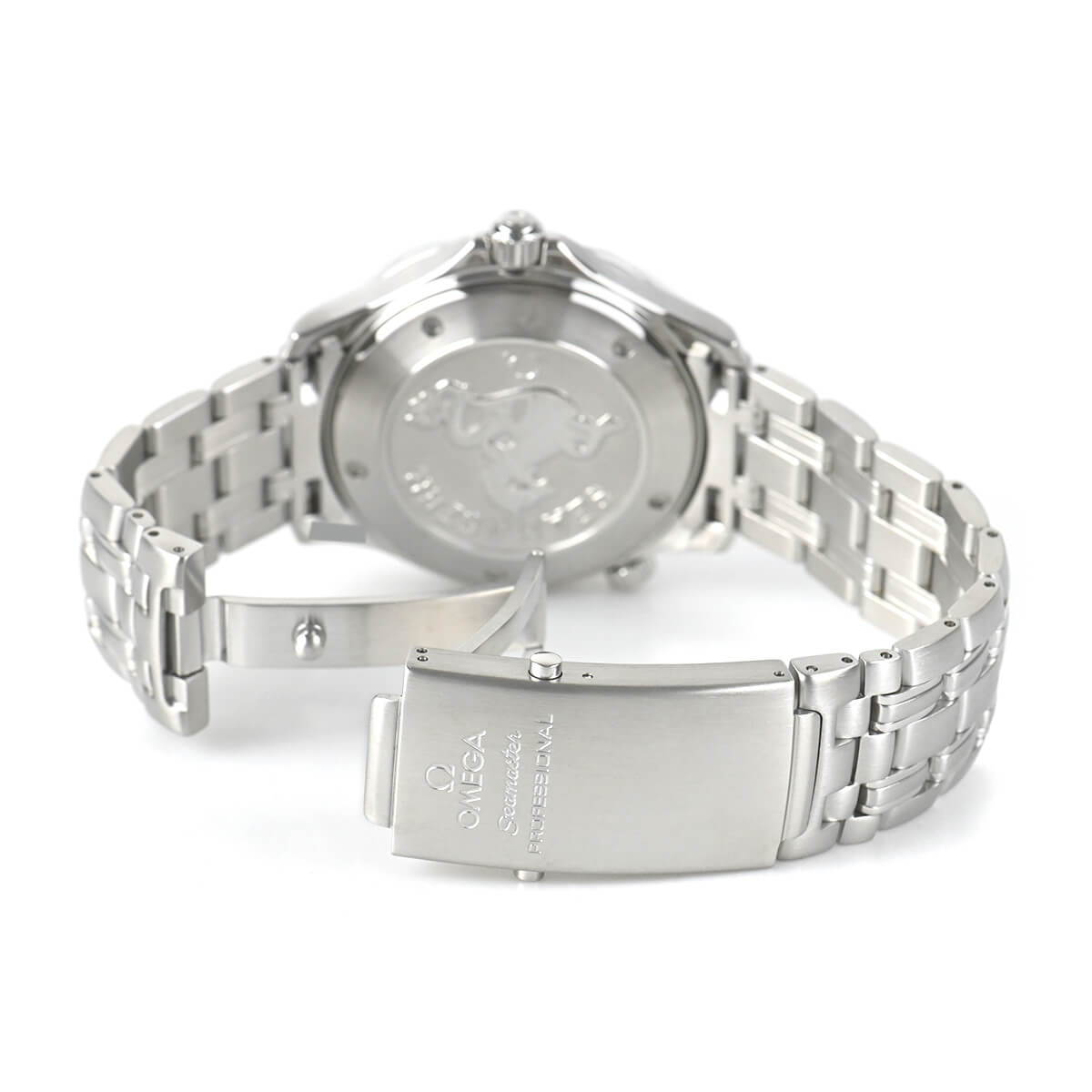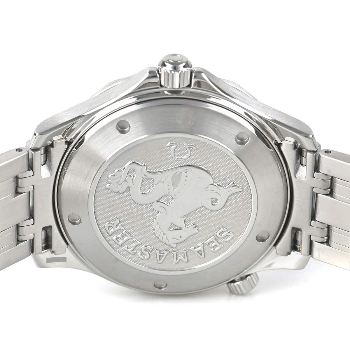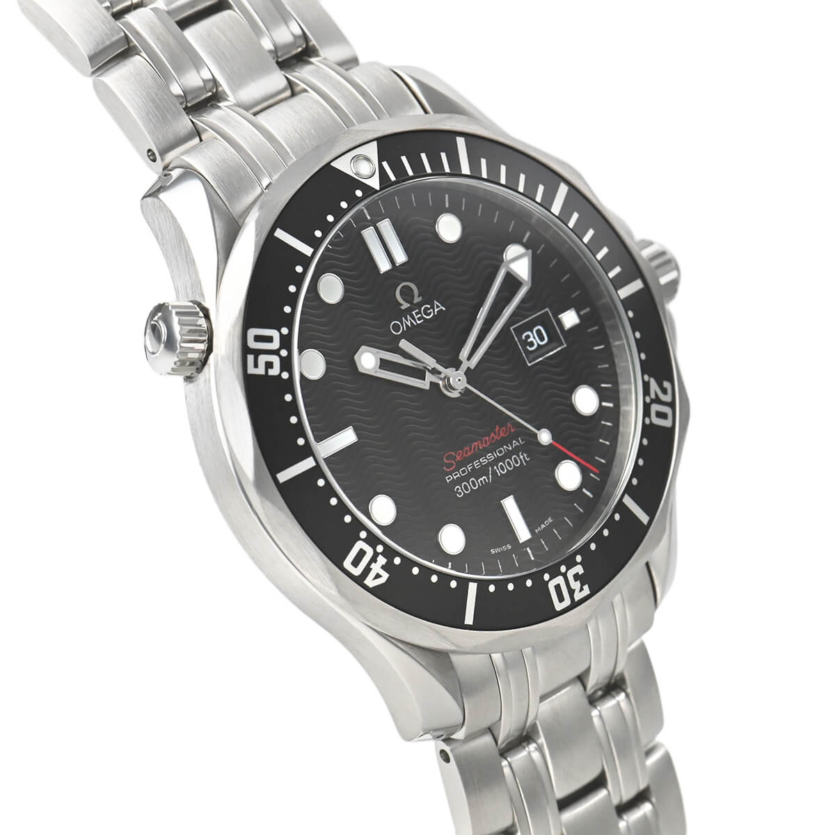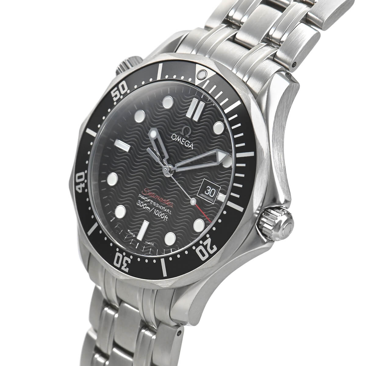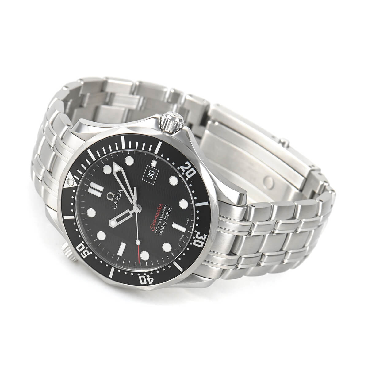 クォーツムーブメントを搭載したシーマスタープロフェッショナルです。300m防水とヘリウムエスケープバルブが機能的で、黒い文字盤がシャープな印象を与えています。