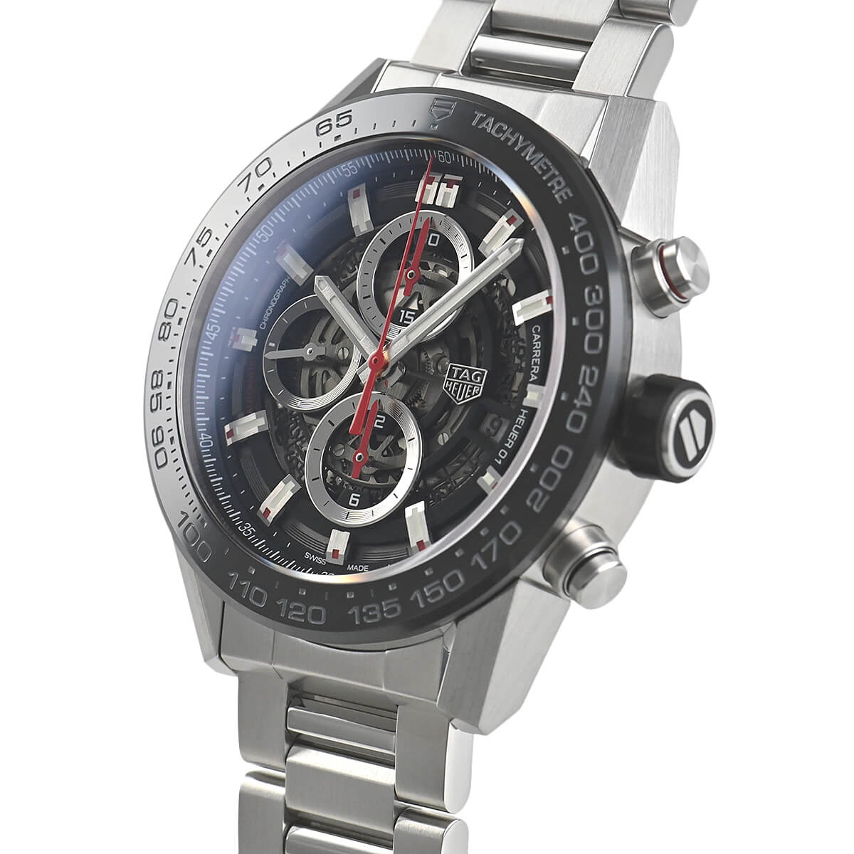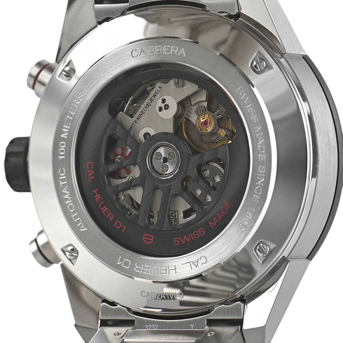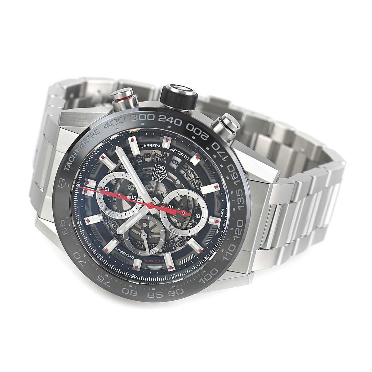 タキメーターベゼルには耐傷性に優れたブラックセラミックを採用し、また文字盤をスケルトン仕様にすることでスポーティーでメカニックな印象の「キャリバーホイヤー01 クロノグラフ」。ムーブメントにはブラックコーティングが施されたローターと赤色のコラムホイールが特徴のキャリバー「ホイヤー01」を搭載します。