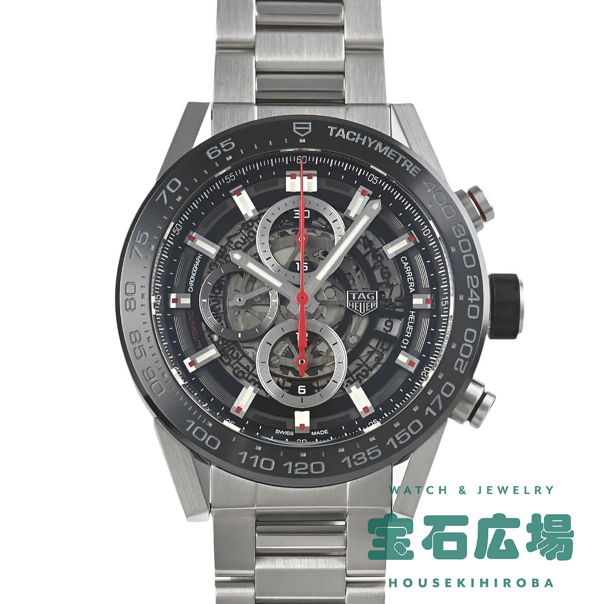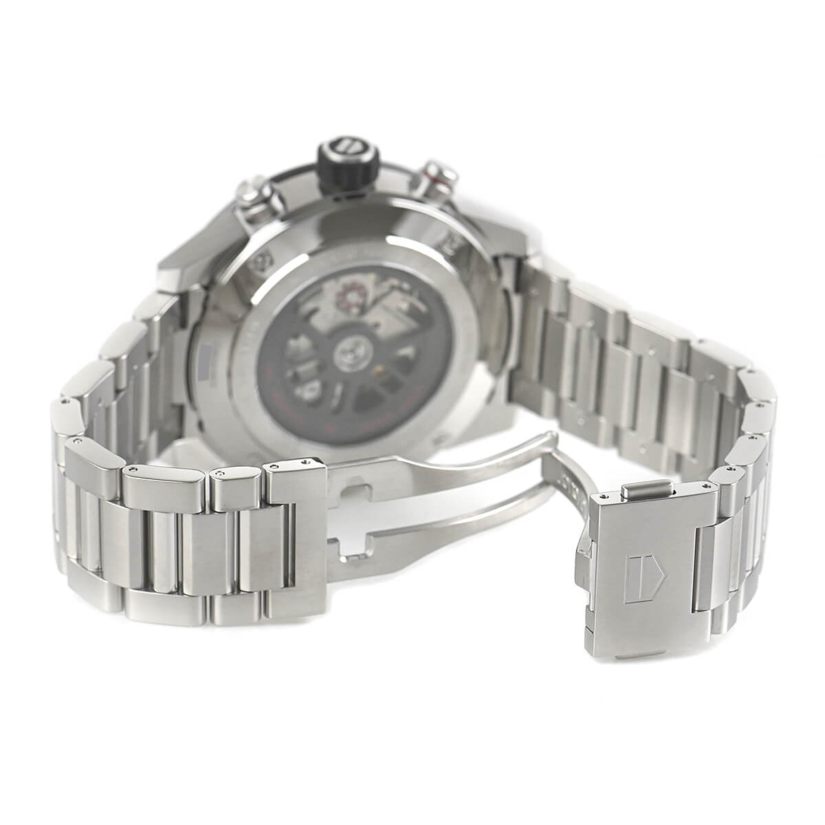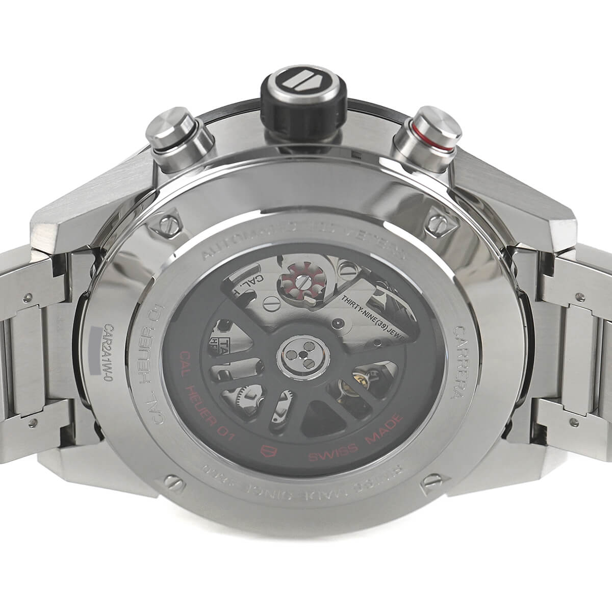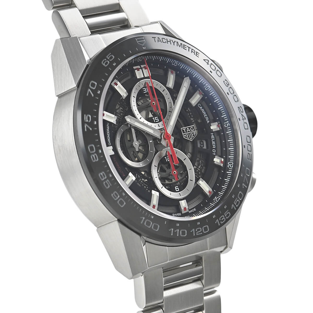 タキメーターベゼルには耐傷性に優れたブラックセラミックを採用し、また文字盤をスケルトン仕様にすることでスポーティーでメカニックな印象の「キャリバーホイヤー01 クロノグラフ」。ムーブメントにはブラックコーティングが施されたローターと赤色のコラムホイールが特徴のキャリバー「ホイヤー01」を搭載します。