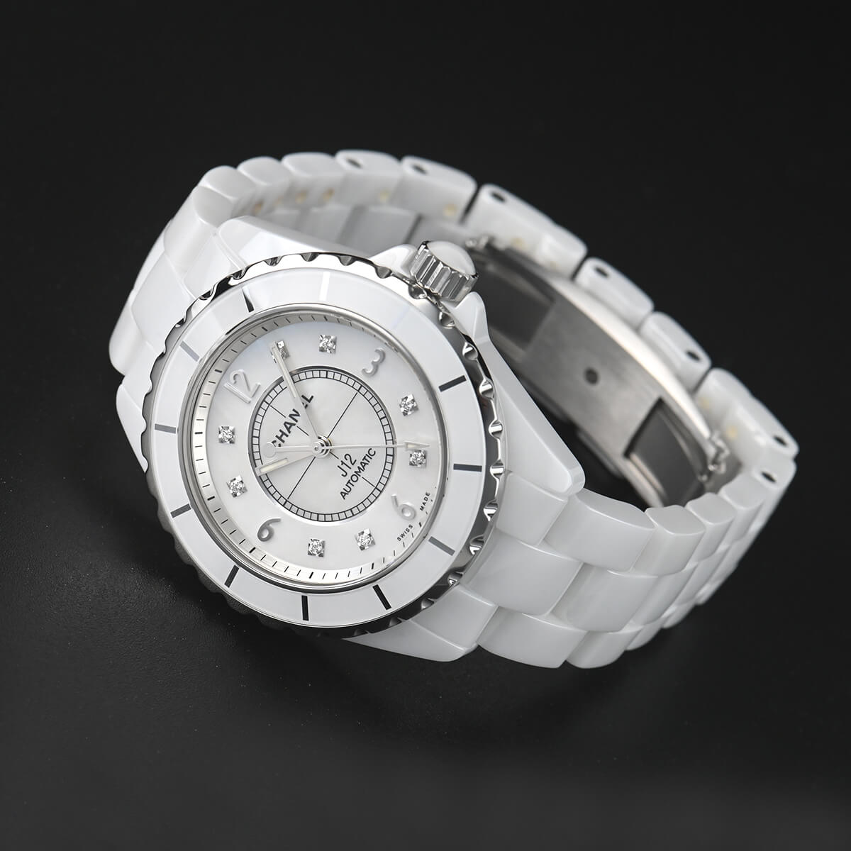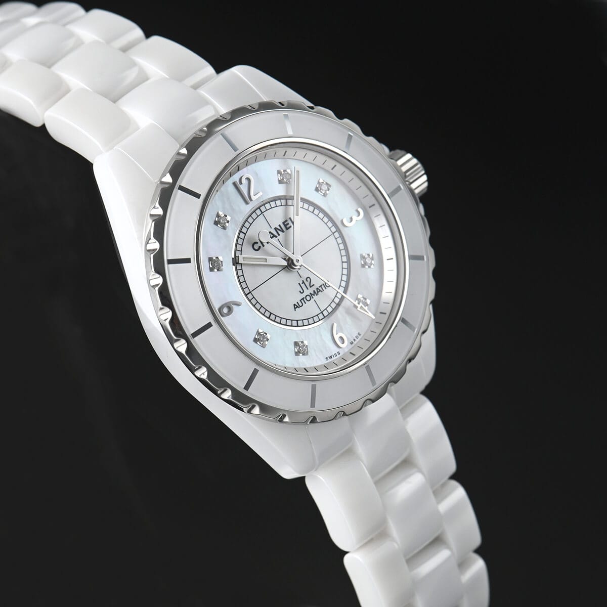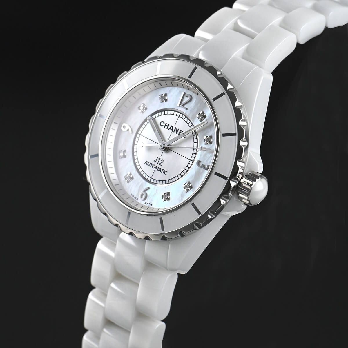 人気の「J12」のシェルダイヤルモデルが入荷しました。8ポイントのダイヤが配置され、セラミックの白とマッチして華やかな雰囲気を演出します。