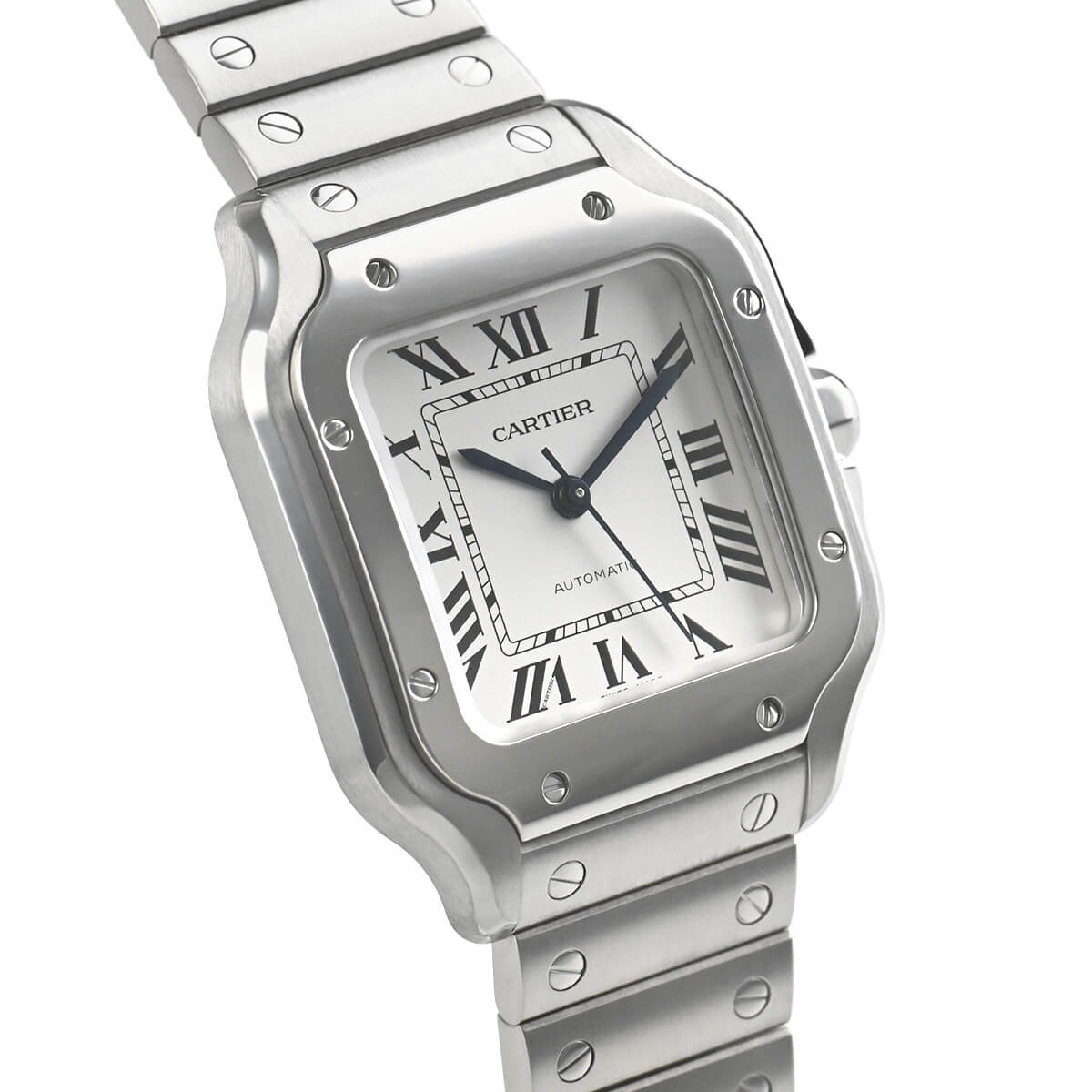 文字盤のローマインデックスとその内側に描かれた四角のレイルウェイ分目盛はカルティエウォッチを特徴づけ、またケースとブレスレットにはサントスウォッチ特有のビスモチーフが施されます。
