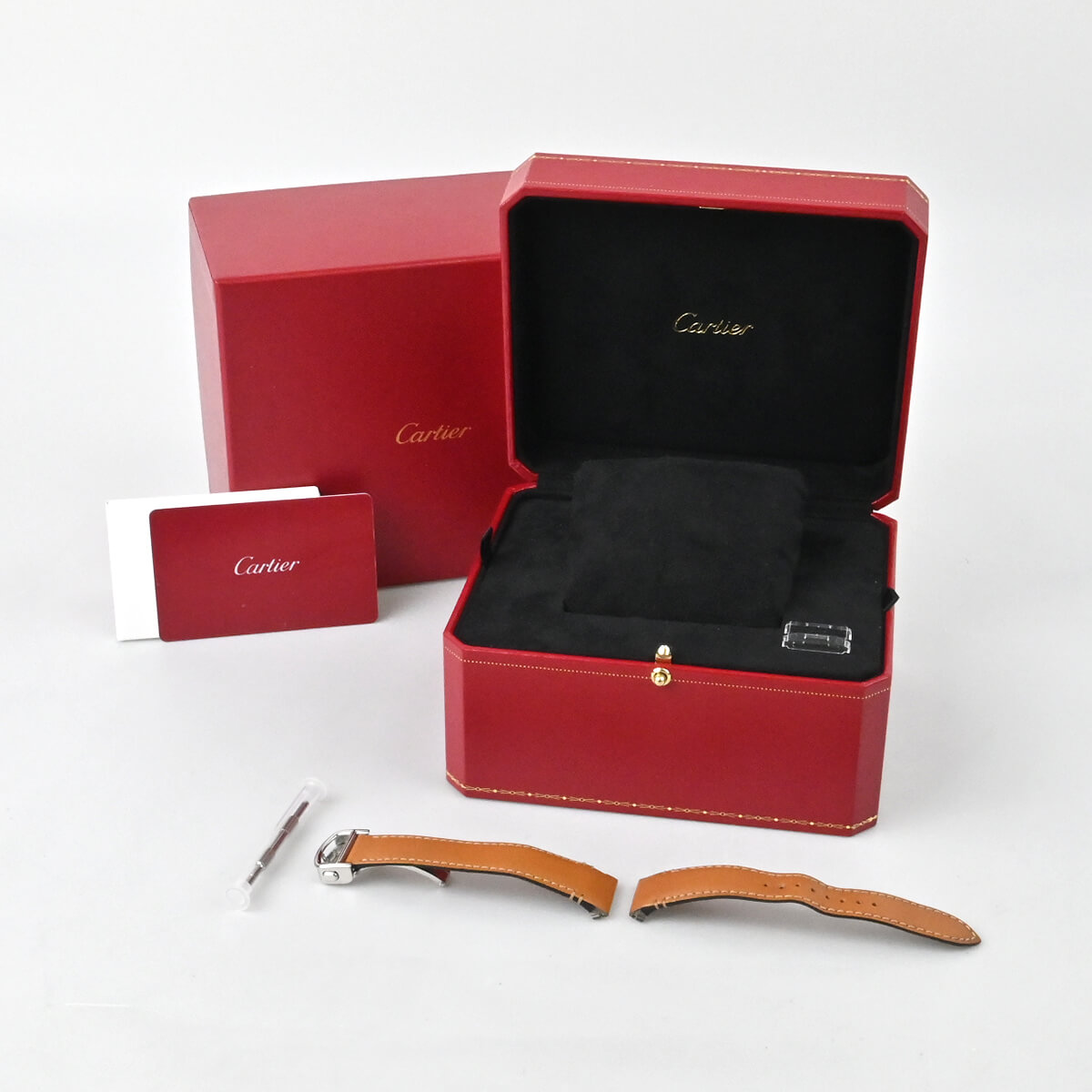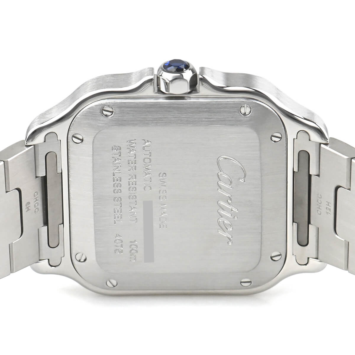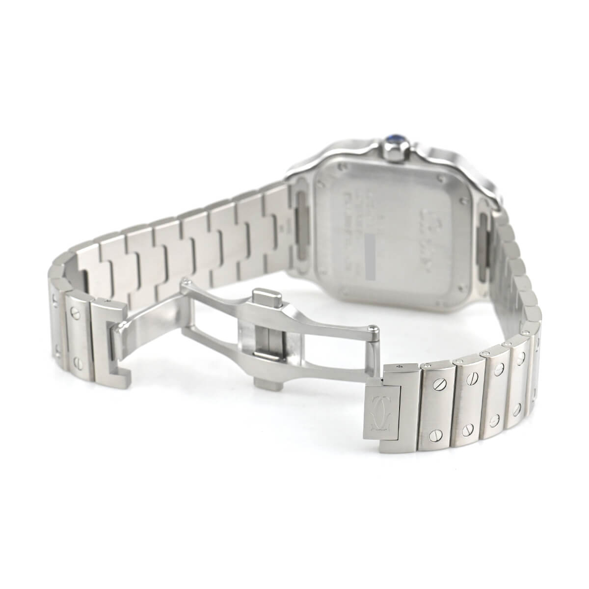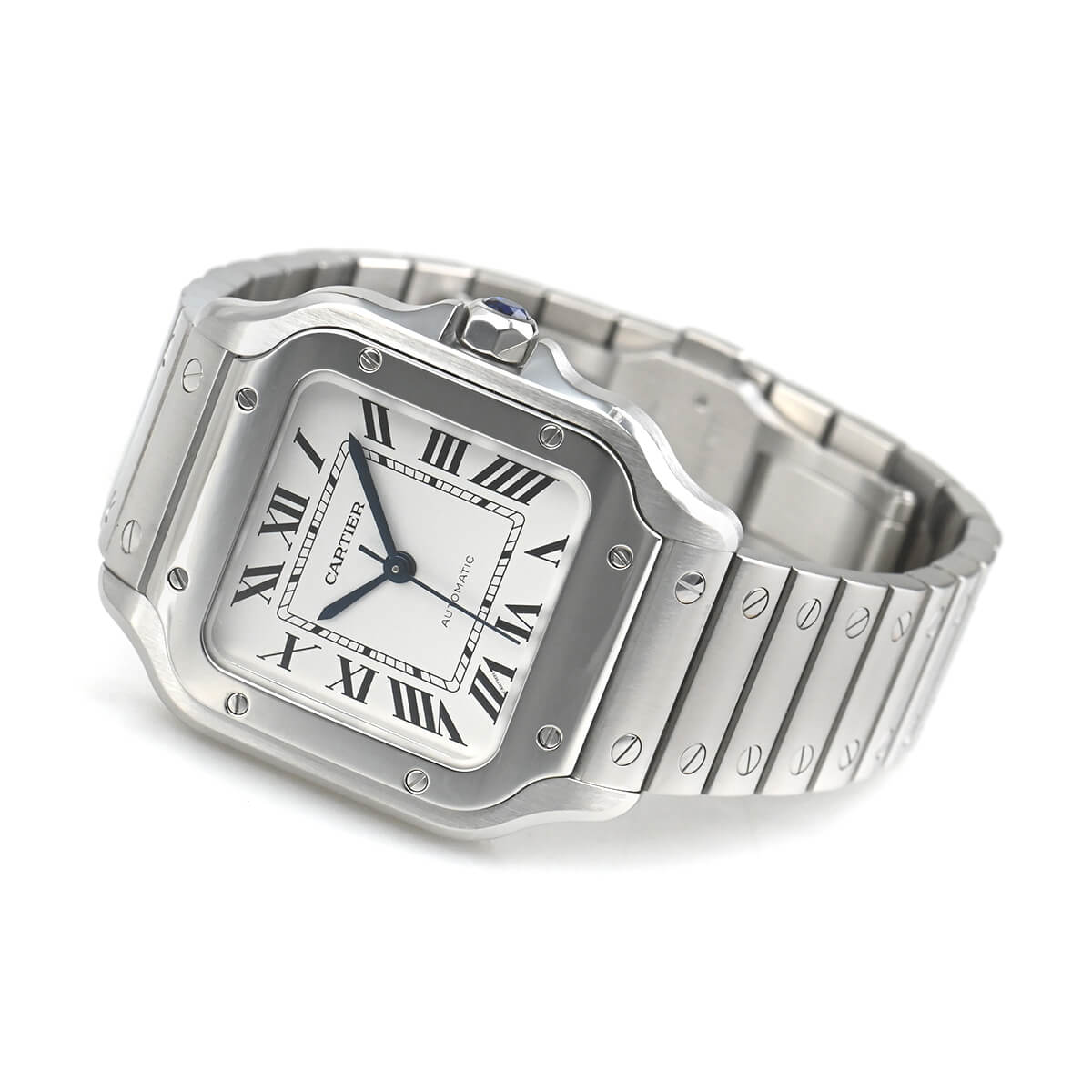 1904年、ルイ・カルティエが友人で有名なブラジル人飛行士のアルベルト・サントス・デュモンの飛行中に時刻を確認したいという願いを聞いて製作されたのが「サントスウォッチ」です。こちらはユニセックスサイズのMMサイズとなり、ムーブメントには自社製自動巻きキャリバー1847MCを搭載します。