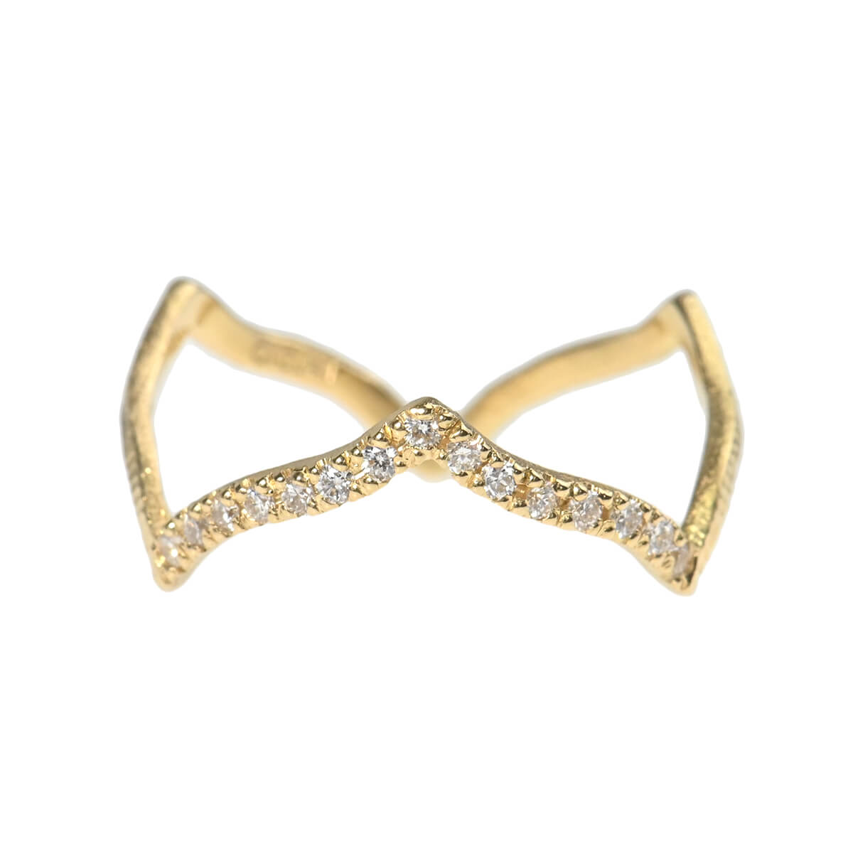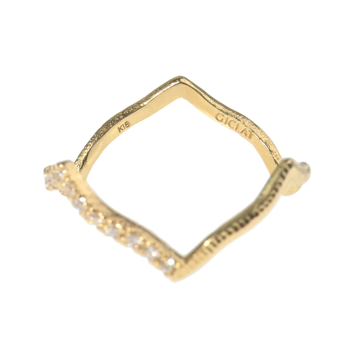 貴金属加工職人を経て、2011年にイタリアの伝統的な彫金技術を身につけるためジュエリーの街フィレンツェへ留学した「麦倉 隆晴」氏が2015年、湘南でスタートさせたドメスティックブランド『GICLAT(ギクラ)』。自然の壮大さやつくりだされる美しいフォルムや文化や技術からインスピレーションを受け、マテリアルと宝石本来の表情を活かした、時代に流されないシンプルでエレガントなジュエリーを展開しています。大きくうねる波から着想を得た、波にキラキラと光が反射する様子を思わせるようなイエローゴールド製「大波」リング。特徴的な曲線のダイヤモンドラインが輝き、様々な角度から光を捉えてきらめきます。職人技が際立つテクスチャーが印象的なアームとダイヤモンドのきらめきのコントラストが、手元をさりげなくもモダンに飾るリングです。