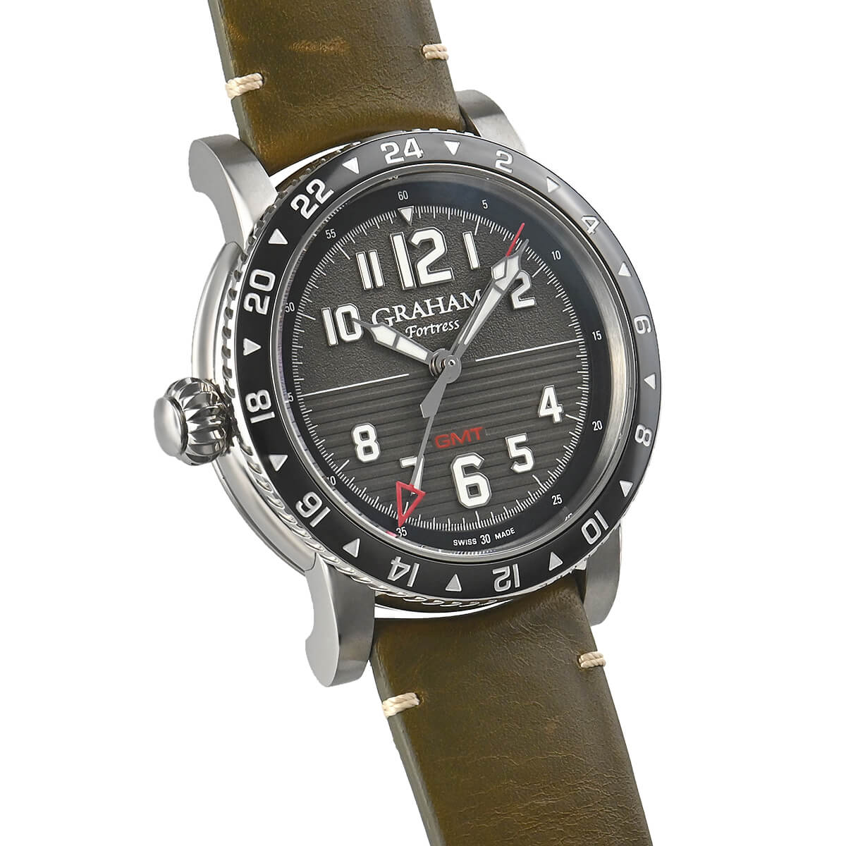 リューズがプッシャーになっており、時針を修正することができる機能が特長の「フォートレスシティGMT」。わざわざ腕から外さないでも、片手で楽にGMT機能が操作ができる優れものです。