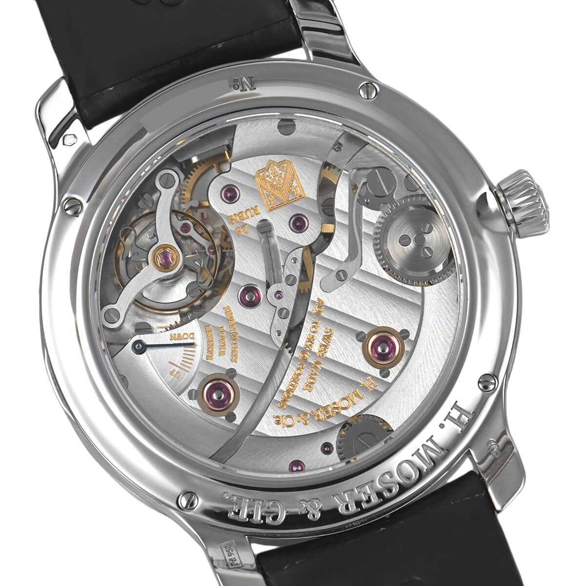 パラジウムのラウンドケースに手巻き式の自社製ムーブメントHMC343を搭載した「エンデバー・センターセコンド」。独自のモジュール型脱進機や巻上げ機構に独特のメカニズムである傘歯車を採用するなど、見所の多い自社キャリバーには「モーザーシール」と呼ばれる紋章が刻印されています。