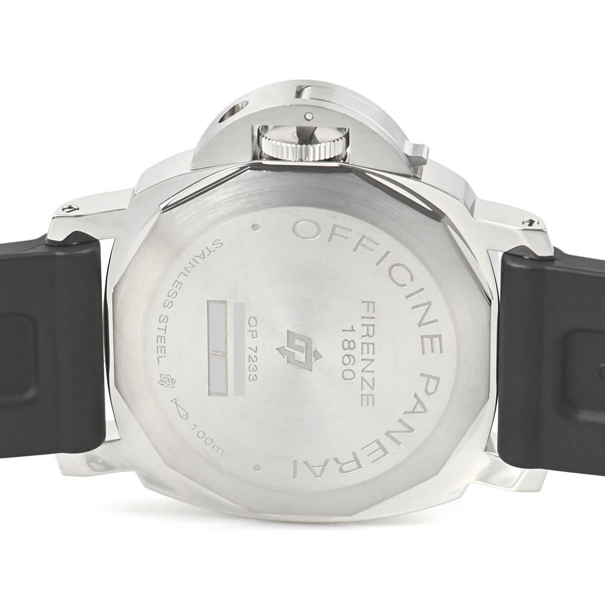 V番“2019年製”【PAM00776】ルミノールマリーナ ロゴ 3デイズ アッチャイオが入荷しました。文字盤の6時位置にプリントされた「OP」ロゴが特徴のロゴシリーズで、3日間のパワーリザーブを備えた自社製キャリバー「P.6000」を搭載しています。