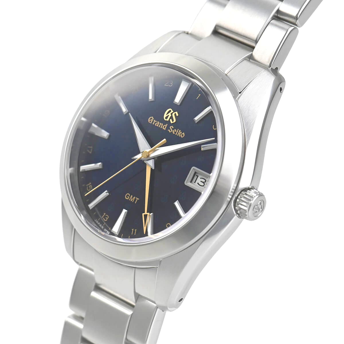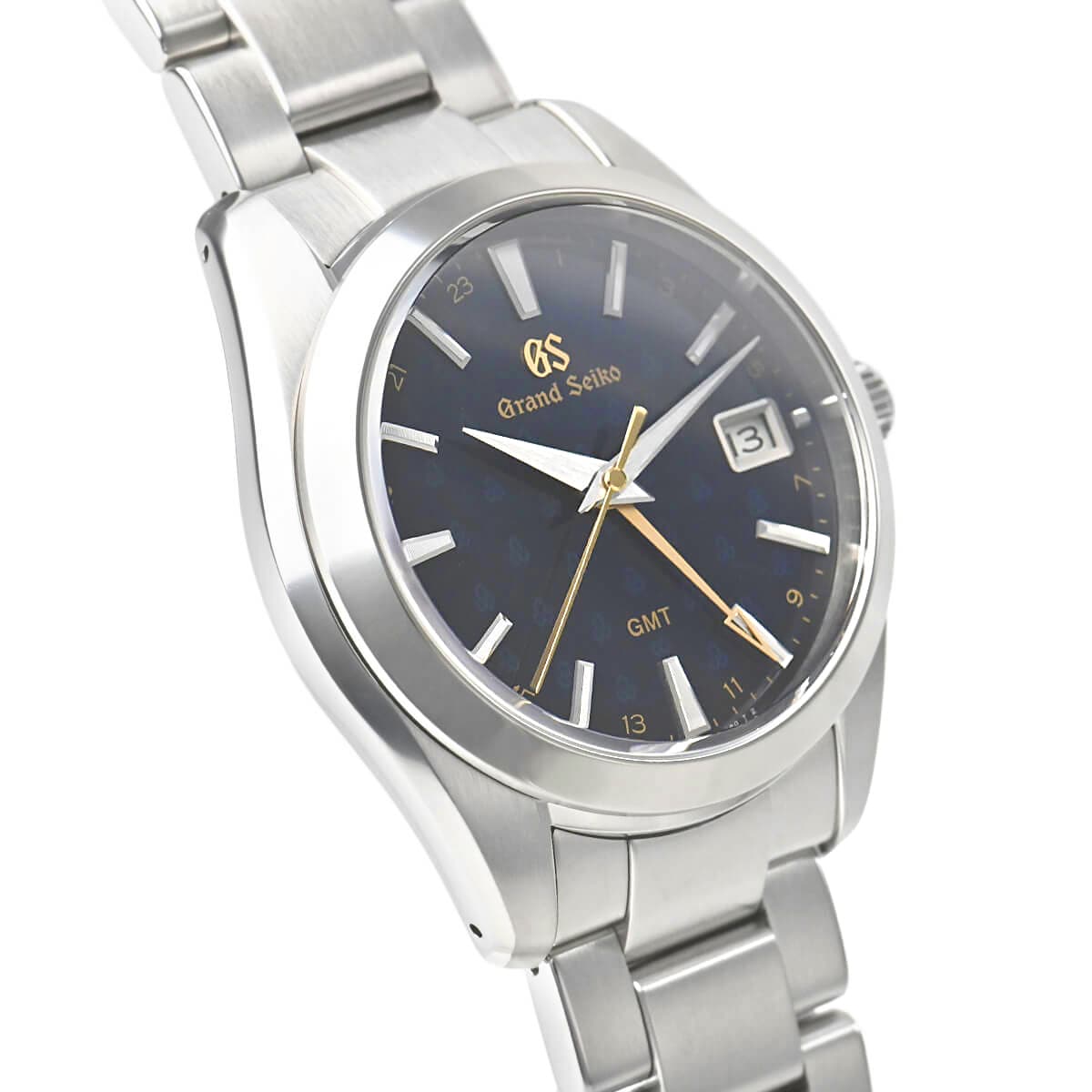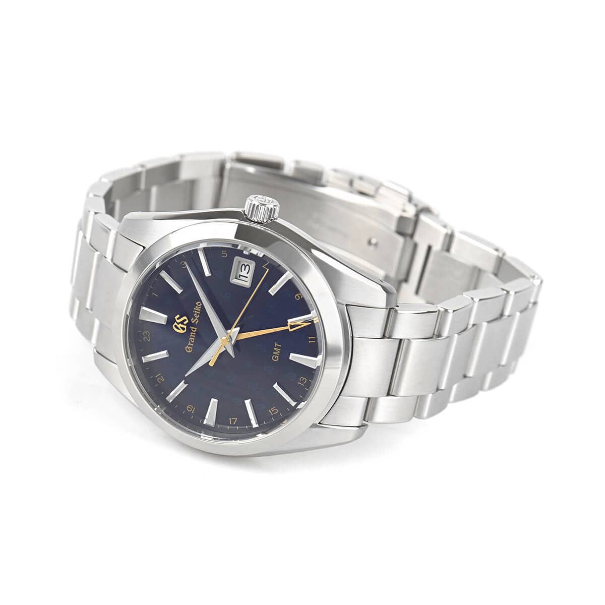 大きな特徴となるダイヤルはGSブルーにクォーツマークを全面にプリントした限定仕様となっており、そこに輝く金色のGMT針・秒針・GSロゴが高級感を引き立たせています。
