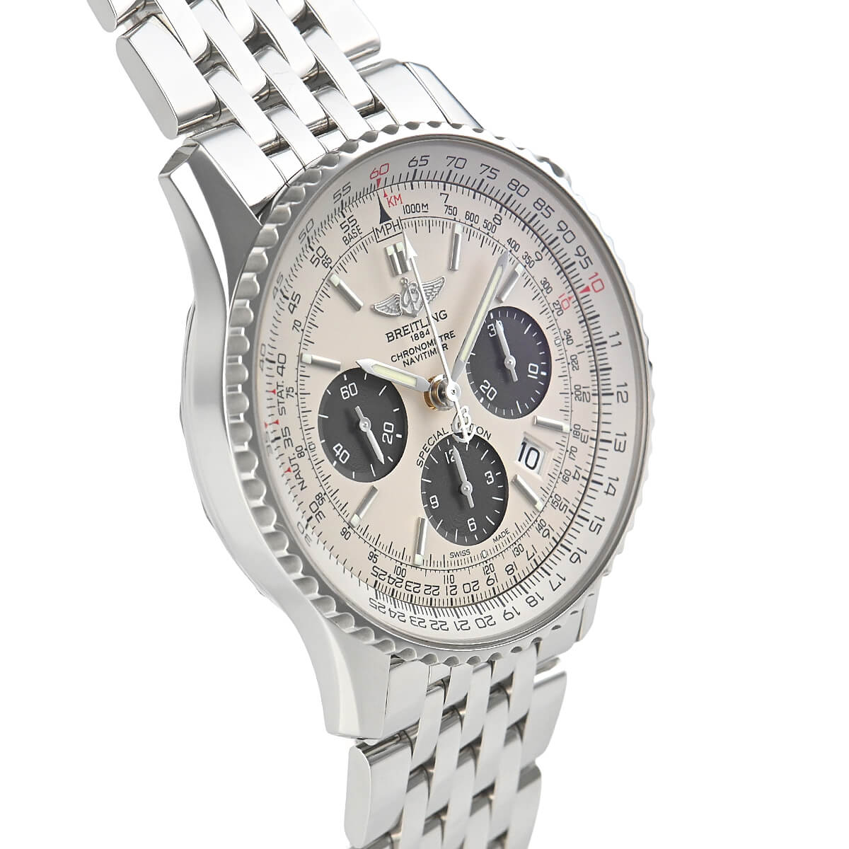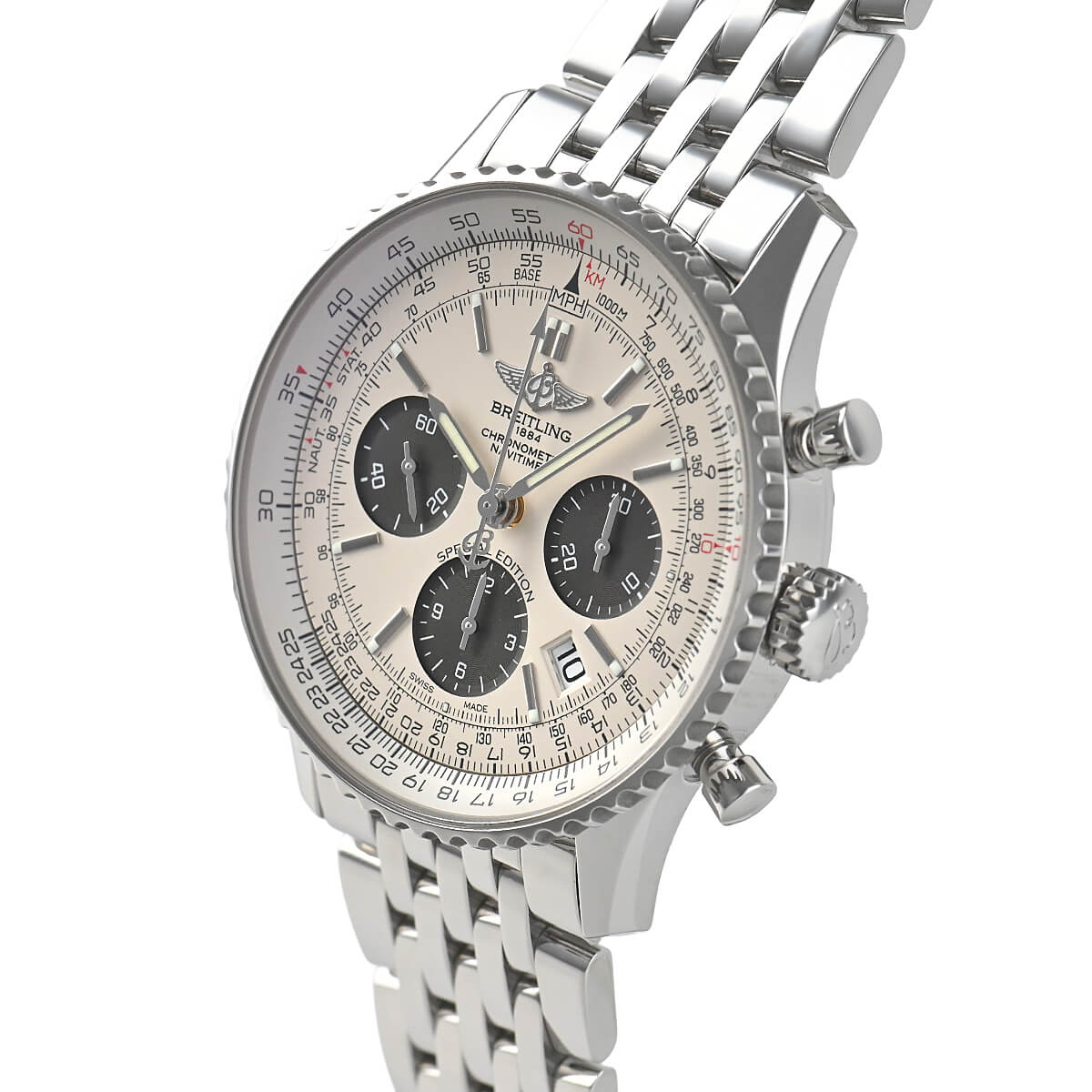 自社開発ムーブメントの「キャリバー01」を搭載したブライトリングの看板モデル「ナビタイマー」。こちらはシルバーの文字盤にグレーのインダイアルを配した日本特別仕様の「ナビタイマー01 シルバーグレイ」です。