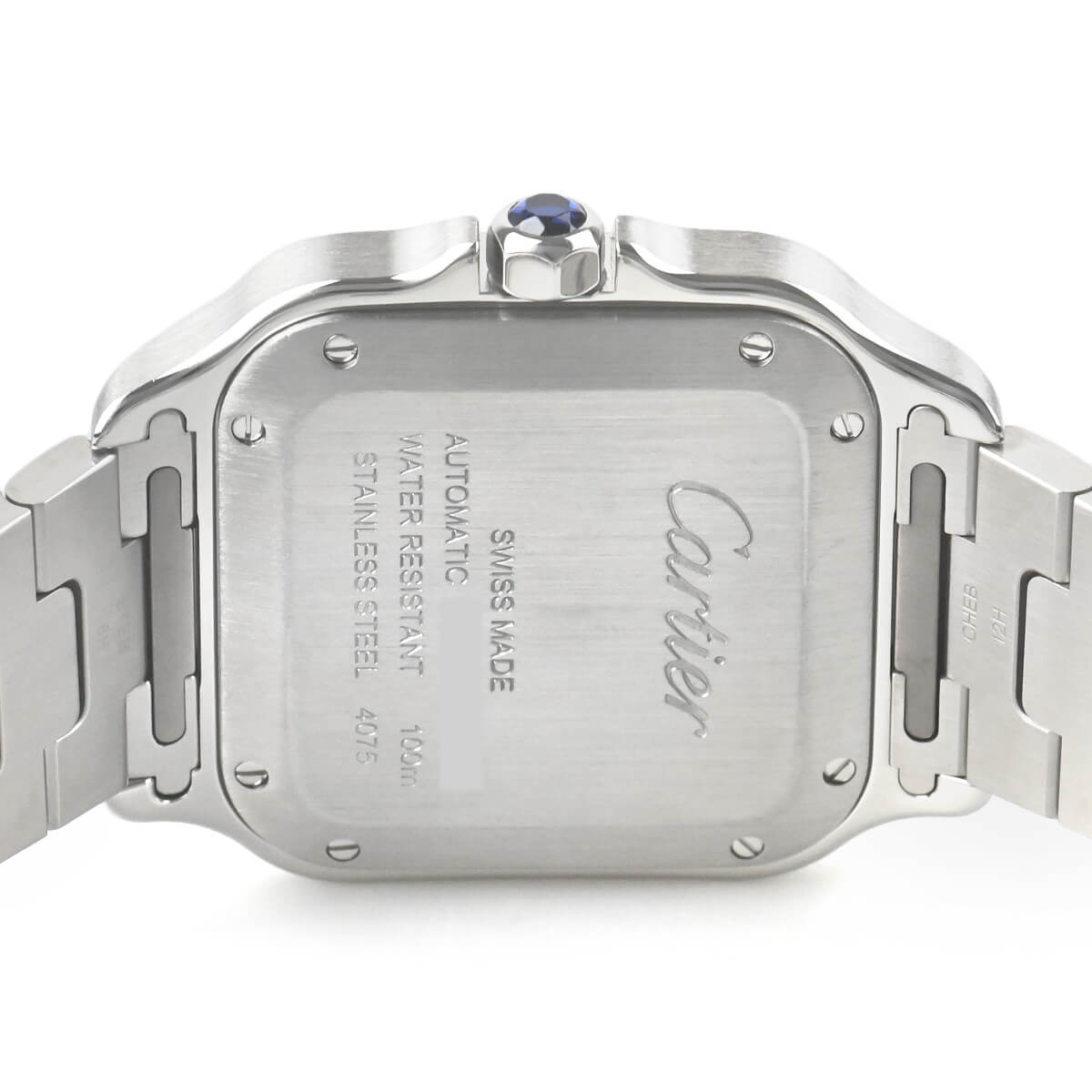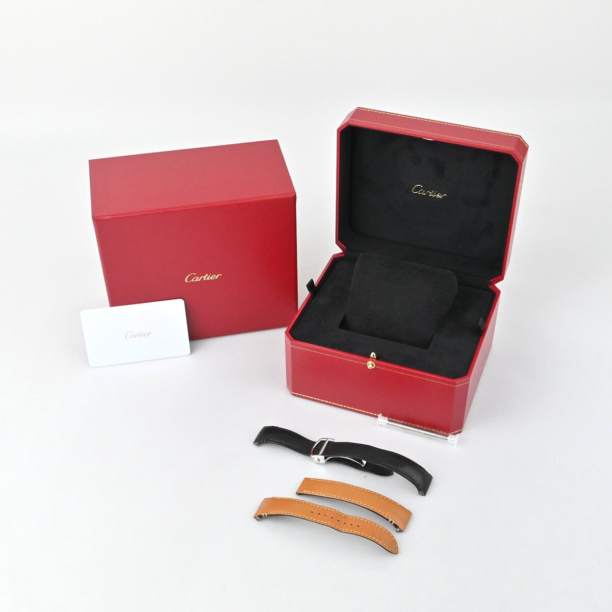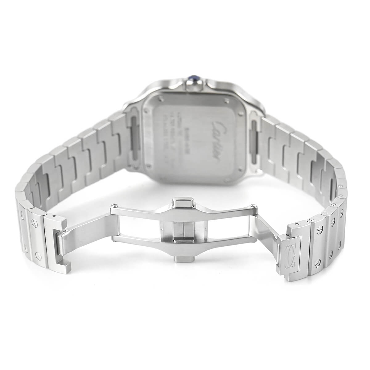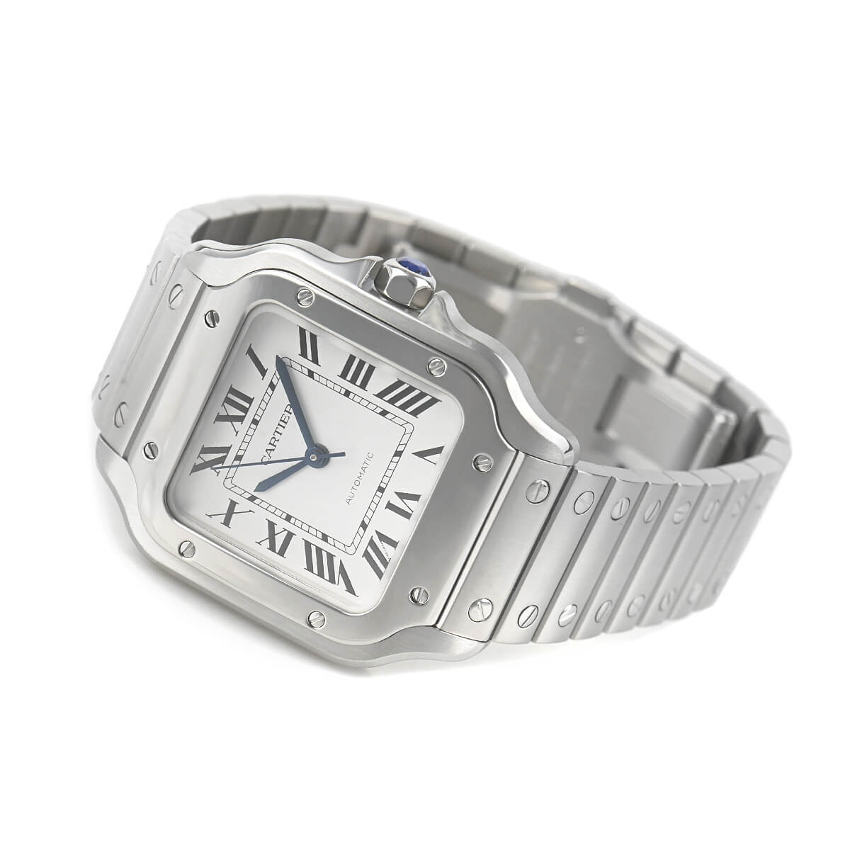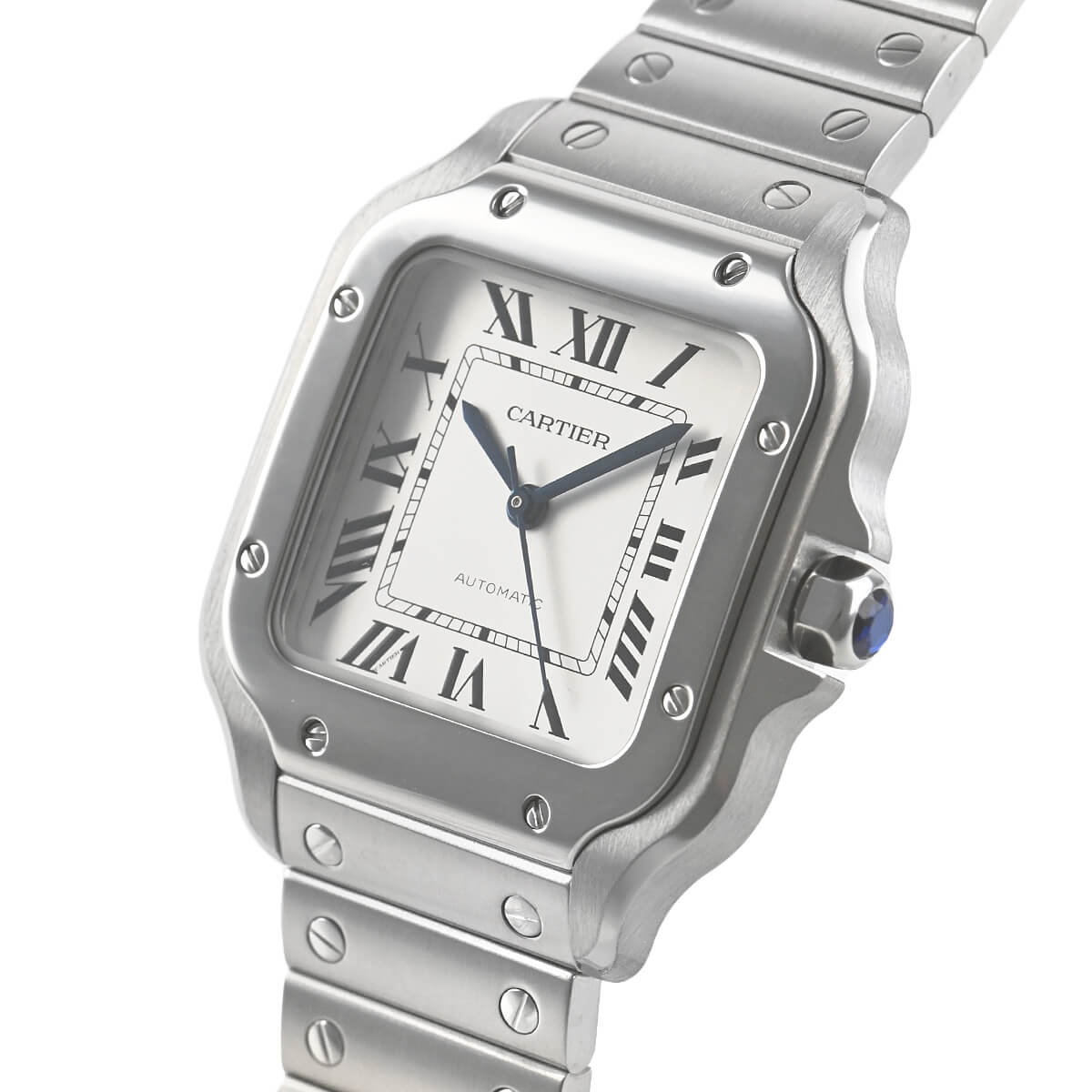 1904年、ルイ・カルティエが友人で有名なブラジル人飛行士のアルベルト・サントス・デュモンの飛行中に時刻を確認したいという願いを聞いて製作されたのが「サントスウォッチ」です。こちらはユニセックスサイズのMMサイズとなり、ムーブメントには自社製自動巻きキャリバー1847MCを搭載します。