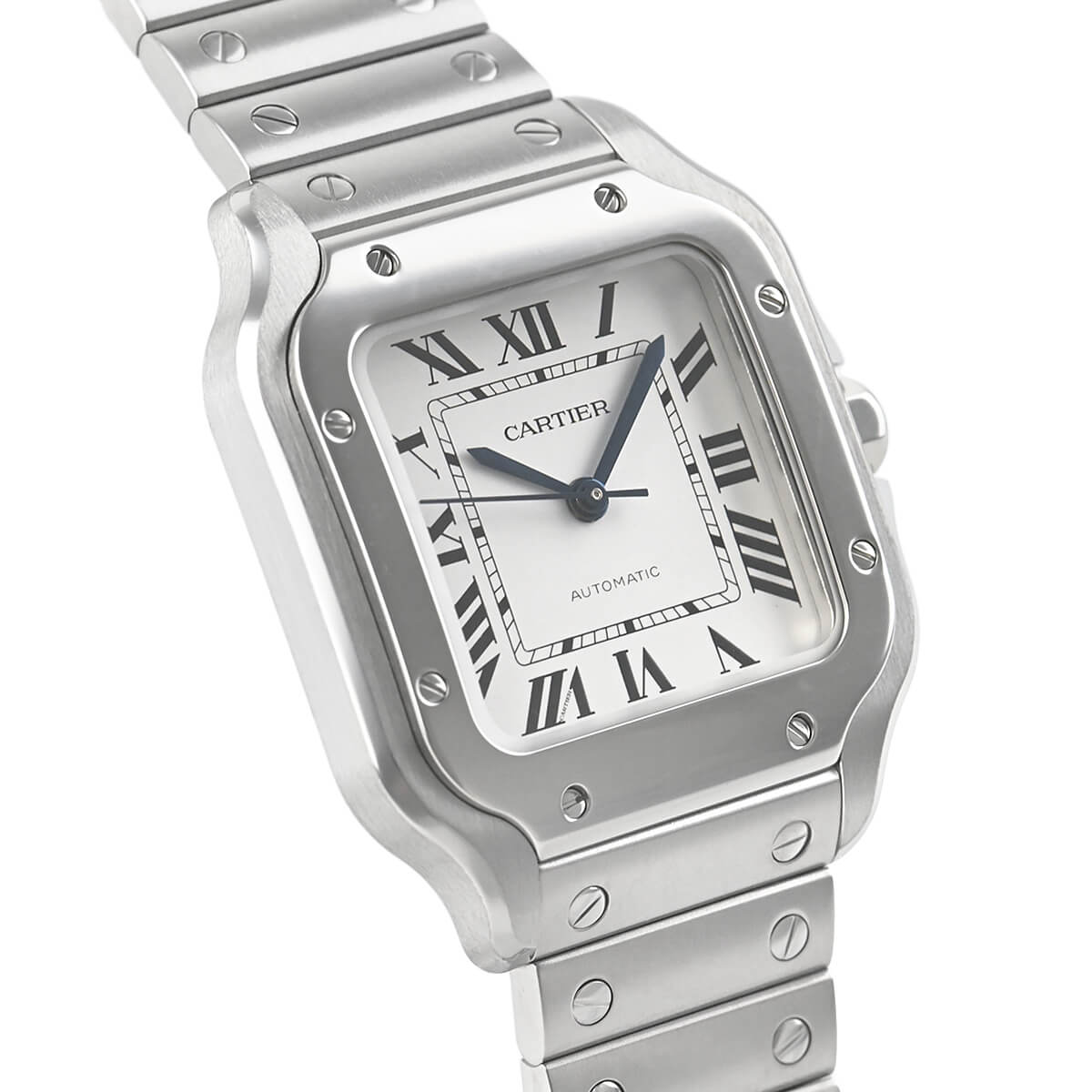 文字盤のローマインデックスとその内側に描かれた四角のレイルウェイ分目盛はカルティエウォッチを特徴づけ、またケースとブレスレットにはサントスウォッチ特有のビスモチーフが施されます。