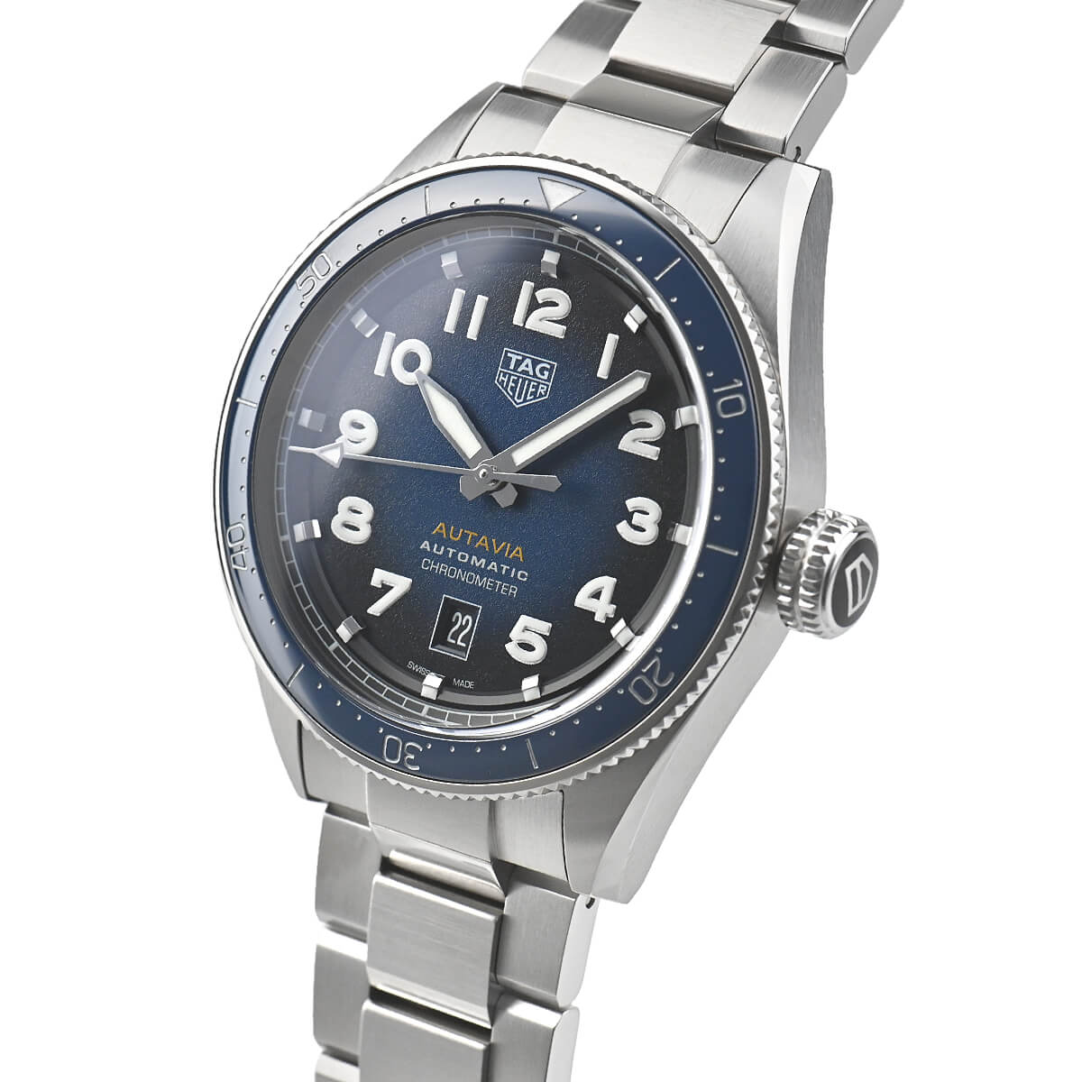 【オータヴィア】は、もともと自動車を意味する「AUTOMOBILE」と飛行を意味する「AVIATION」を組み合わせた造語で、元来は1933年に誕生したコックピットに取り付けられたダッシュボードタイマーを指します。こちらの【オータヴィア キャリバー5 クロノメーター】は、文字盤にはブルーグラデーションのダイアルを採用し、ベゼルプレートには現代的なセラミックを取り入れています。