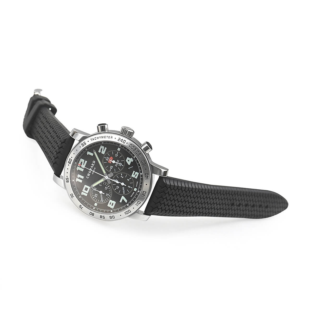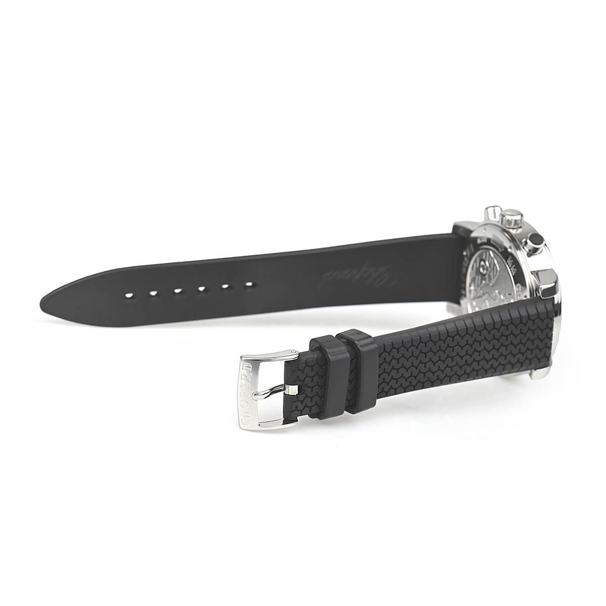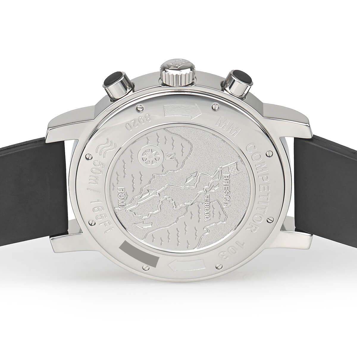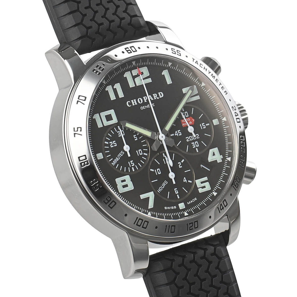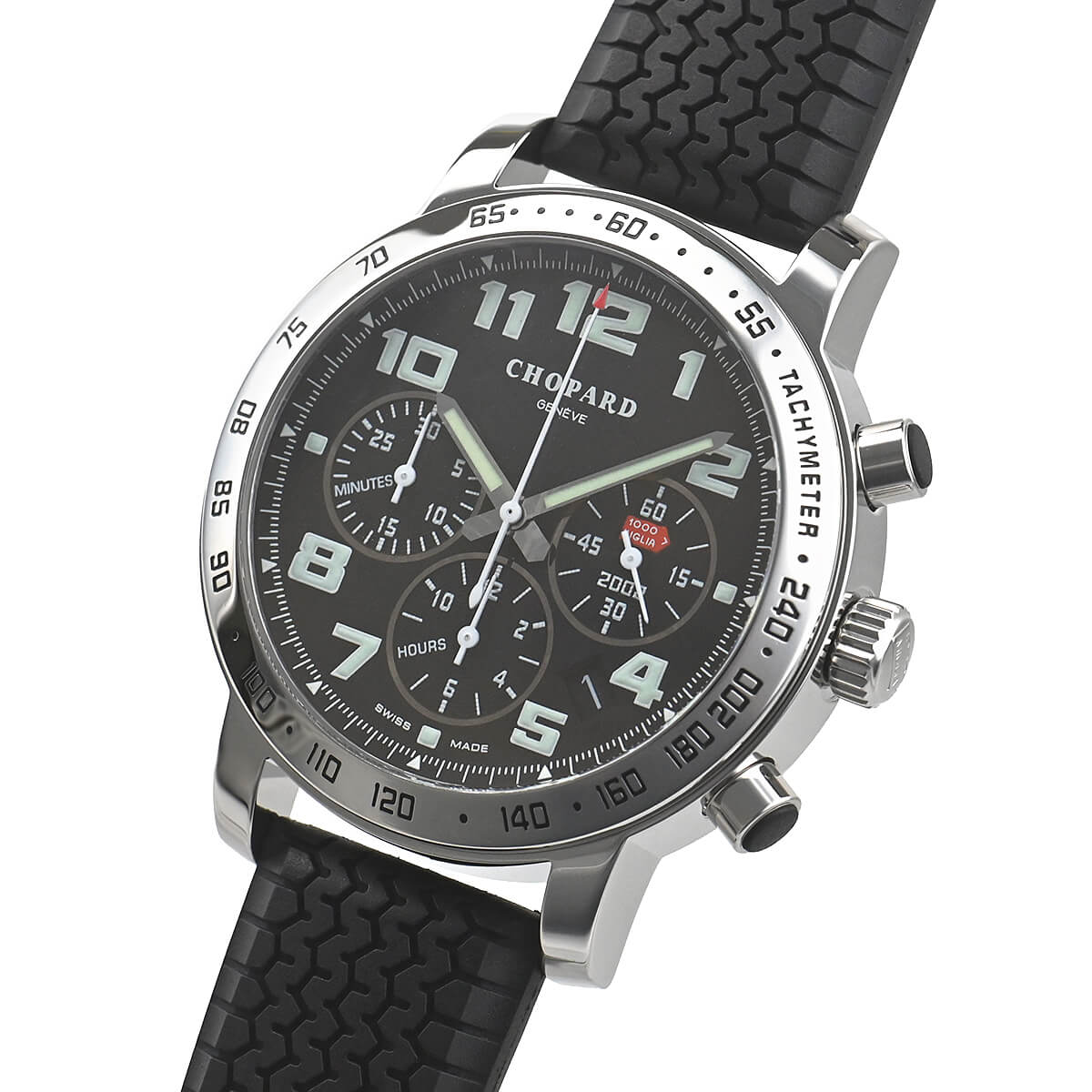 有名なヴィンテージカー・レースであるミッレミリアを記念して作られたモデル「ミッレミリア クロノグラフ」。ダイヤルにはその名の由来になった1000mile(ミッレミリア)がデザインされており、純正のラバーベルトは1960年代にダンロップが製作したレーシングタイヤのトレッドをイメージしております。