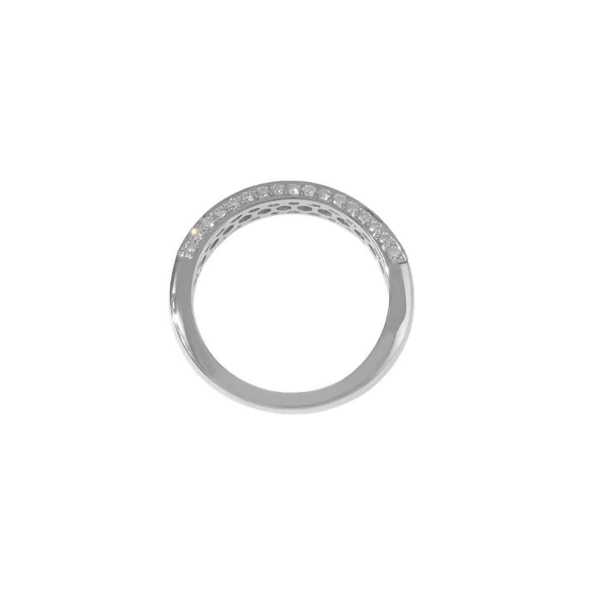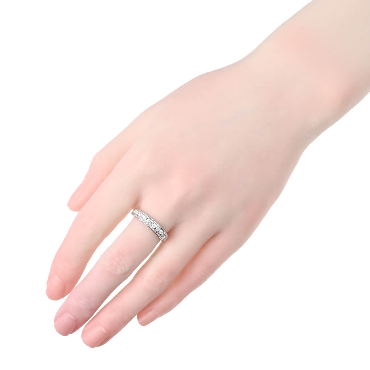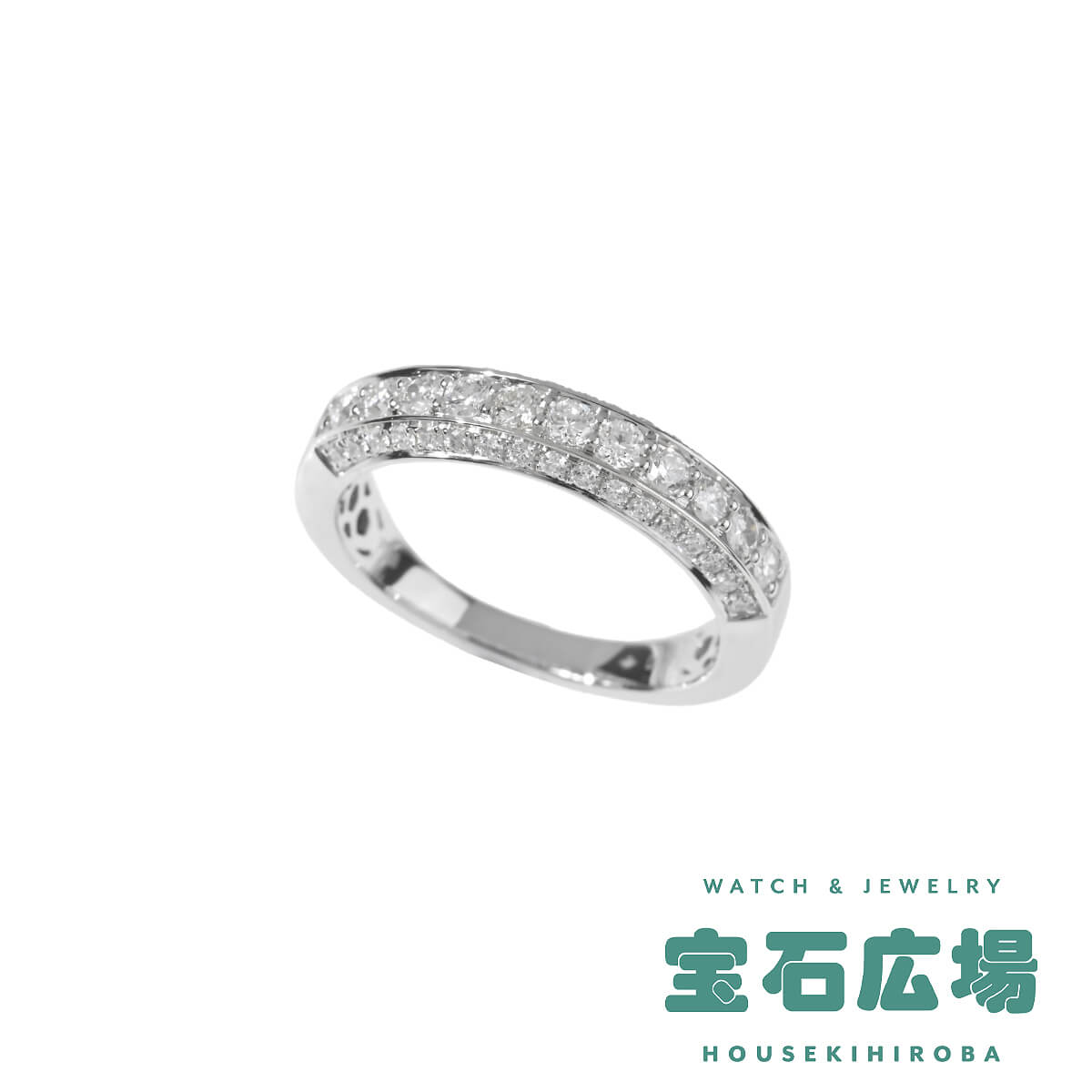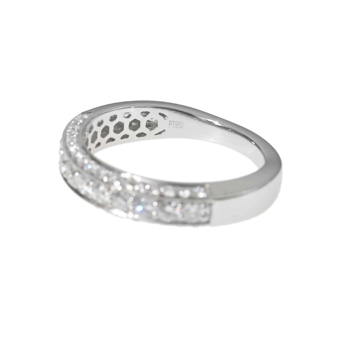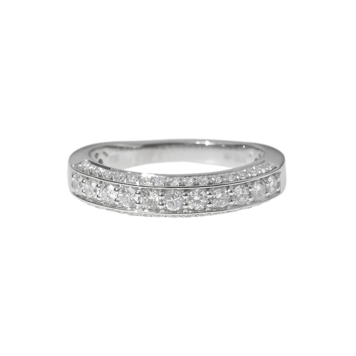 トータル0.70ctのダイヤモンドが並ぶ、プラチナ製ハーフエタニティリング。定番の1列ではなく、アームの上下面にもダイヤモンドを並べたリングは、どの角度から見てもストーンそのものの存在感ときらめきを楽しめますね。どことなく構築的なデザインが印象的で、洗練されたシャープな雰囲気をもつ、シンプルで美しいダイヤモンドリングです。
