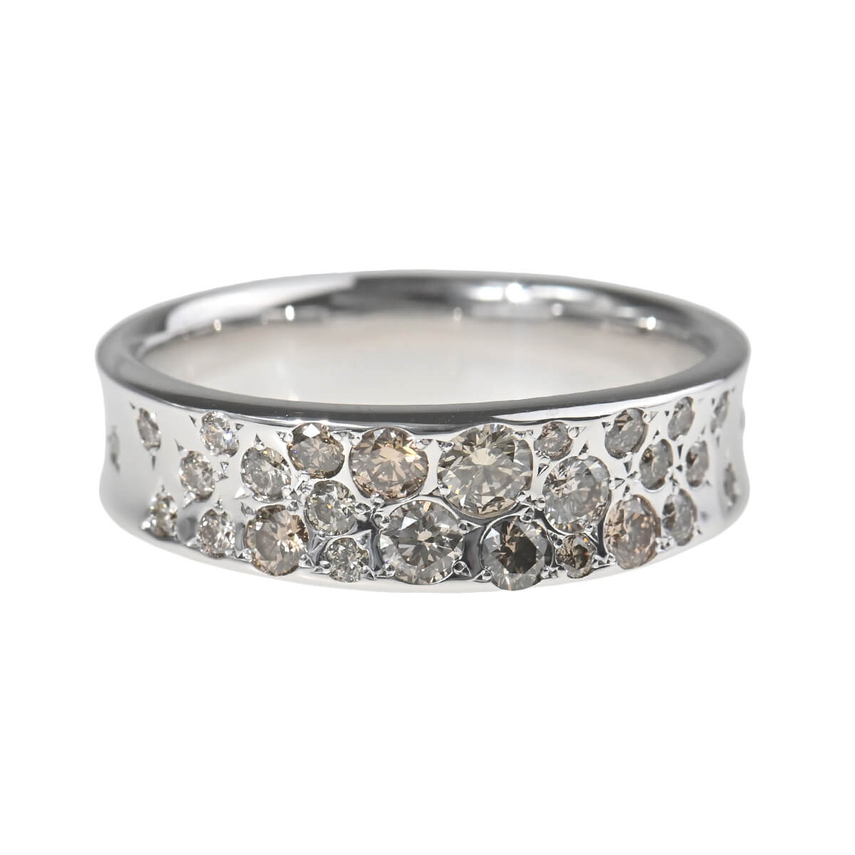 ブラウンダイヤモンドならではの深みのある輝き、天然ダイヤモンドならではのキラキラと透明感のある煌めきに、個性を引き立てるデザインと丁寧なつくりにこだわり、無色透明のダイヤモンドにはない魅力を追求し、ナチュラルカラーダイヤモンドの可能性を広く提案し続けている、ダイヤモンドのトータルカンパニー「株式会社 柏圭」のオリジナルブランド『KASHIKEY(カシケイ)』。ブラウンダイヤモンドを知り尽くした職人の技が光る、「メランジェ」コレクションのホワイトゴールド製リングです。程よいボリュームを感じるアームに、サイズや濃淡のバリエーション豊かなブラウンダイヤモンドが巧みに配され、光を纏ったブラウンダイヤモンドが煌めいて鮮やかに指先を印象づけます。指にすんなりと馴染む極上の装着感とエレガンスを湛えて、洗練された個性を纏ったリングです。