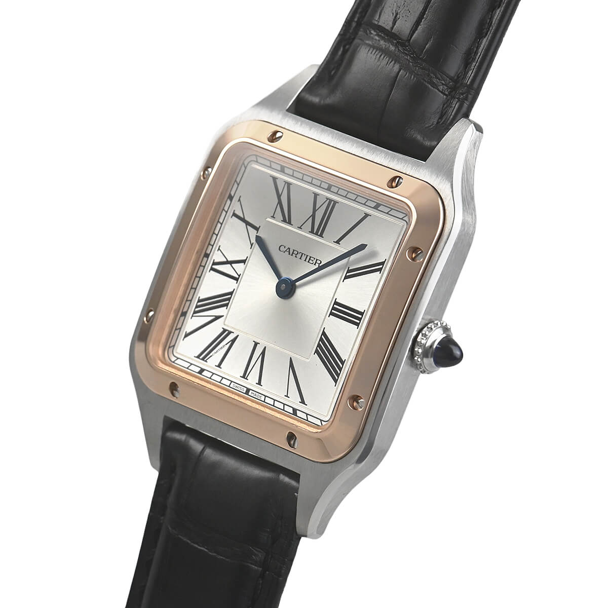 文字盤のローマインデックスとその外周に描かれた四角のレイルウェイ分目盛はカルティエウォッチを特徴づけ、またピンクゴールドのベゼル部分にはサントスウォッチ特有のビスモチーフが施されます。