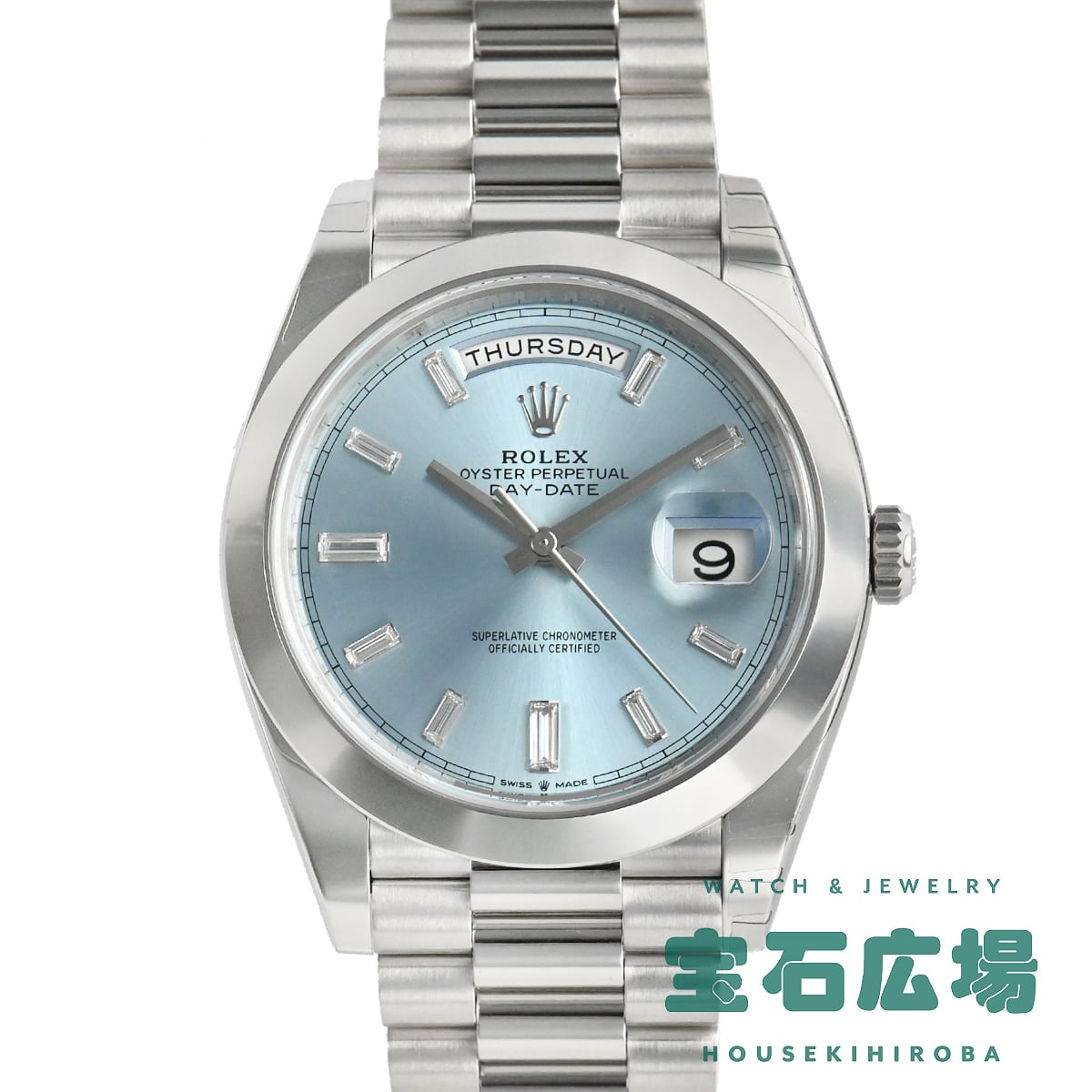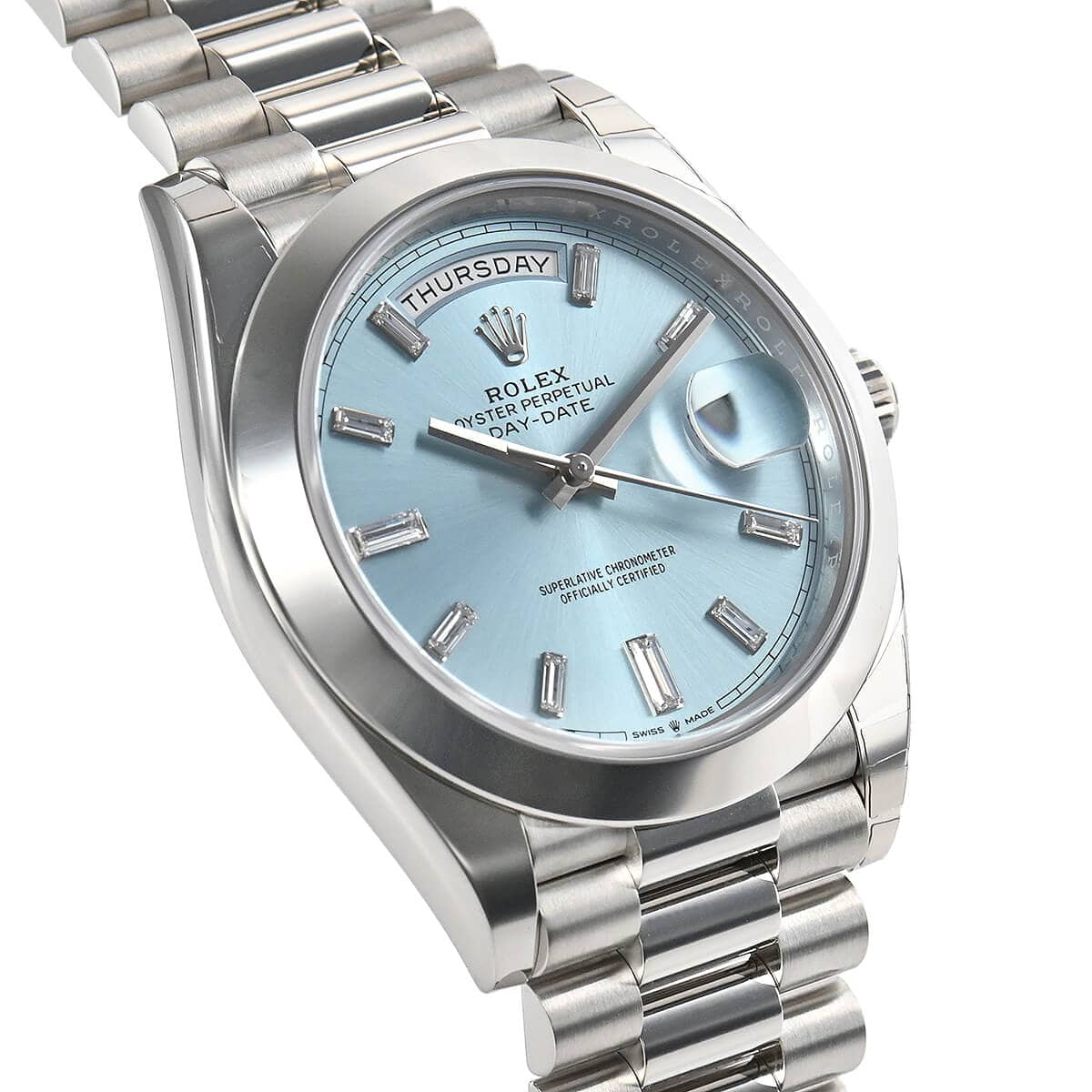 デイデイトIIより1mmダウンサイジングした40mmケースの【オイスターパーペチュアル デイデイト40】。こちらはプラチナモデルとなり、文字盤はアイスブルー/10ポイントバゲットダイヤです。