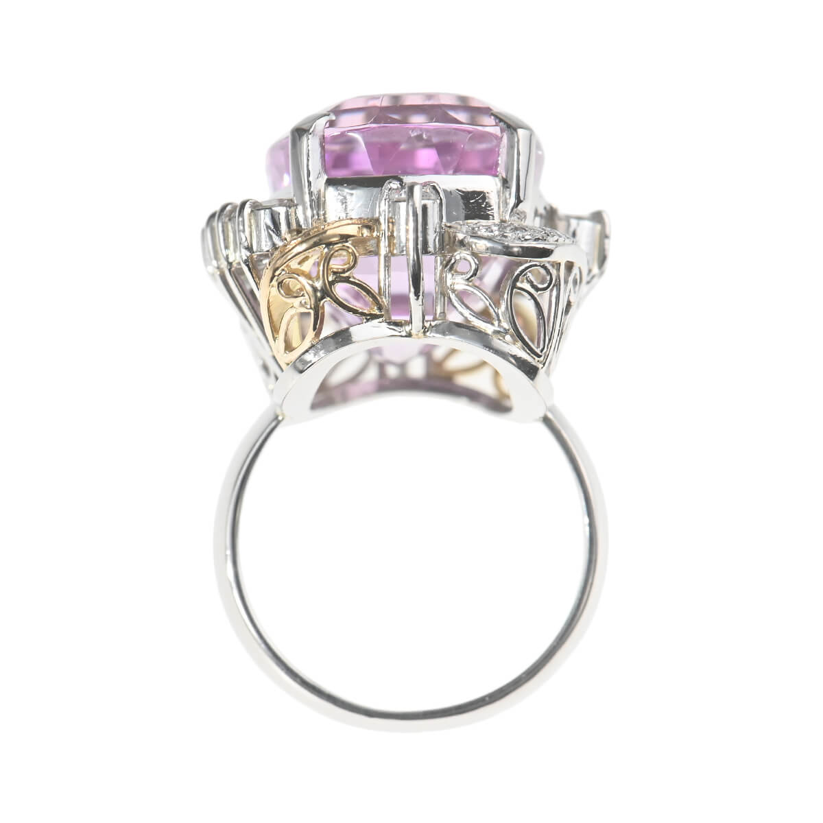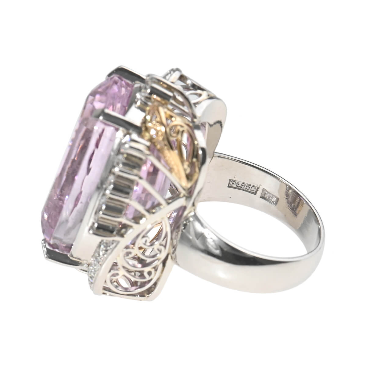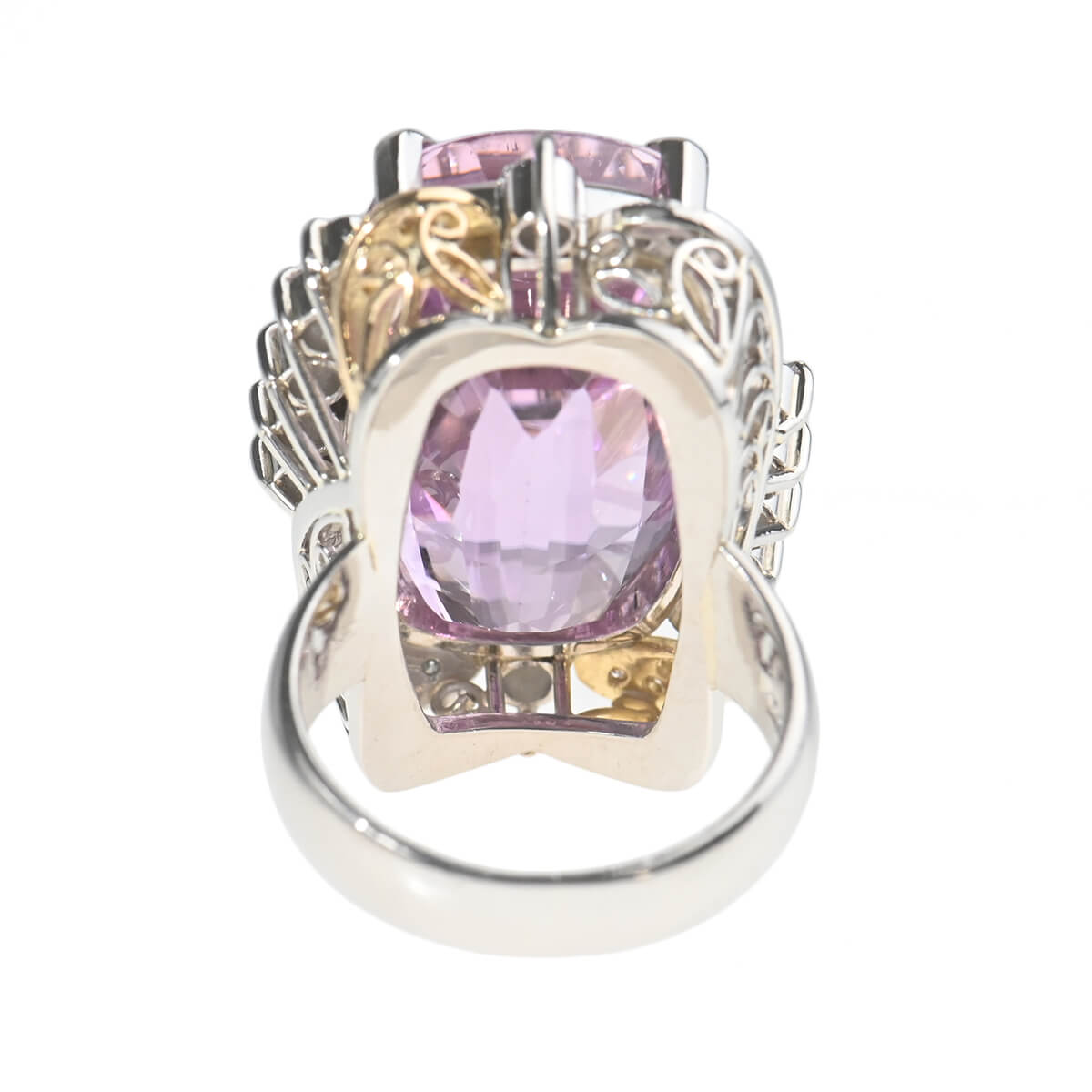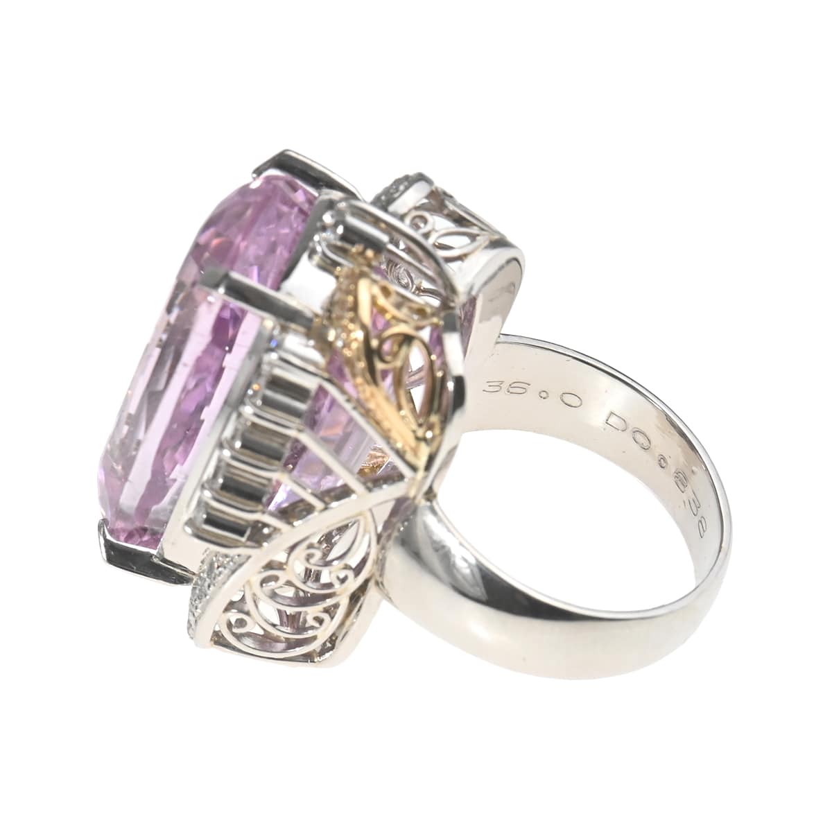 発見者であるクンツ博士に由来してその名が付けられたと言われている、ギリシャ語で“燃えて灰になる”を意味する鉱物「スポデュメン」の一種である「クンツァイト」。見る者の心を癒し和らげてくれる、愛にあふれた上品で清楚なライラックピンクが美しい天然石です。透明感溢れる上品なライラックピンクが美しいクンツァイトを、繊細で芸術的なデザインで囲んだリング。繊細なきらめきにあふれたダイヤモンドがクンツァイトの色彩を一層惹きたてて、スタイリングを瑞々しく彩ります。どこからみても美しく見える、職人のこだわりが感じられるボリュームリングは、上質カジュアルからドレスアップにはもちろん、和装でのコーディネートも素敵です。