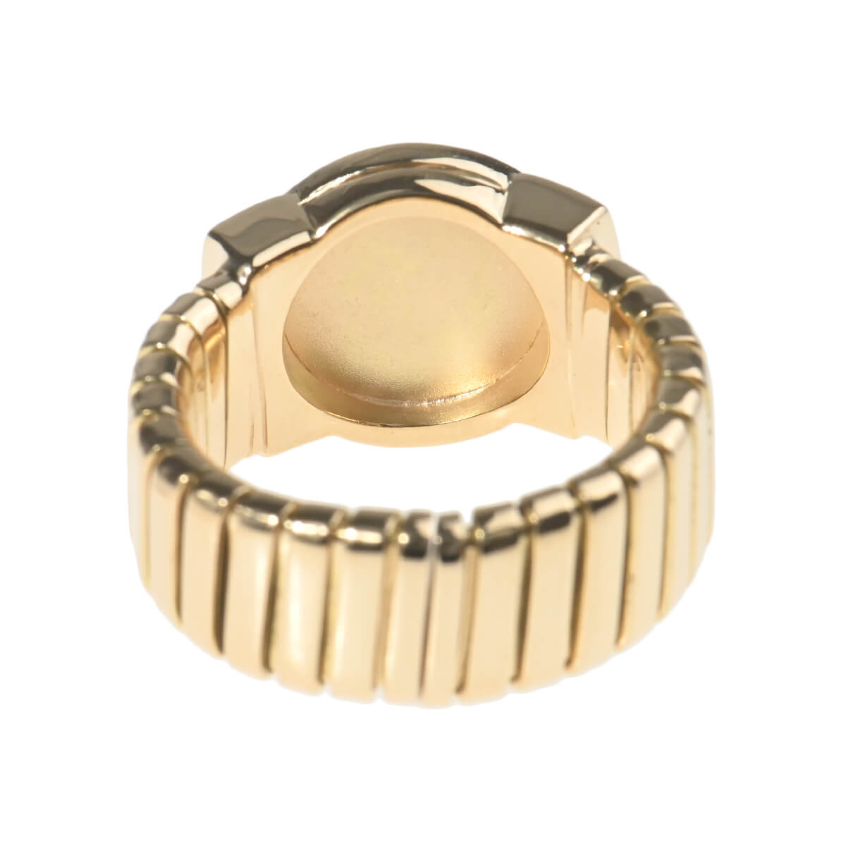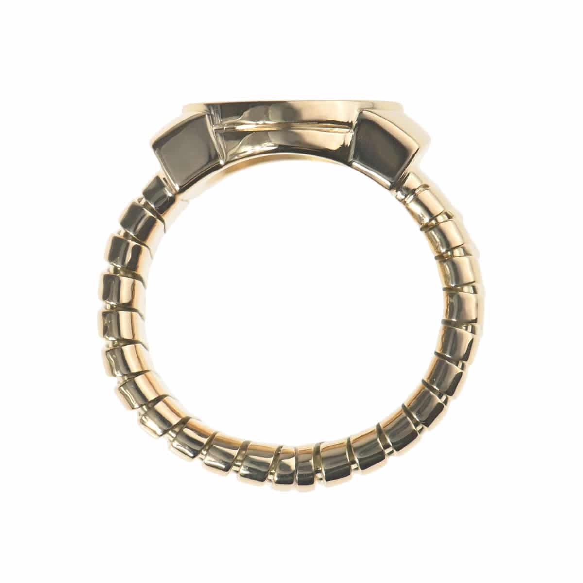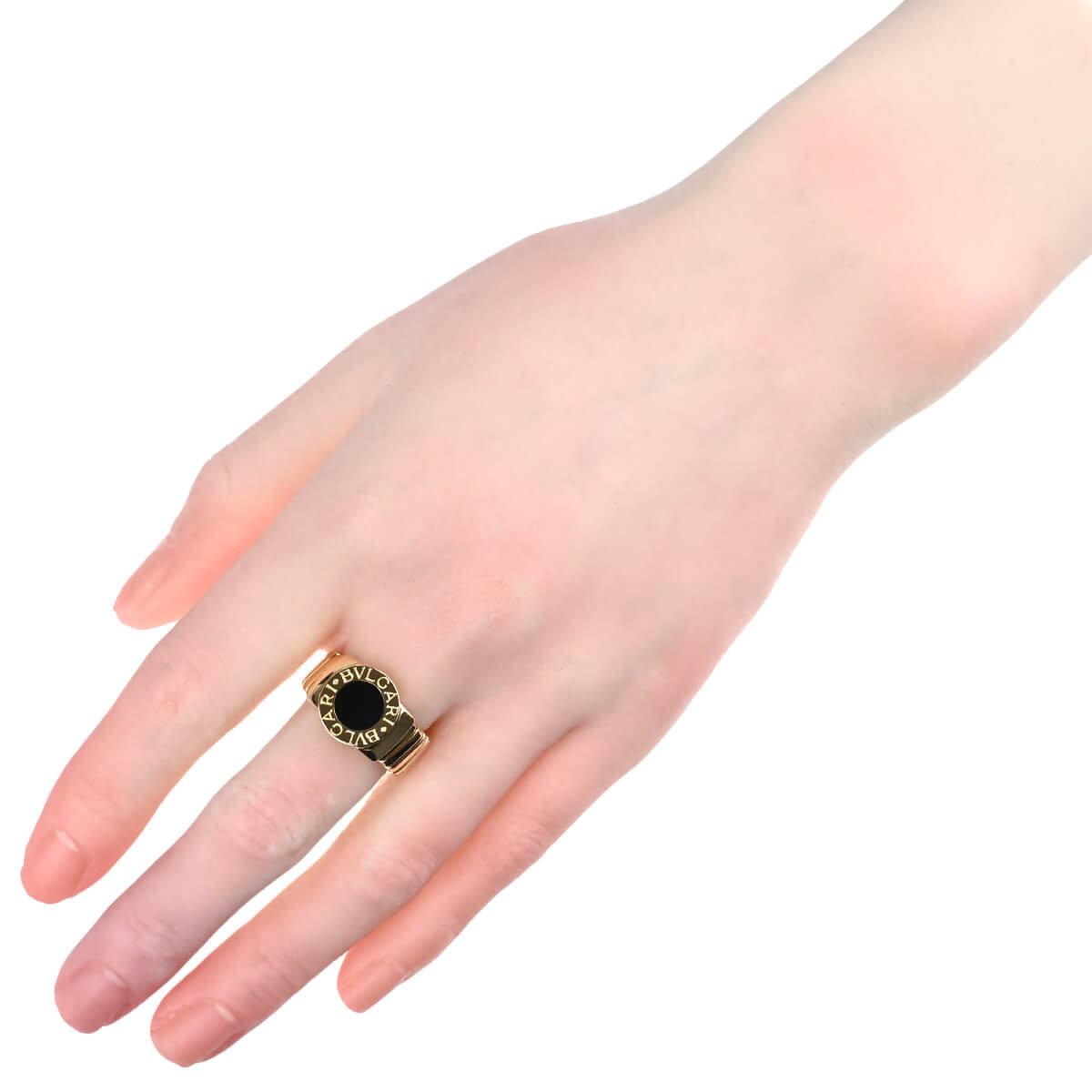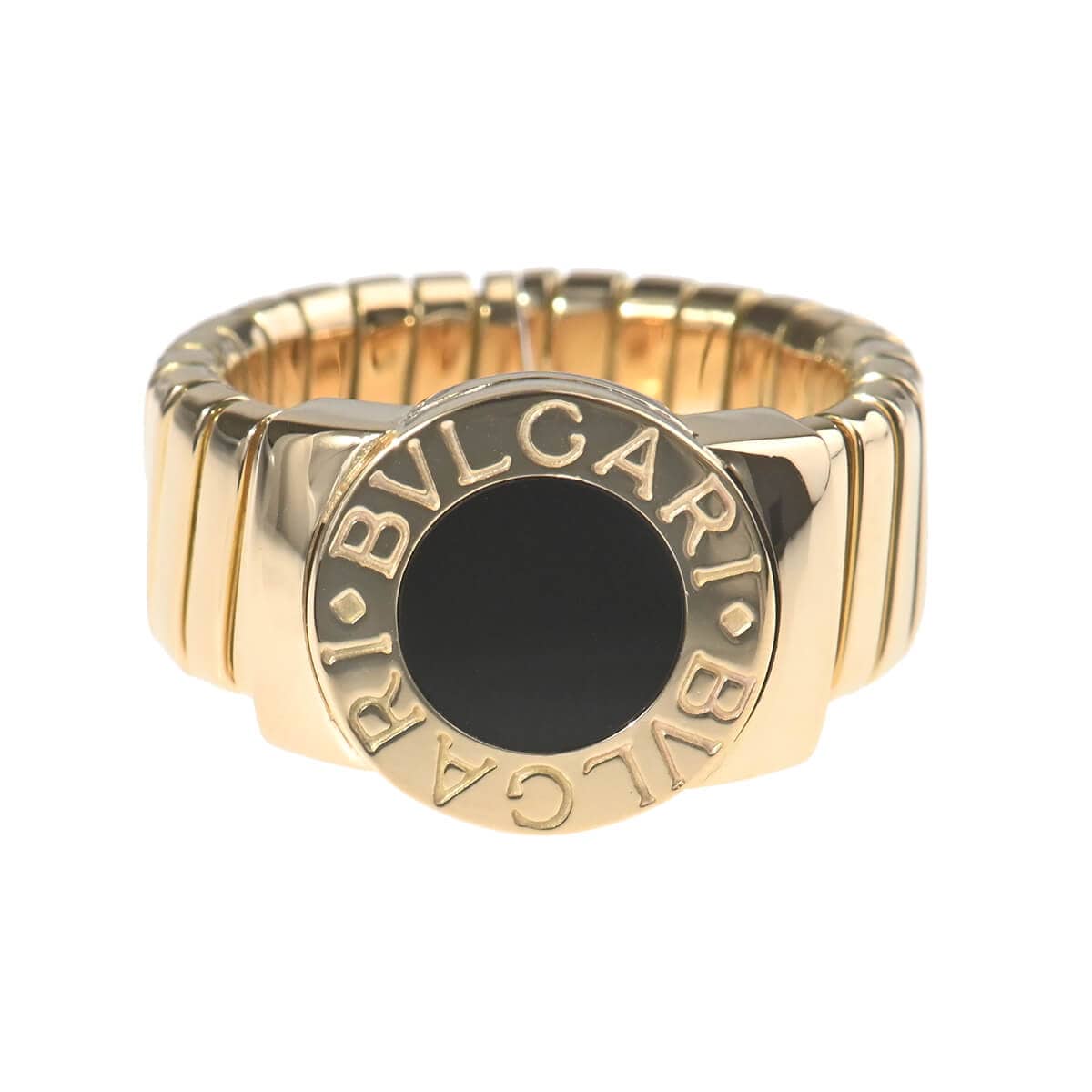 シンプルながら『BVLGARI(ブルガリ)』らしさも感じられる定番「ブルガリブルガリ」コレクション。ブランドアイコンともいえるダブルロゴは、古代のコインに施された曲線的な文字からインスピレーションを得て誕生しました。伊語で“ガスチューブ”の意味を持つ「トゥボガス」リングのセンターに、オニキスがセッティングされたブルガリブルガリのダブルロゴモチーフがあしらわれたイエローゴールド製リング。数十年にも及ぶブルガリの宝飾技術により生み出された特殊なスプリングを使用する事により、よりフレキシブルなつけ心地を実現したリングは、素晴らしいフィット感も魅力。ボリュームと洗練を兼ね備え、精巧な技術とイタリアらしいデザインが融合されたブルガリらしいコレクションジュエリーです。