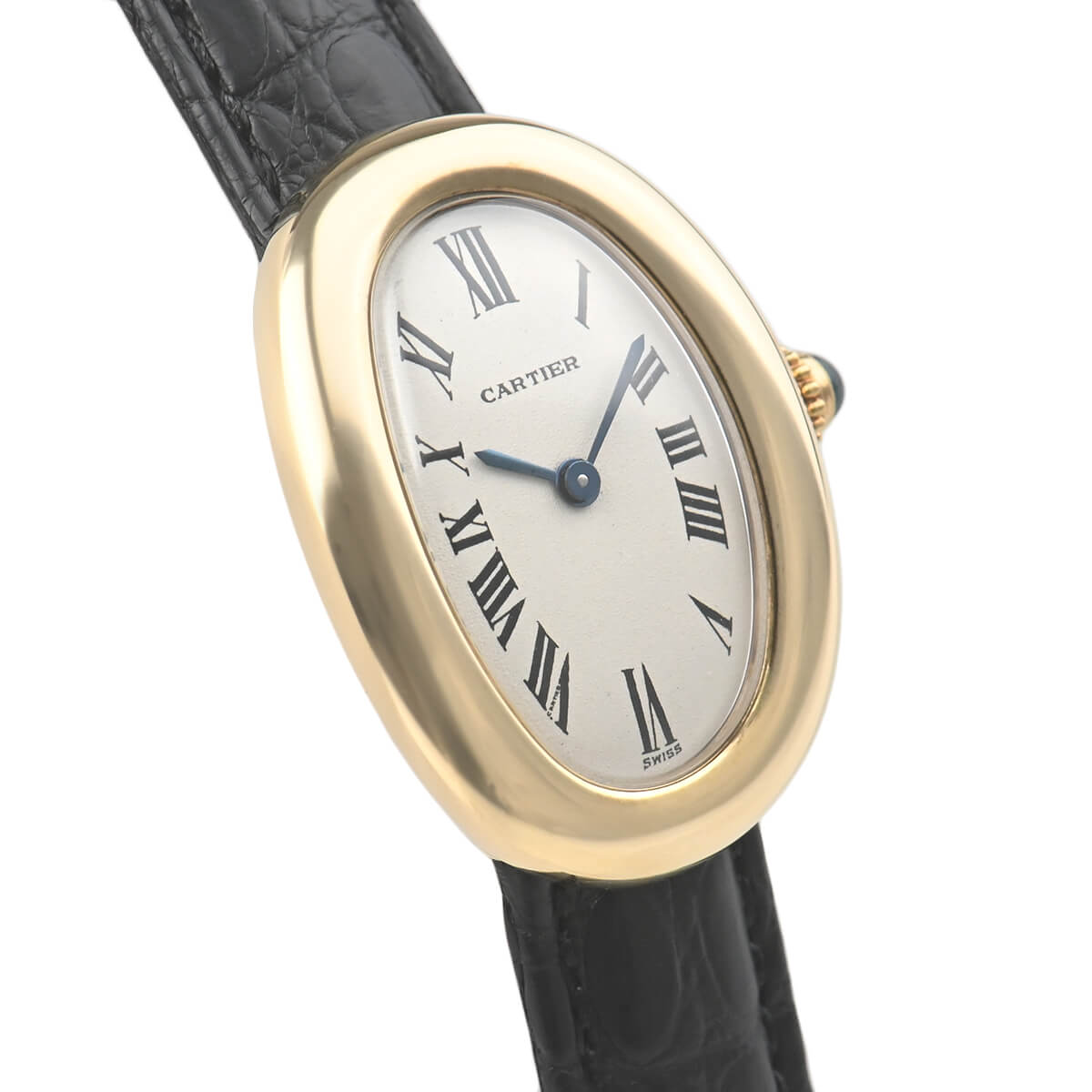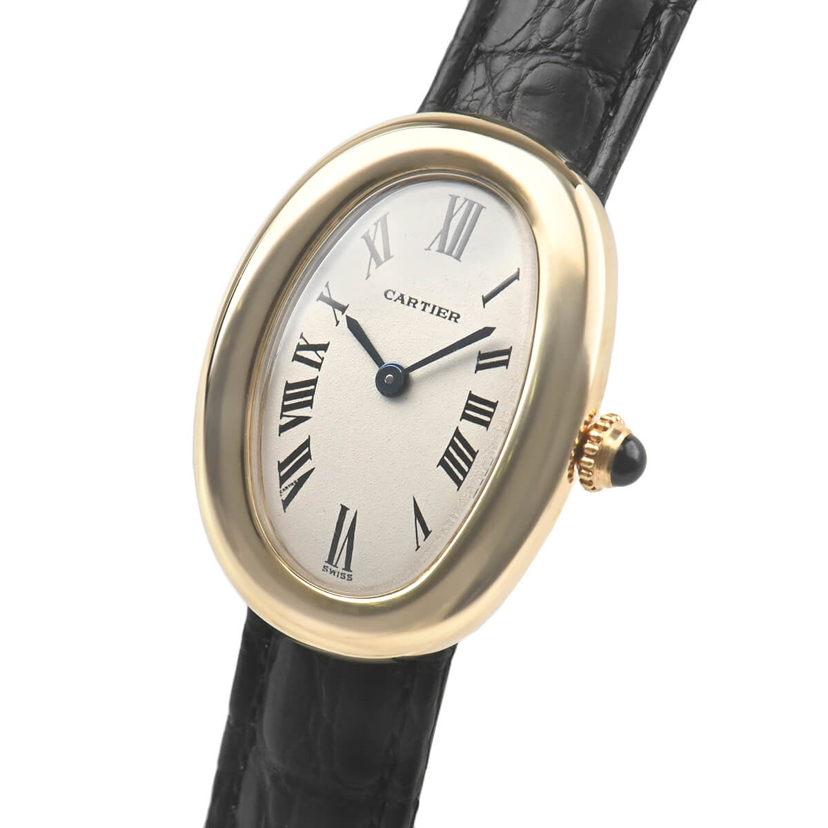 フランス語で「バスタブ」を意味するベニュワールの歴史は1906年にまで遡ります。ホワイト文字盤に描かれたローマインデックスと美しく焼かれたブルースチール針はカルティエならではの端正でありながら気品溢れるレディースウォッチです。