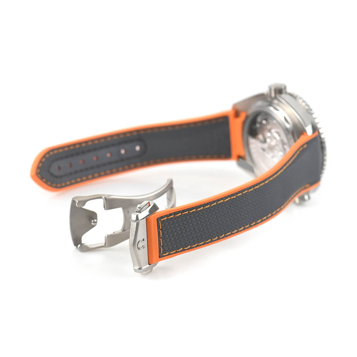 ベゼルプレートのグレーの部分はシリコンニトライドセラミック製でオレンジ部分はラバーを接合し、ダイビングスケールにはリキッドメタルを使用するなど非常に手の込んだ仕様となっています。