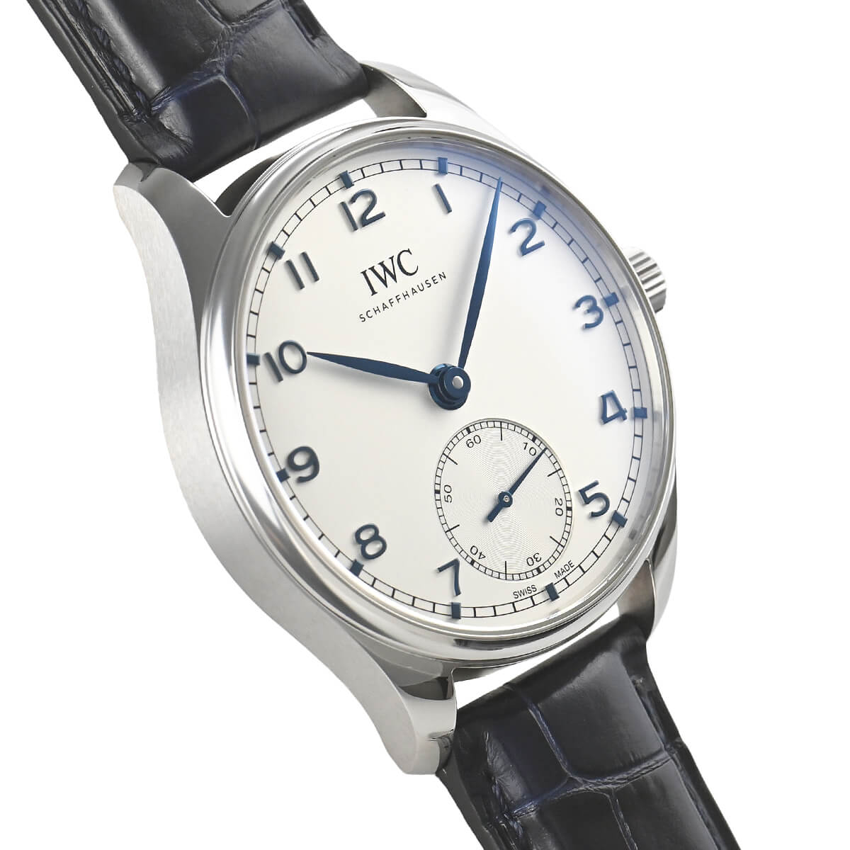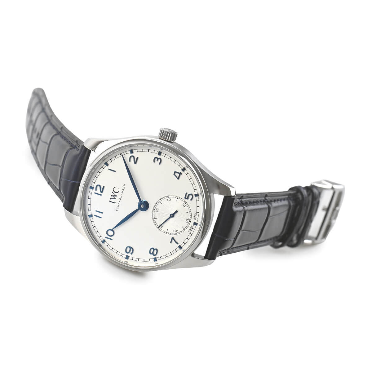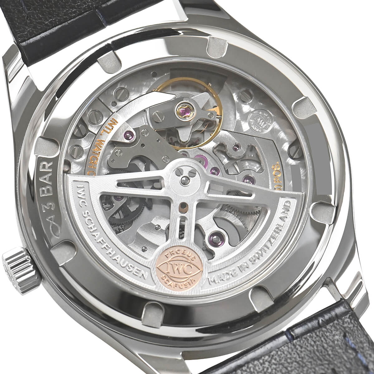 【ポルトギーゼ オートマティック40】は、耐摩耗性に優れたセラミックパーツをペラトン自動巻き機構に採用した60時間パワーリザーブの自社製自動巻きキャリバー82200を搭載。文字盤外周のレイルウェイ分目盛りと6時位置に配されたスモールセコンドは1930年代末に誕生したポルトギーゼコレクションの歴史の中で継承されてきたデザイン様式です。時分針とアプライドインデックスには綺麗なブルースチールを採用し、シンプルでありながらも機械式時計が持つ美しさが感じられる一本です。