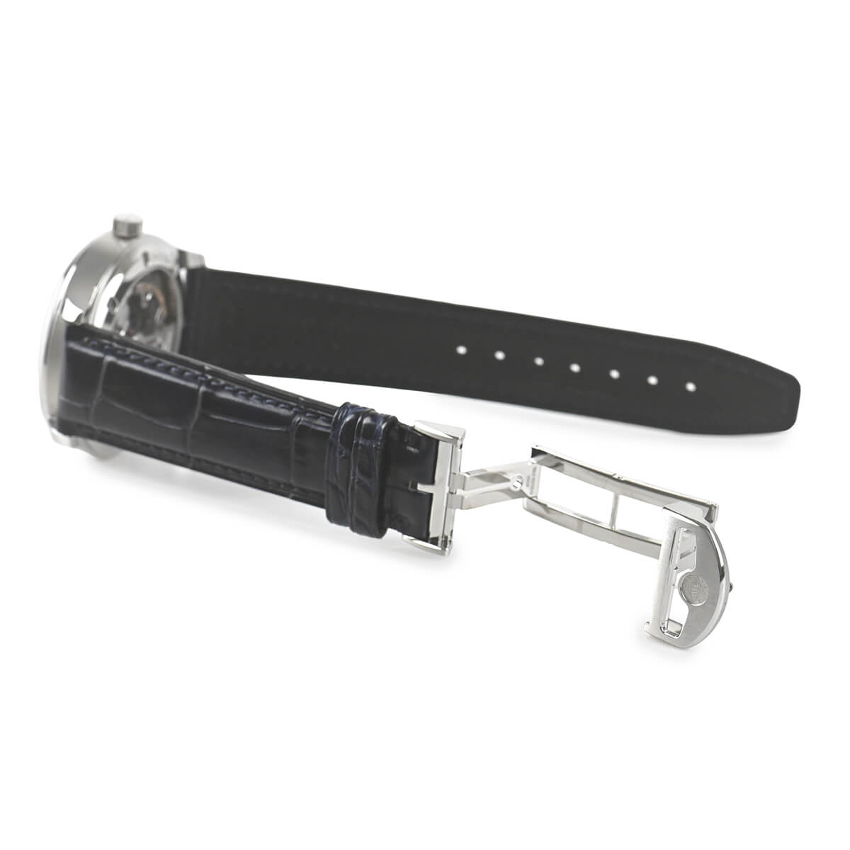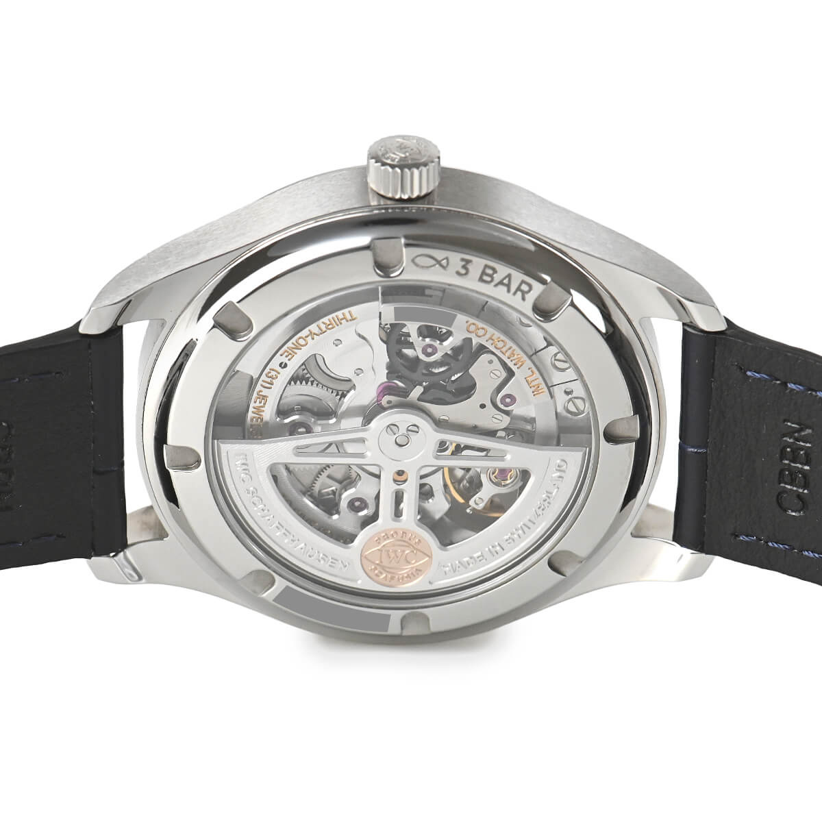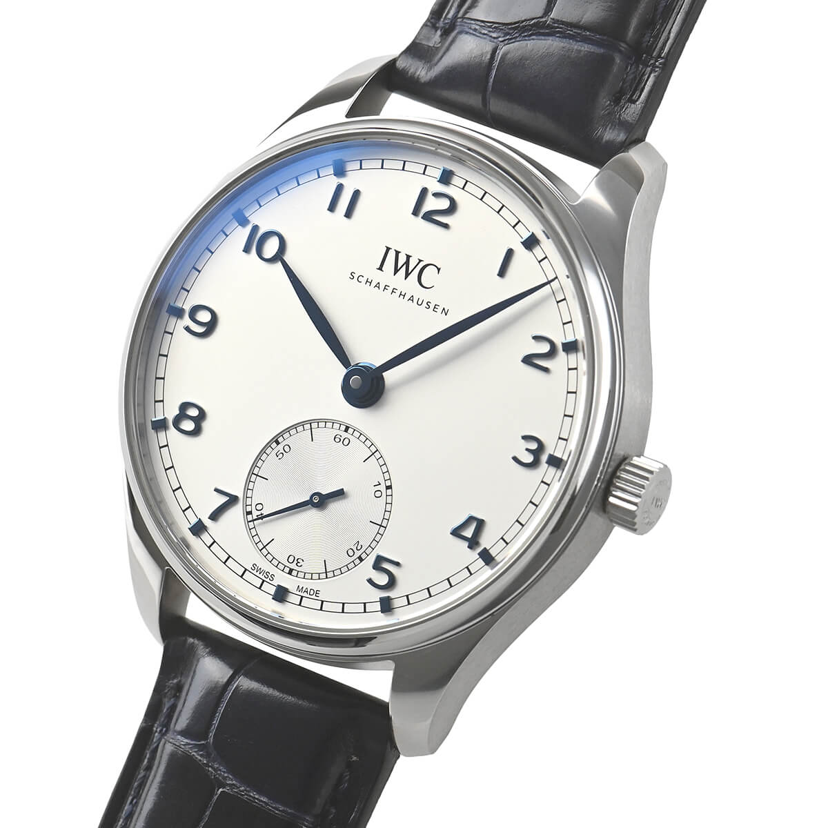 【ポルトギーゼ オートマティック40】は、耐摩耗性に優れたセラミックパーツをペラトン自動巻き機構に採用した60時間パワーリザーブの自社製自動巻きキャリバー82200を搭載。文字盤外周のレイルウェイ分目盛りと6時位置に配されたスモールセコンドは1930年代末に誕生したポルトギーゼコレクションの歴史の中で継承されてきたデザイン様式です。時分針とアプライドインデックスには綺麗なブルースチールを採用し、シンプルでありながらも機械式時計が持つ美しさが感じられる一本です。
