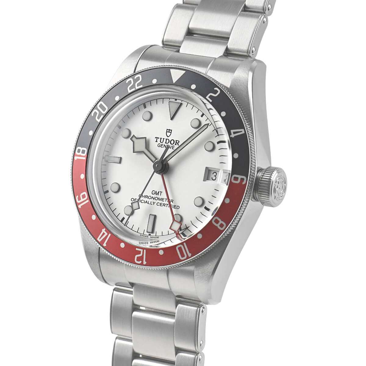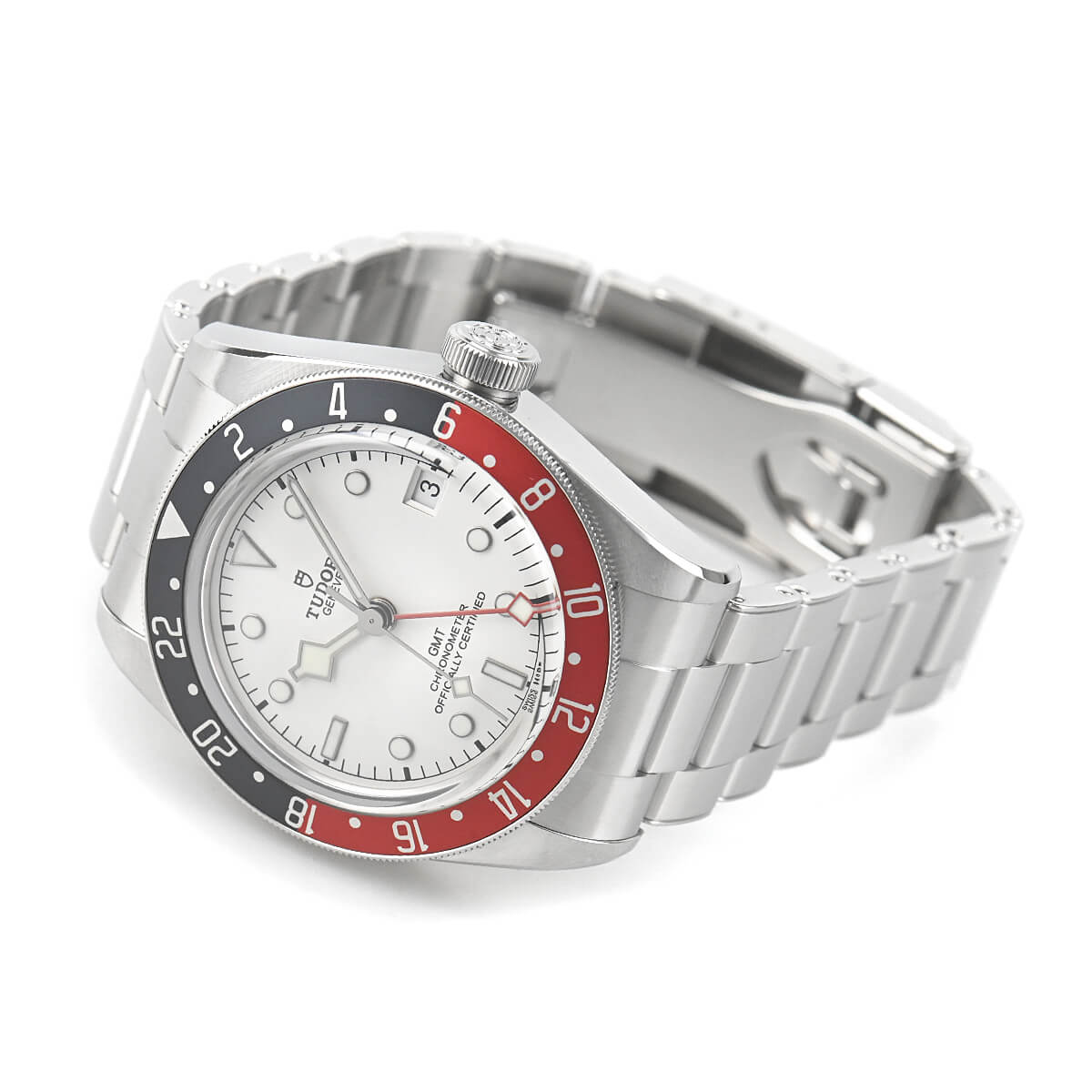 時針だけでなく、赤いGMT針と秒針までもがイカ針となった遊び心のあるデザインを採用します。