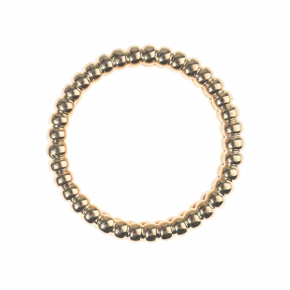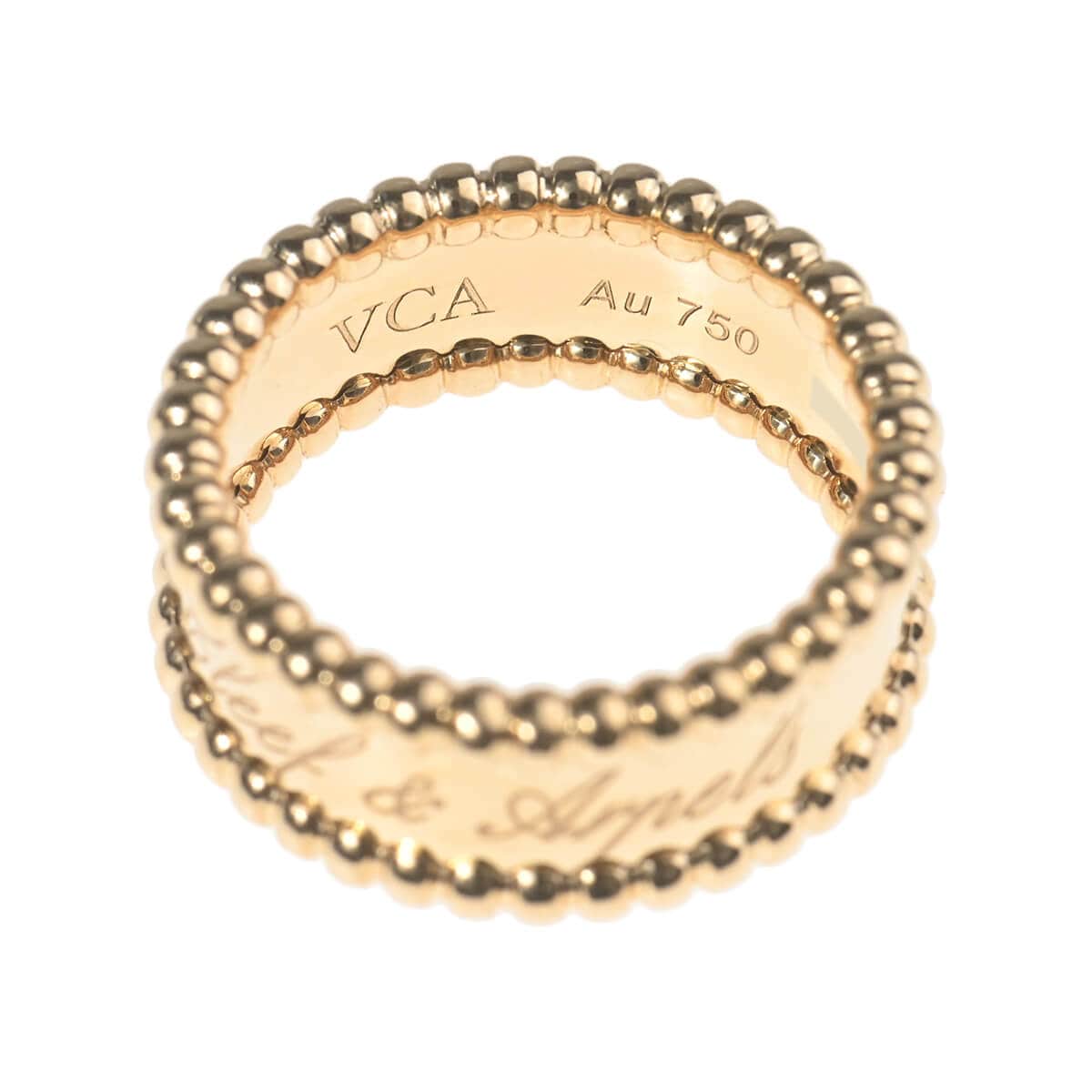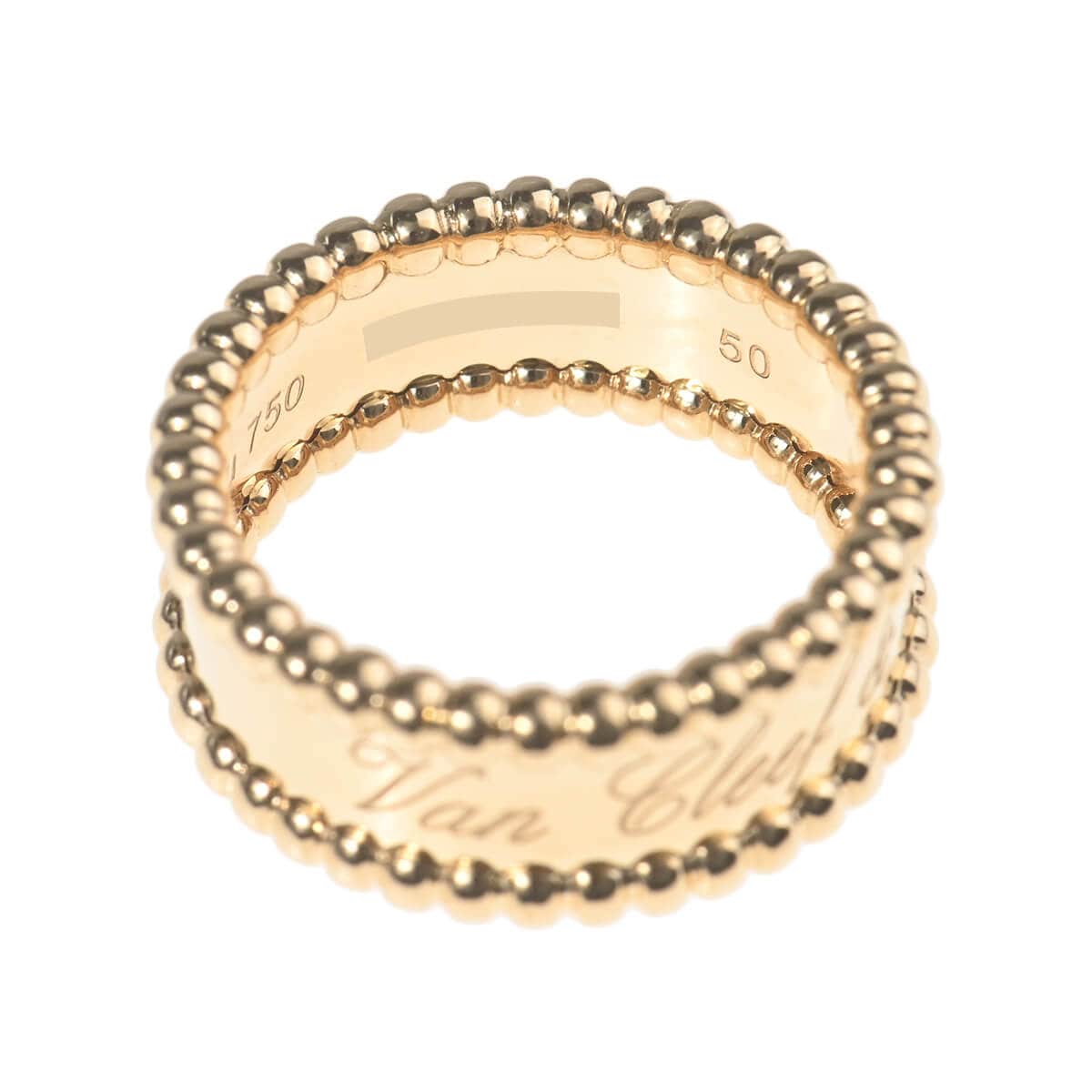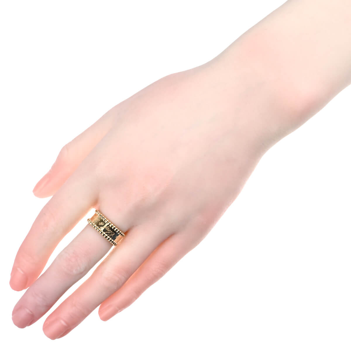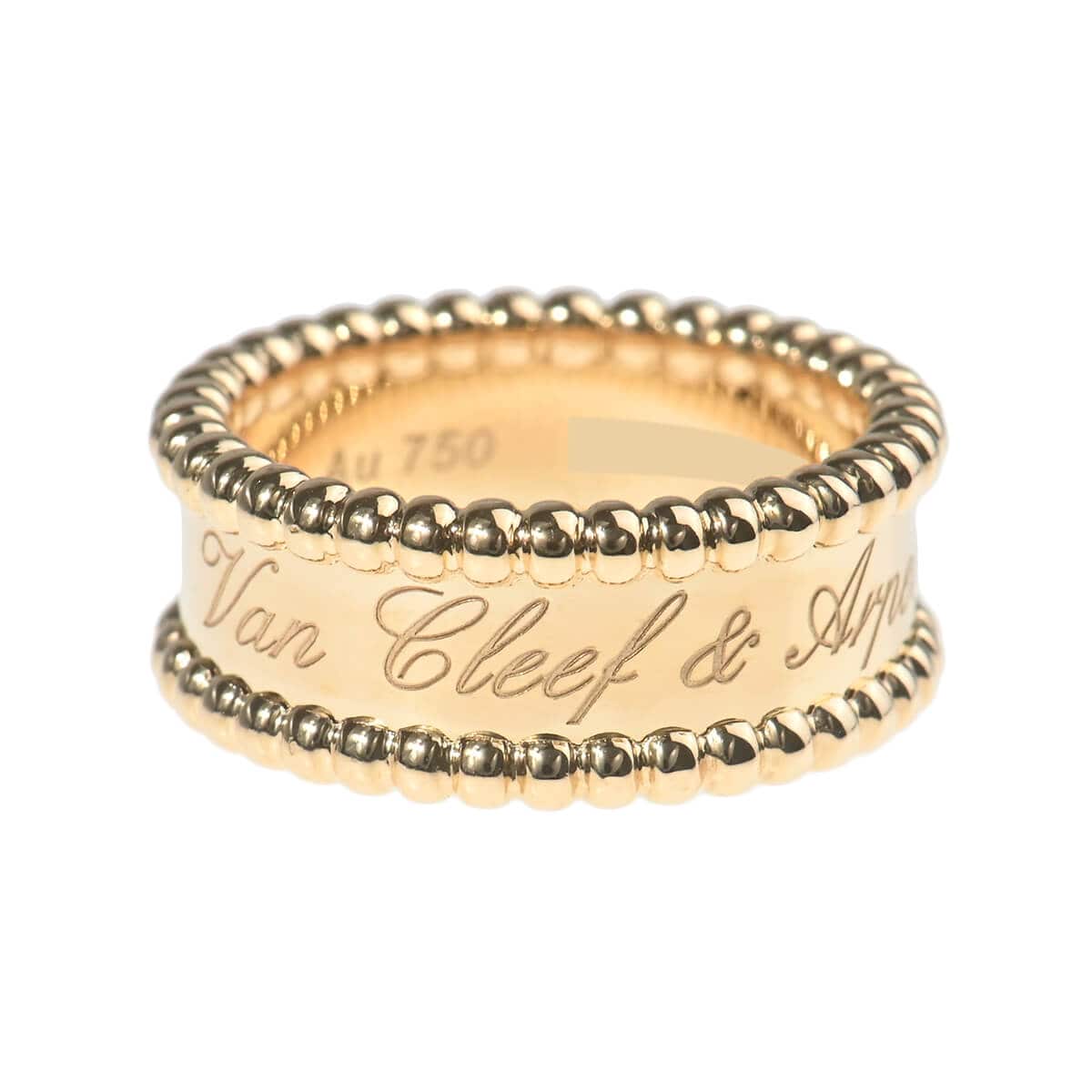 言わずと知れたパリの老舗ハイジュエリーメゾン『VanCleef&Arpels(ヴァンクリーフ&アーペル)』を象徴する数々のコレクションでも重要な装飾として受け継がれてきた、ゴールドビーズを主役にした「ペルレ」コレクション。ゴールドの素材選定はもちろんのこと、なめらかな丸みを帯びたフォルムに整える研磨の工程など、複雑にして正確性を求められるデザインに卓越した職人技術の真骨頂を感じさせる、繊細でありながら華やかなコレクションです。フランス語で真珠を意味するコレクションの名の通り、美しいフォルムの艶やかな丸いビーズの連なりで縁取られた、「ペルレ シニアチュール」のイエローゴールド製リング。艶やかに磨かれたゴールドに、アラベスク模様のような“VanCleef&Arpels”のカリグラフィロゴが刻印されています。指先にモダンで洗練された印象を添える、人気メゾンの定番コレクションジュエリーです。