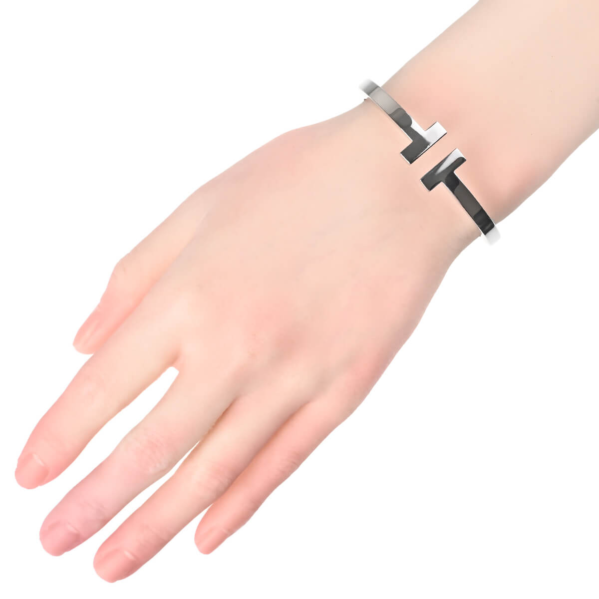 グラフィックなアングルとすっきりとクリーンなラインが溶けあって、美しい個性となっている「ティファニーT」コレクション。美しくグラフィカルな『TIFFANY&Co.(ティファニー)』の“T”は、都会的なニューヨークを体現しているかのような洗練されたセンスと、大胆さをあわせもつデザインがジェンダー問わず人気のコレクションです。磨き込まれたホワイトゴールドの先端に、『TIFFANY&Co.(ティファニー)』の“T”を大胆に捉えたグラフィカルなモチーフが美しく映える、クリーンなフォルムが印象的な、「Tスクエア」ホワイトゴールド製ブレスレット。洗練をまとった大胆なこのブレスレットは、ミックスメタルのブレスレットと組み合わせると、モダンなルックを楽しめます。