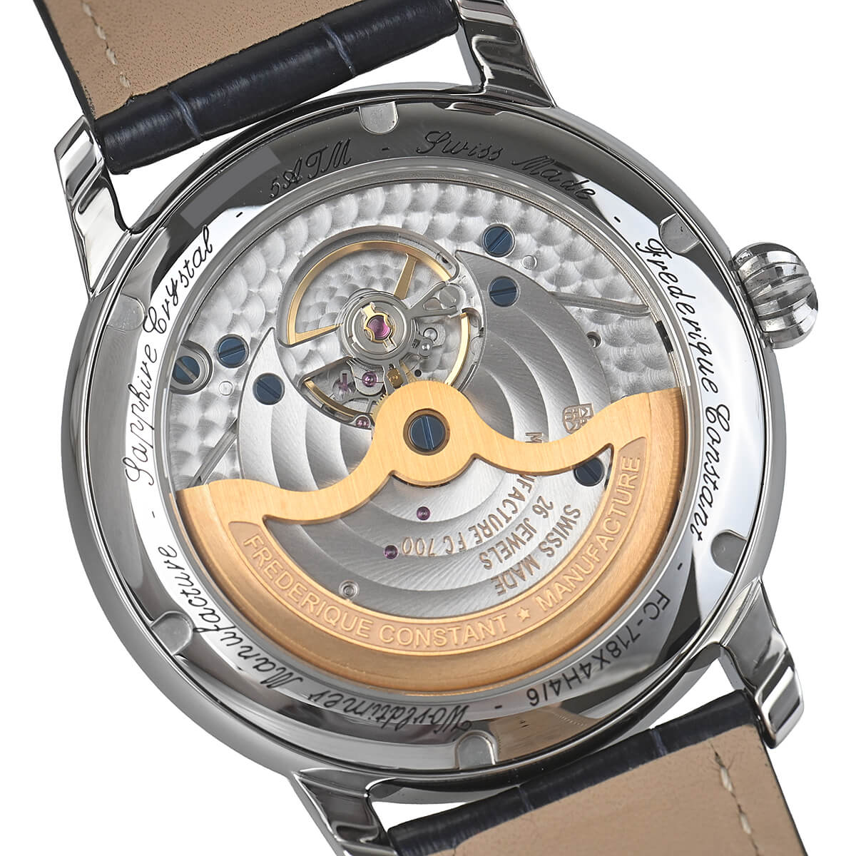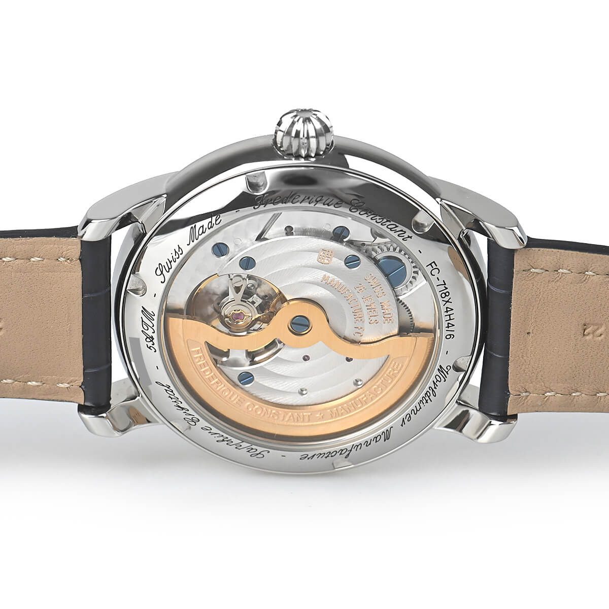 その美しいデザインと世界主要24都市の時刻を同時に読み取れる機能性で人気の「ワールドタイマー マニュファクチュール」。裏蓋はシースルーバックになっており、自社製自動巻きムーブメント「FC-718」の動きを楽しめます。