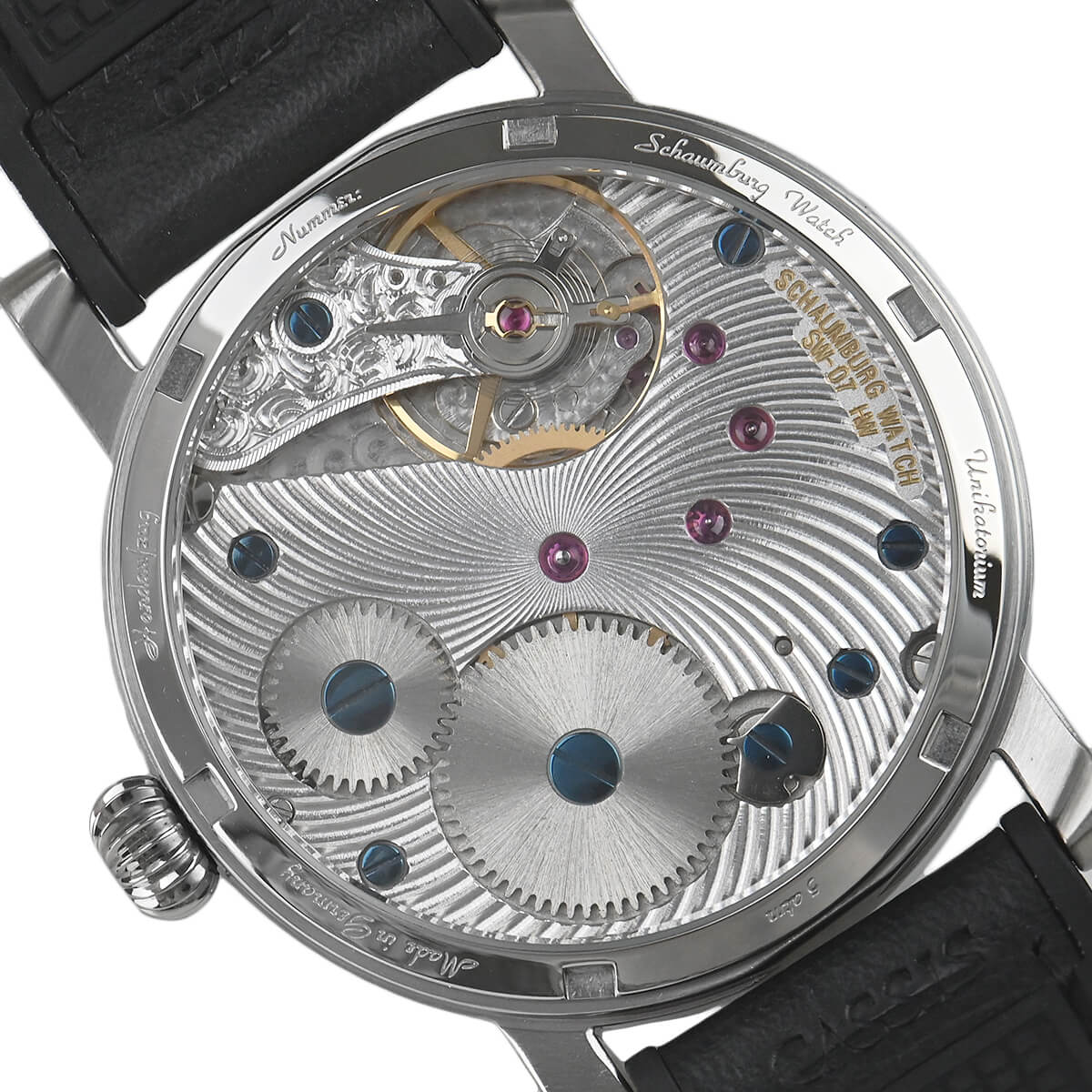 ケースはシースルーバックになっており、手巻きムーブメントの動きを楽しめます。