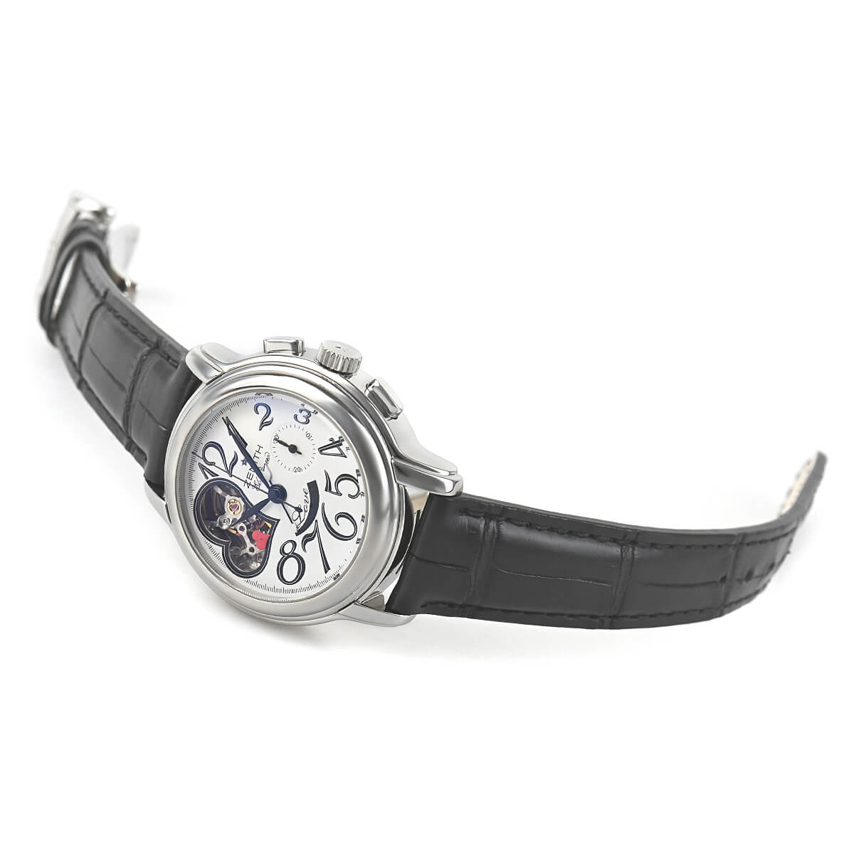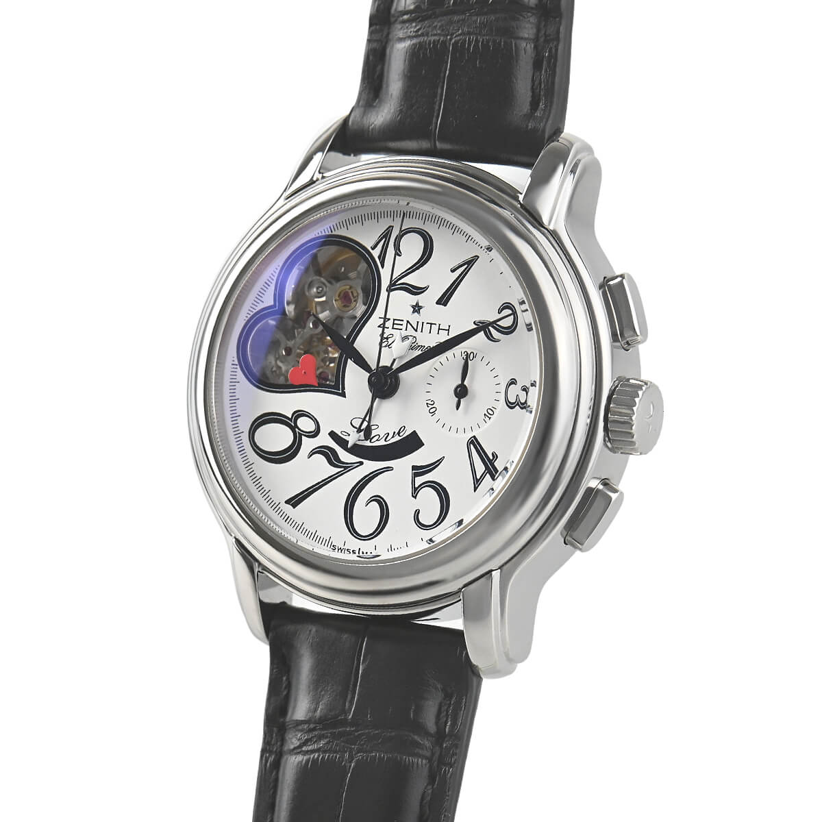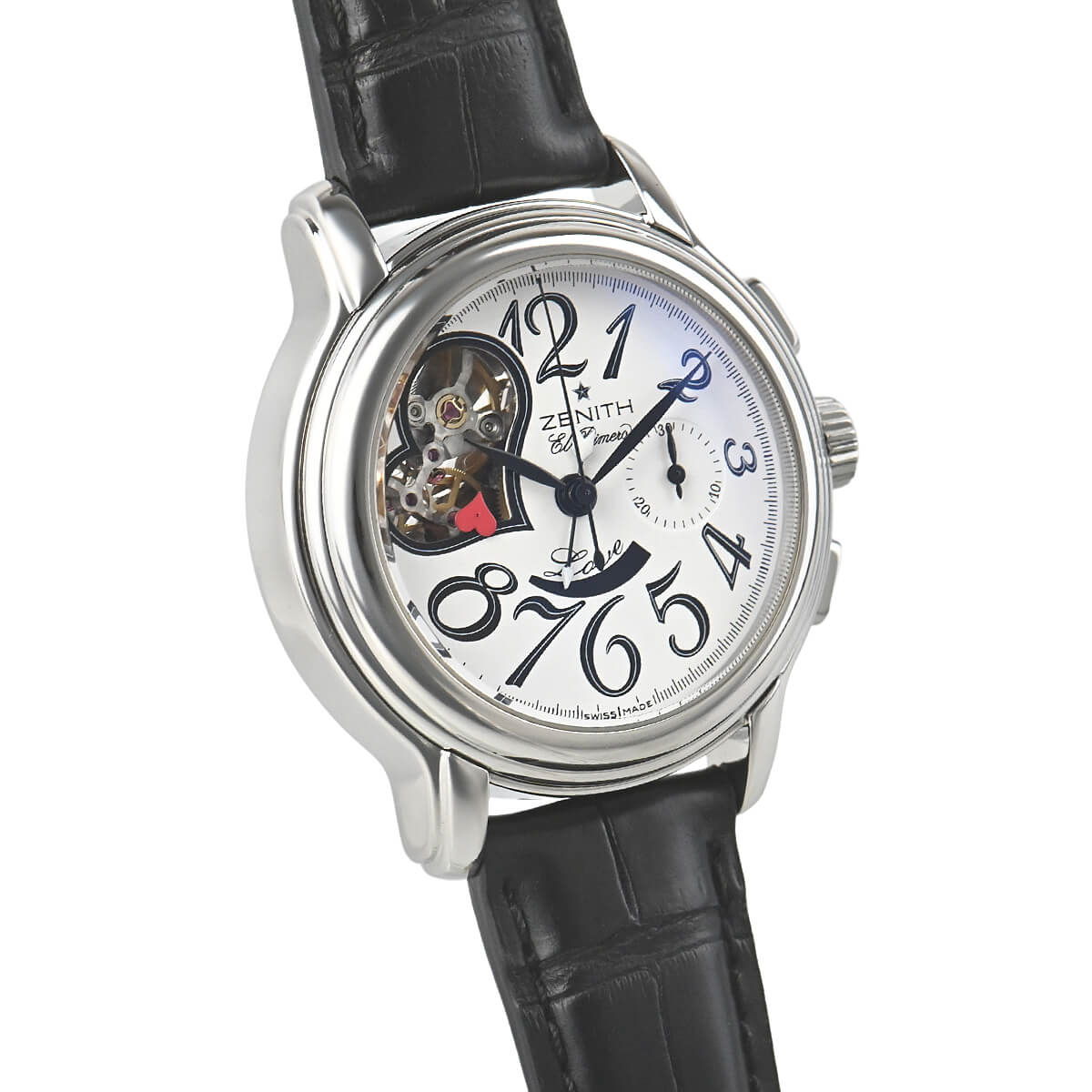 近年のレディースモデルはクォーツ時計がほとんどですが、このモデルは機械式時計が得意なゼニスによる機械式クロノグラフです。ハートにくり抜かれたダイヤルからは、機械式時計の心臓部といえるテンプを見ることが出来るようになっています。