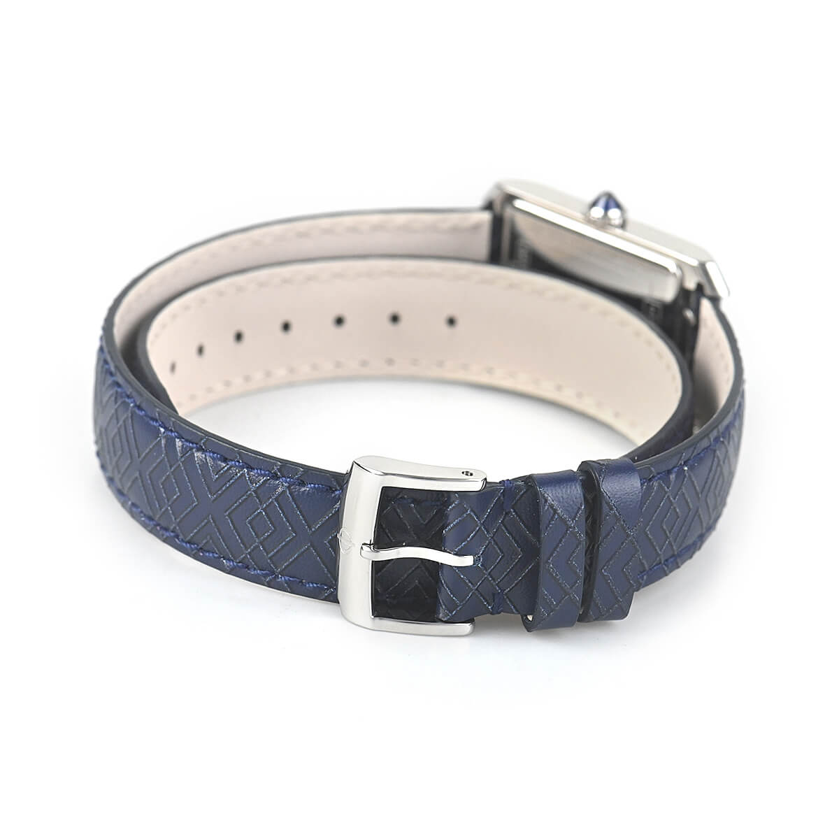 純正のブルー二重巻きカーフスキンには特別なアールデコ装飾が施されています。
